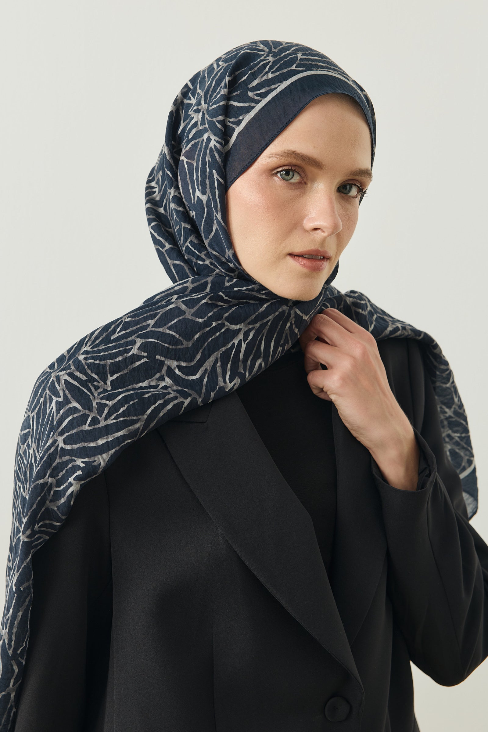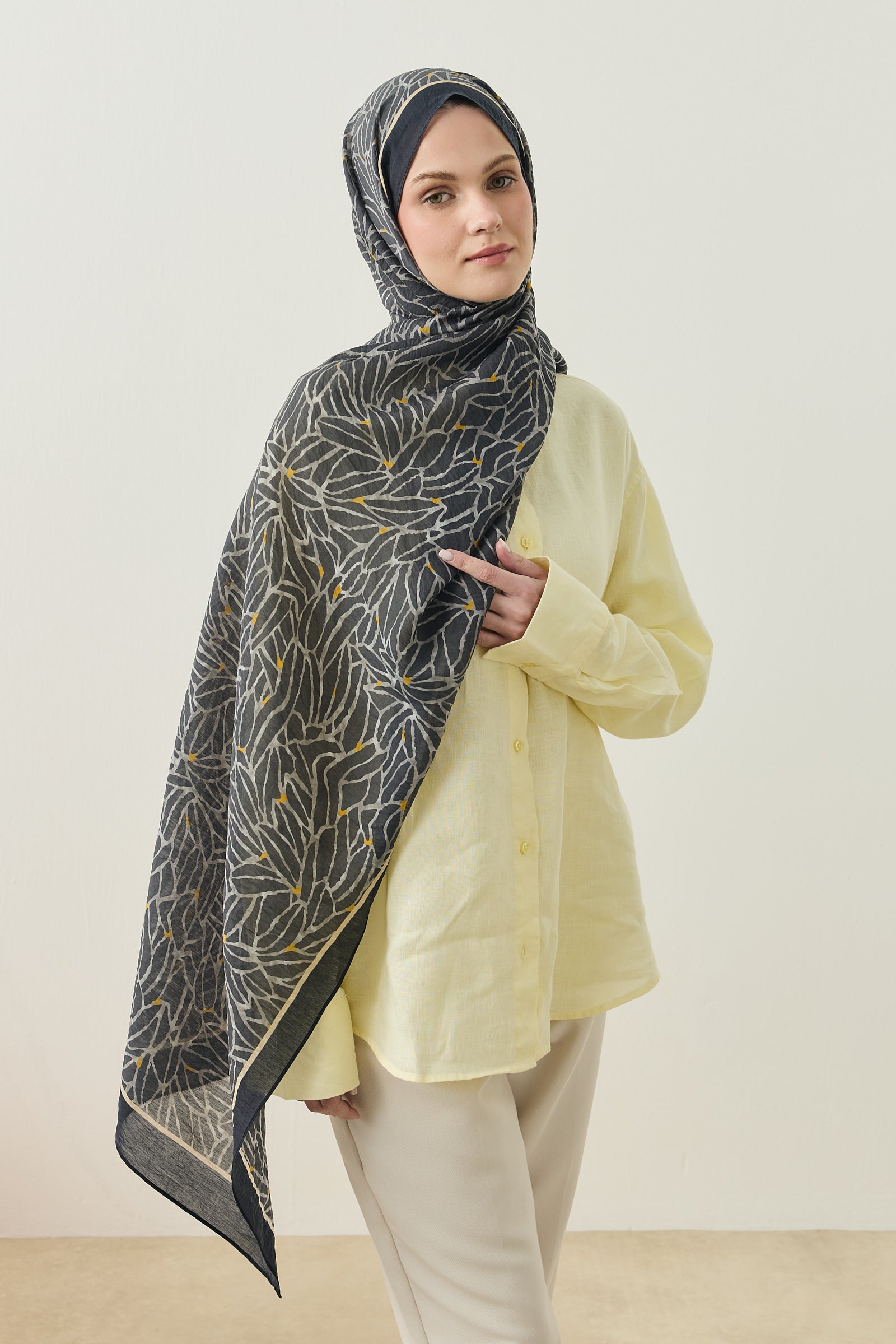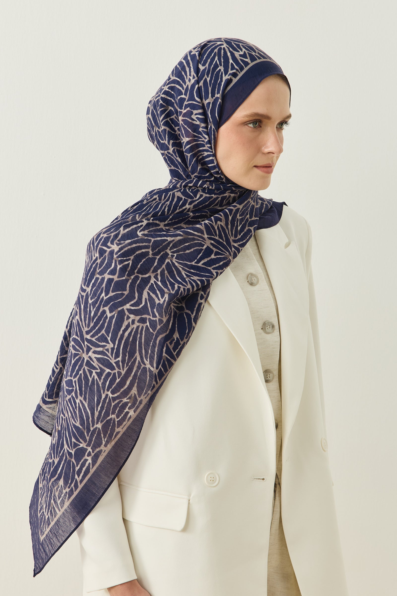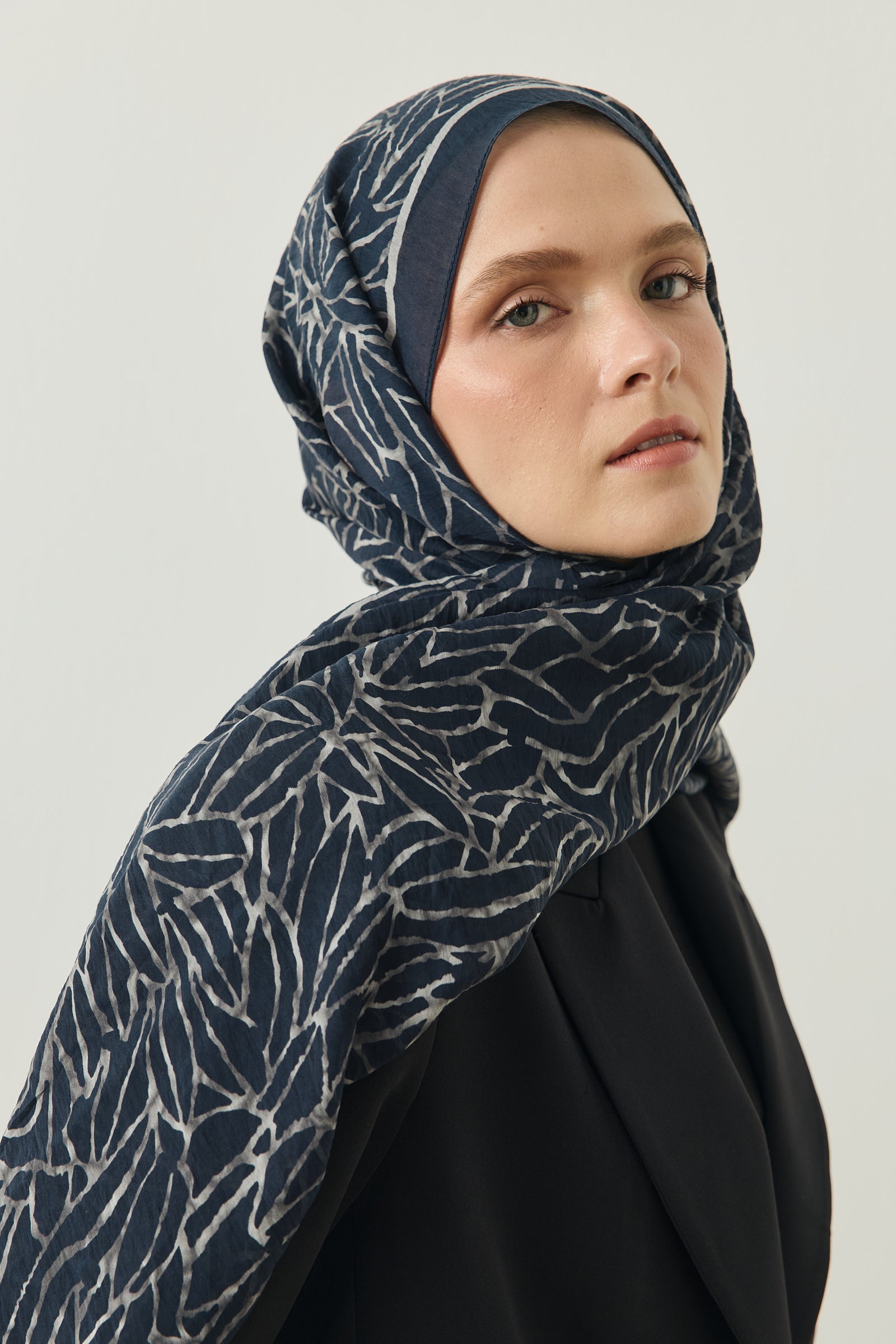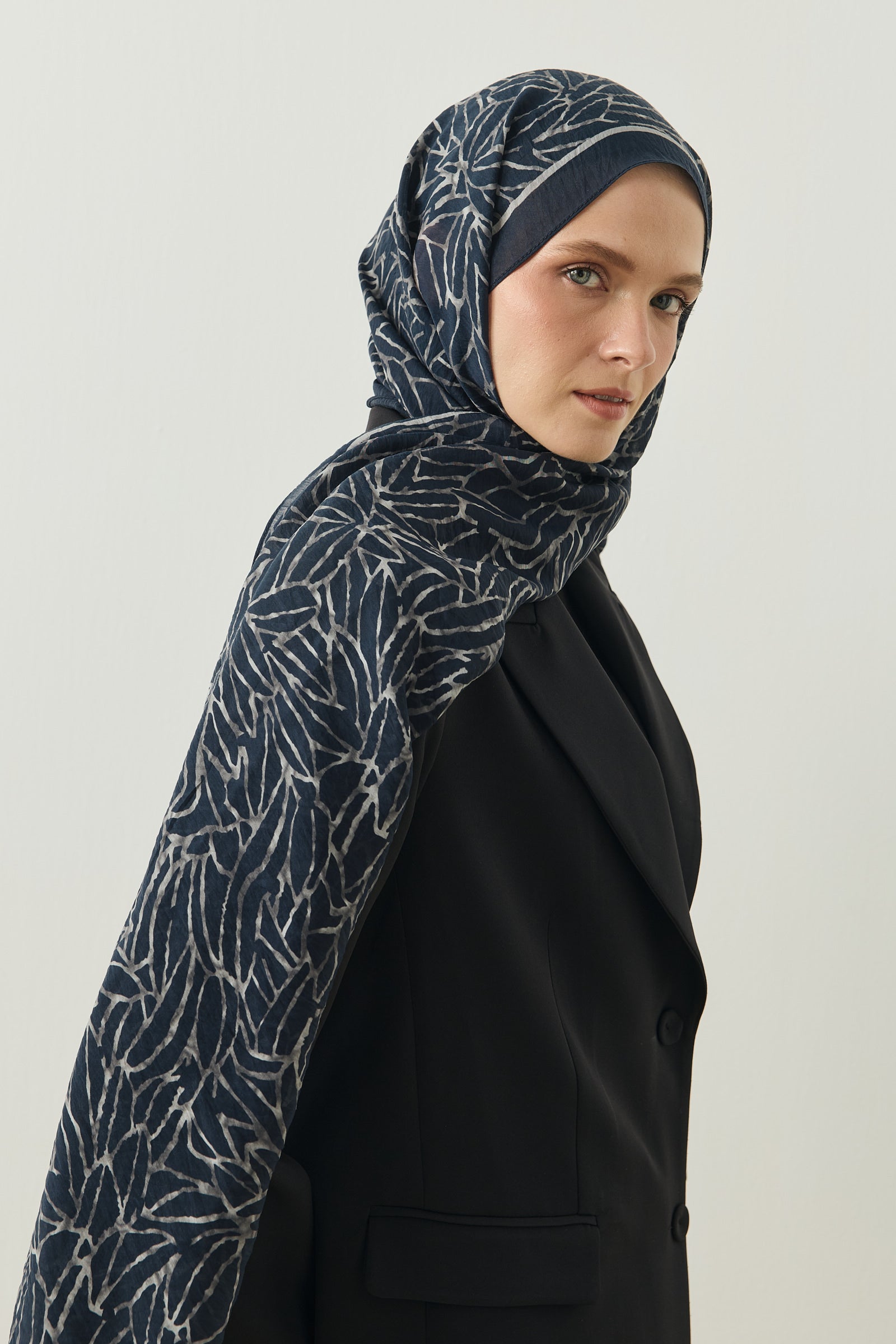 Tenline Alvor Desen Şal Koleksiyonu, modern çizgisel yaprak formları ve dinamik desen akışıyla öne çıkan özgün tasarımlardan oluşur. İnce ve keskin hatlarla oluşturulan desen yapısı, şallara hareketli ve enerjik bir görünüm kazandırırken sade kombinlere güçlü bir stil dokunuşu sunar.