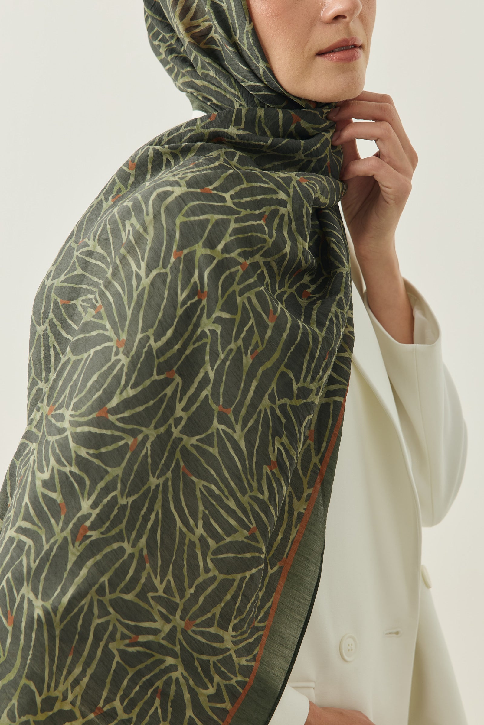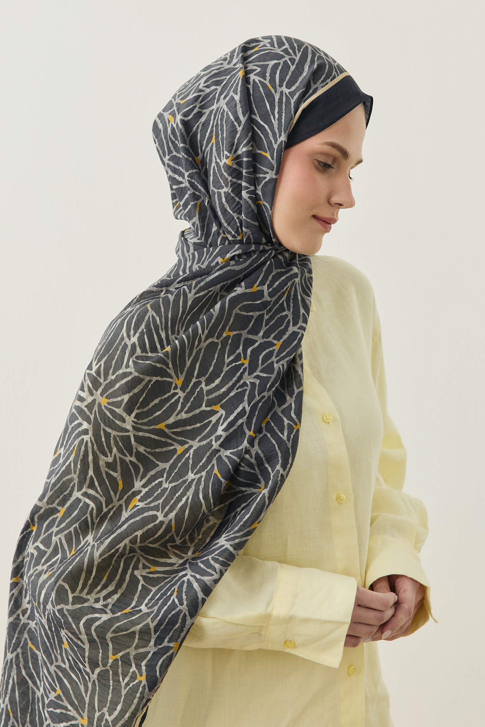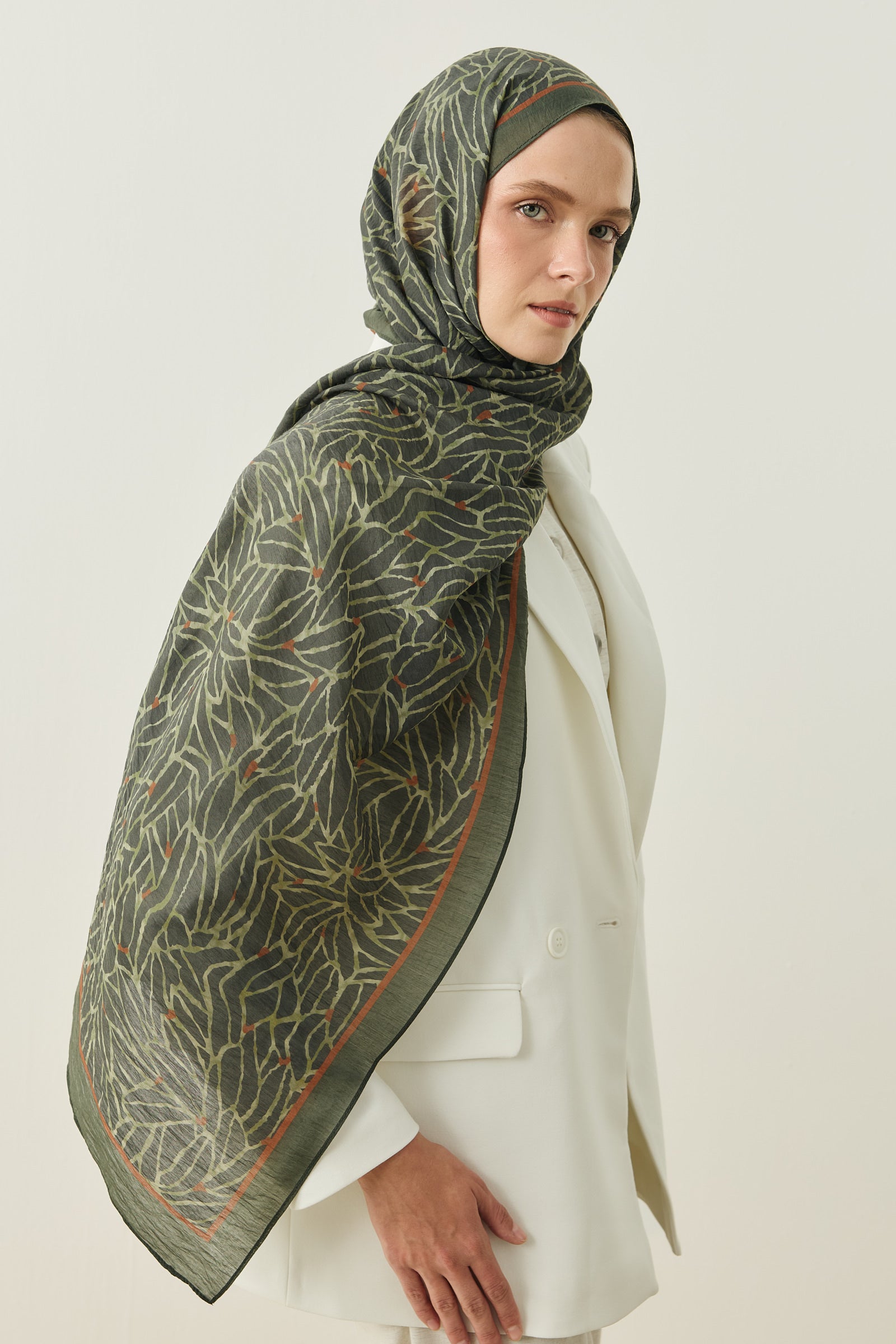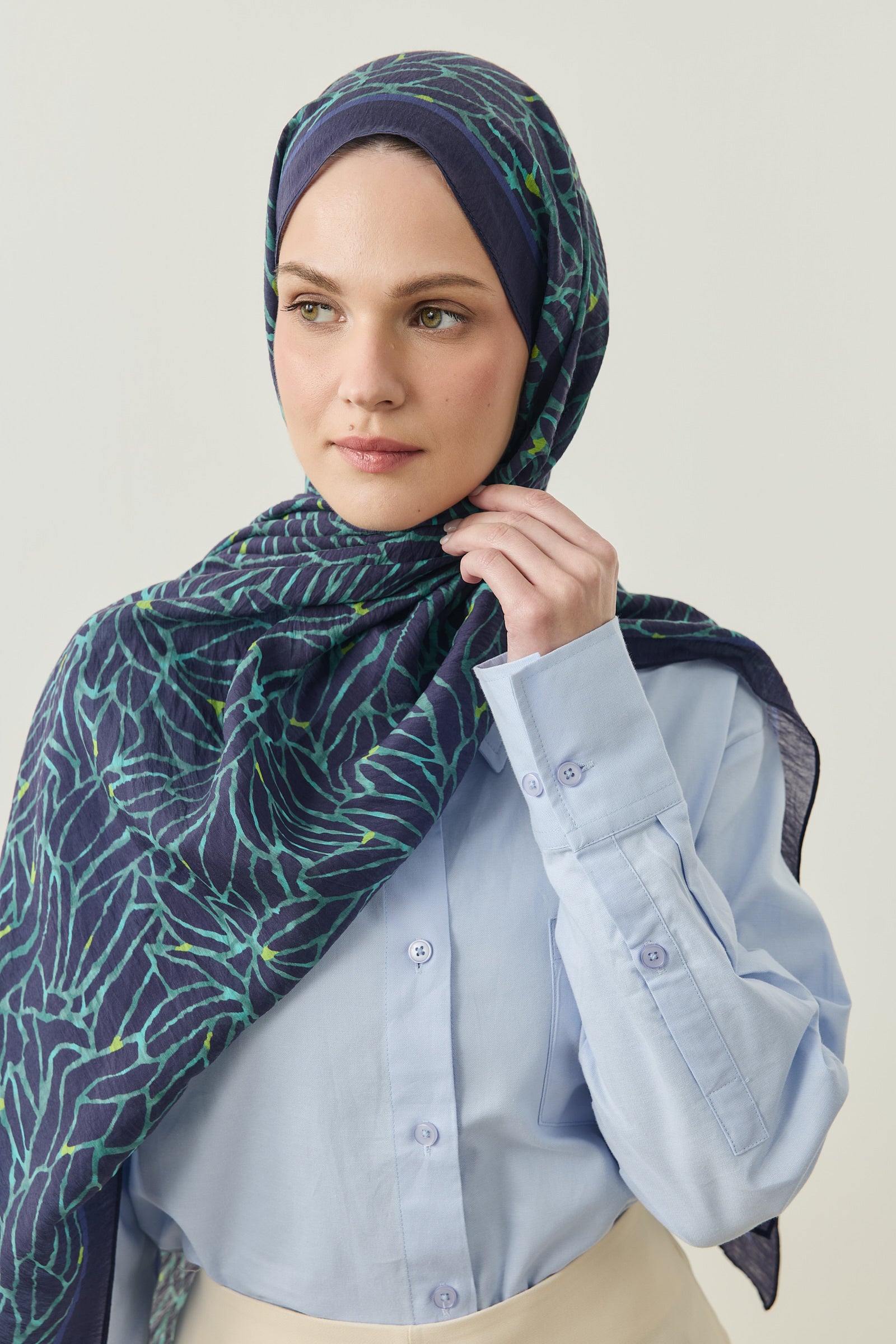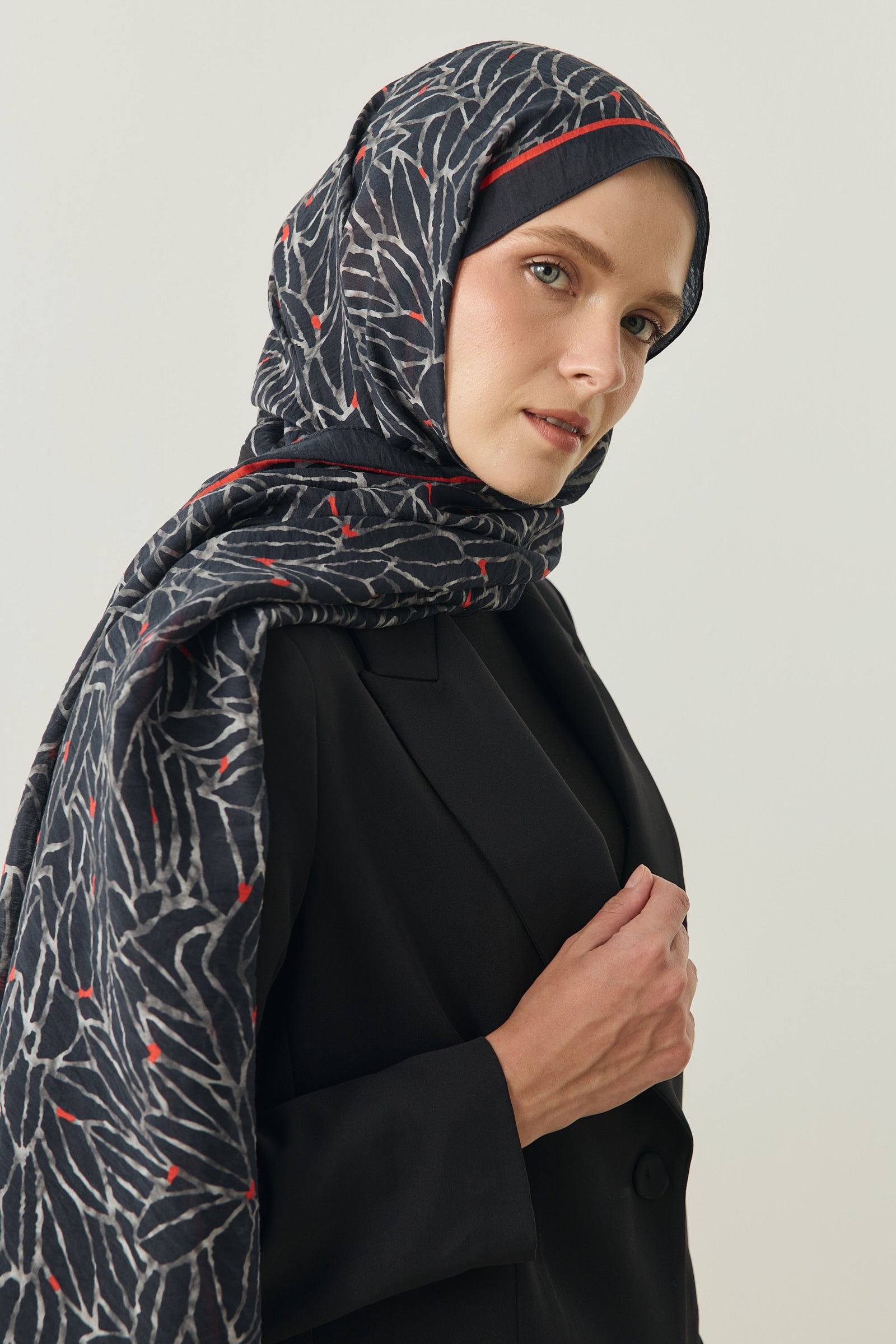 Tenline Alvor Desen Şal Koleksiyonu, modern çizgisel yaprak formları ve dinamik desen akışıyla öne çıkan özgün tasarımlardan oluşur. İnce ve keskin hatlarla oluşturulan desen yapısı, şallara hareketli ve enerjik bir görünüm kazandırırken sade kombinlere güçlü bir stil dokunuşu sunar.