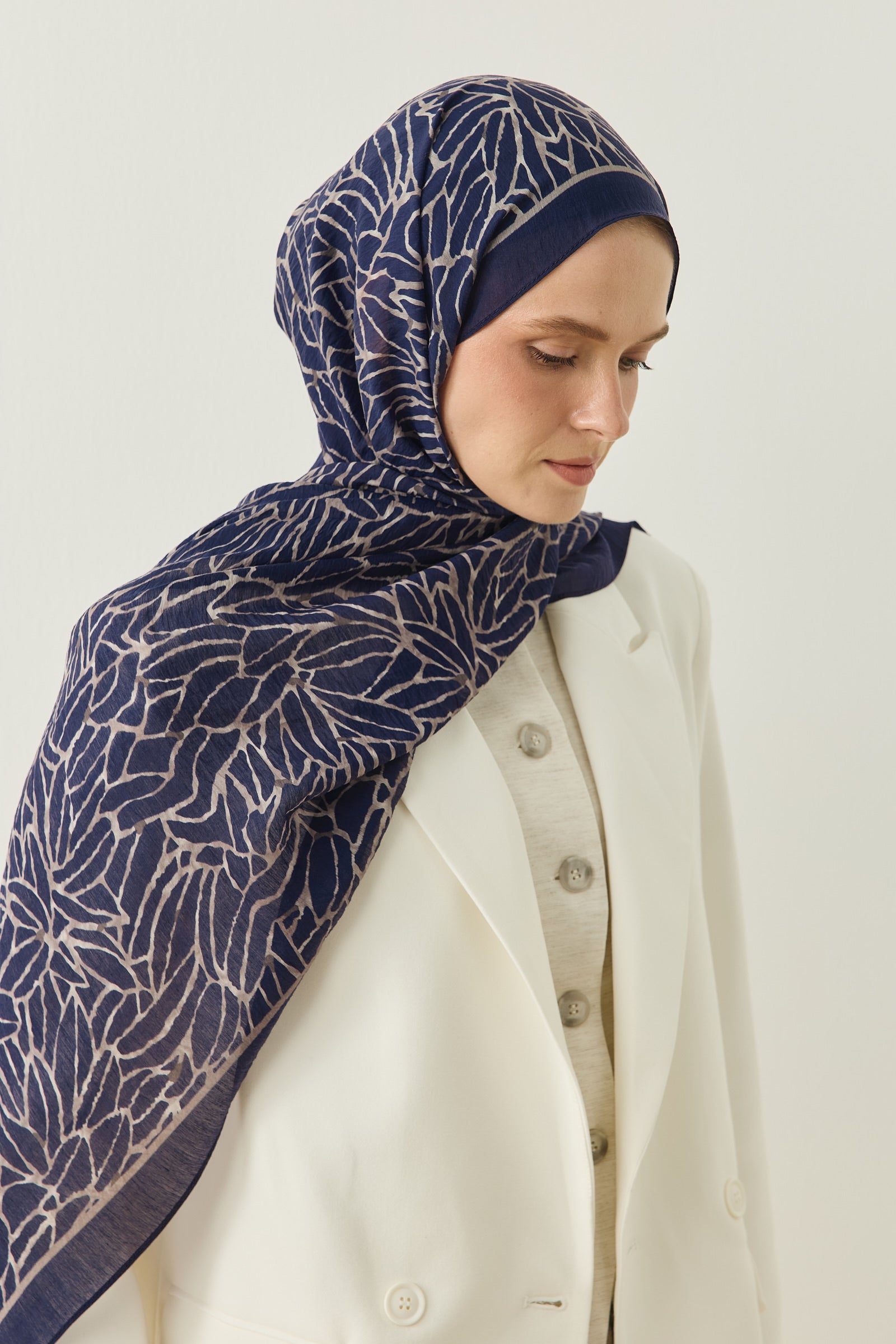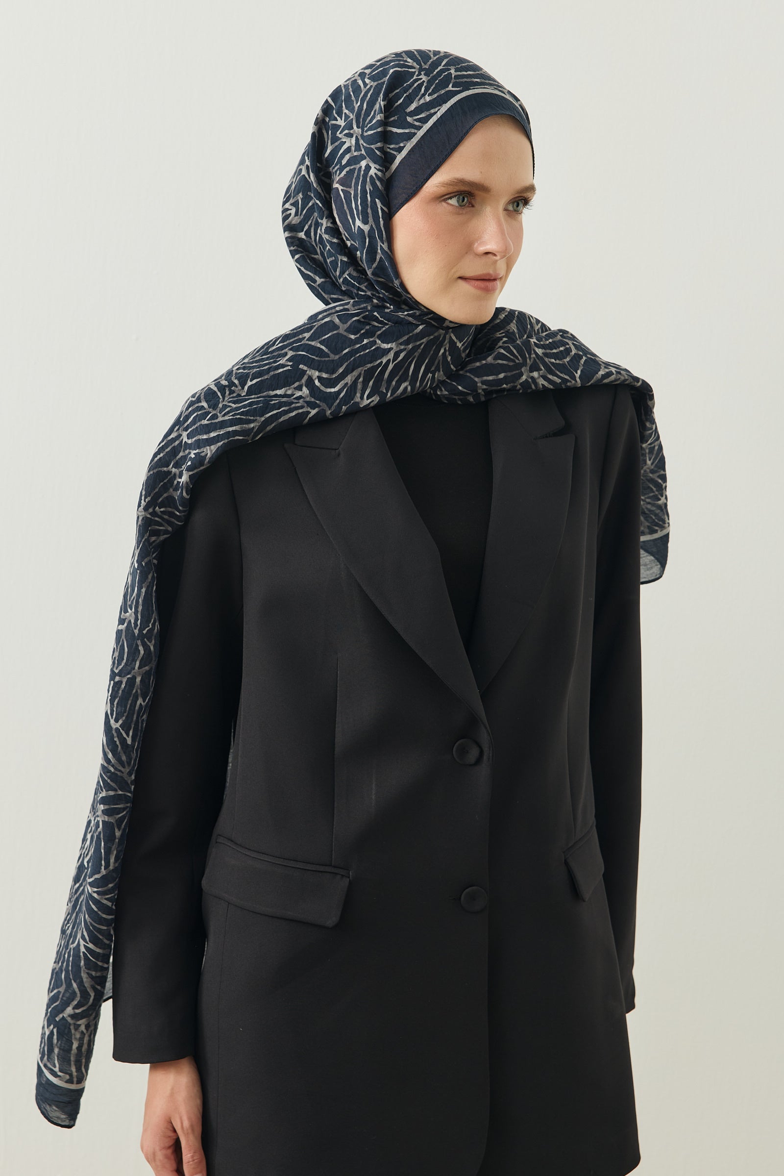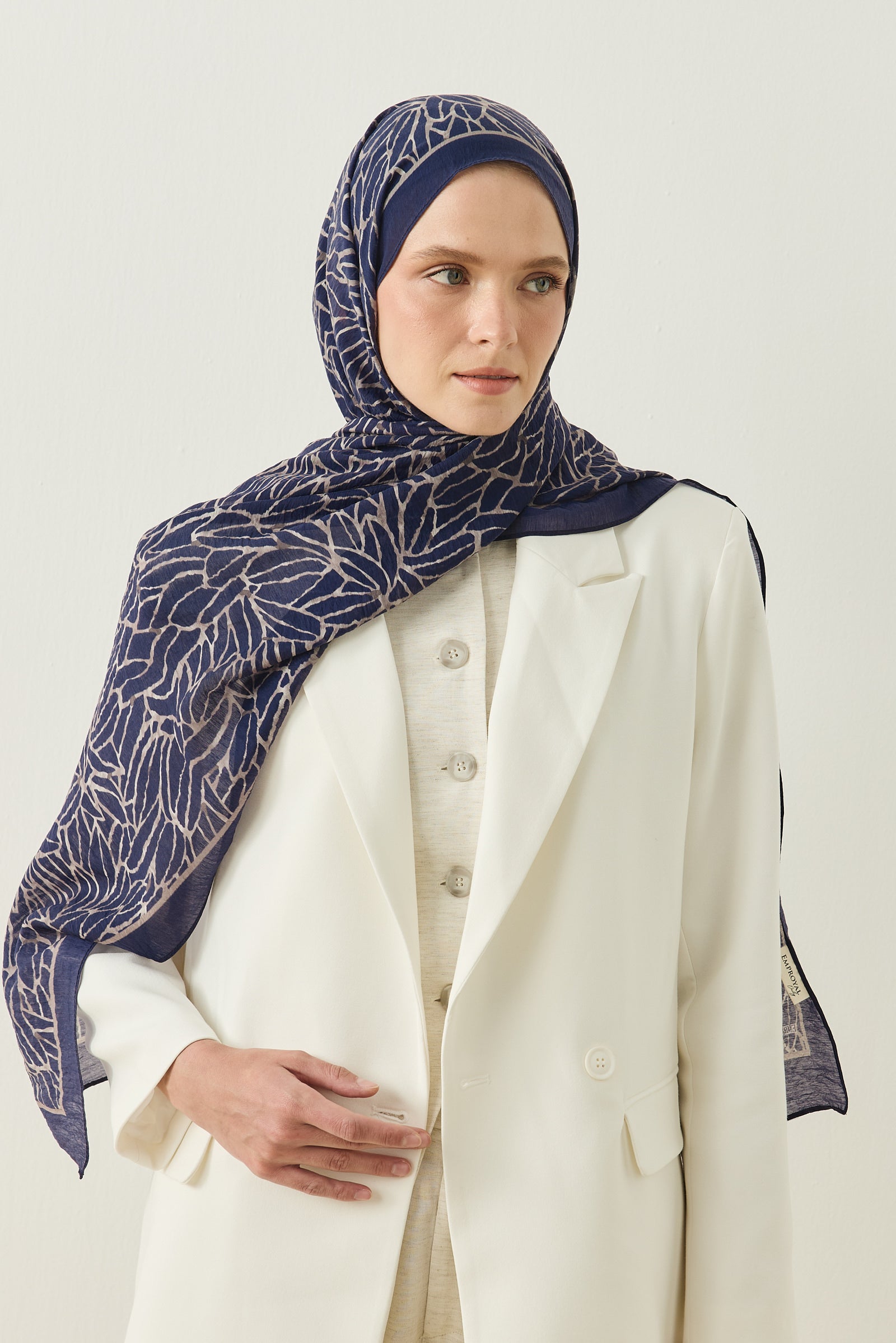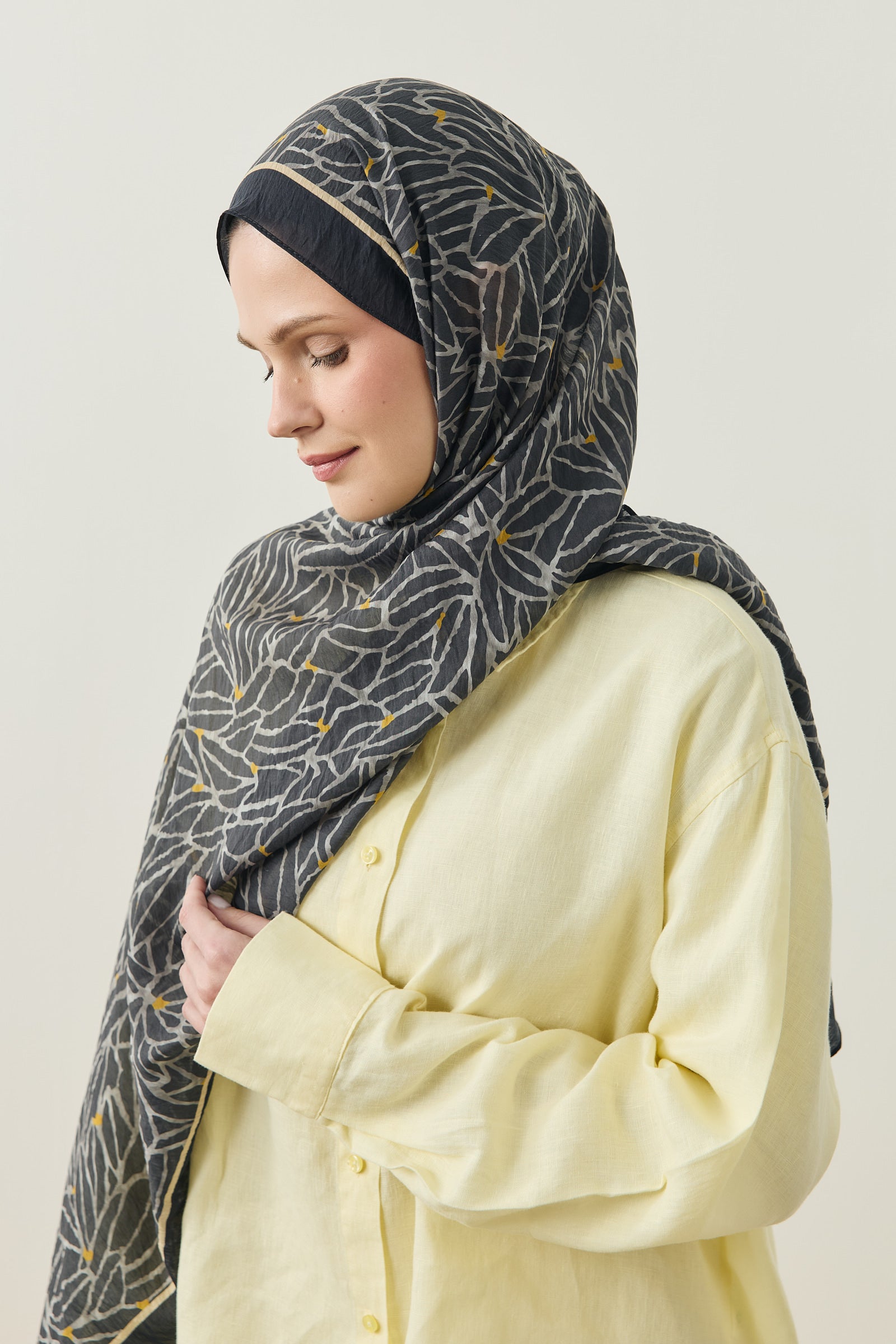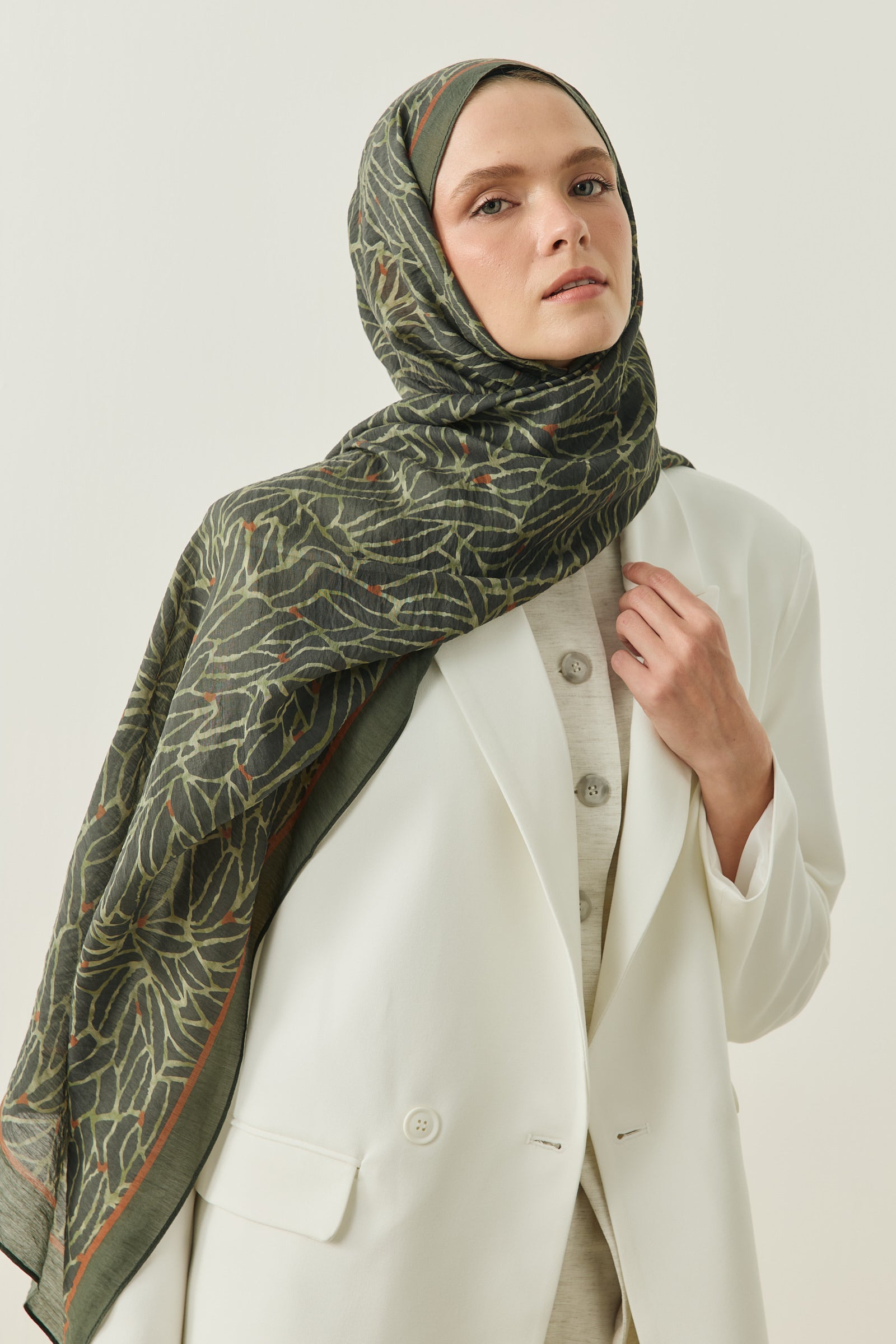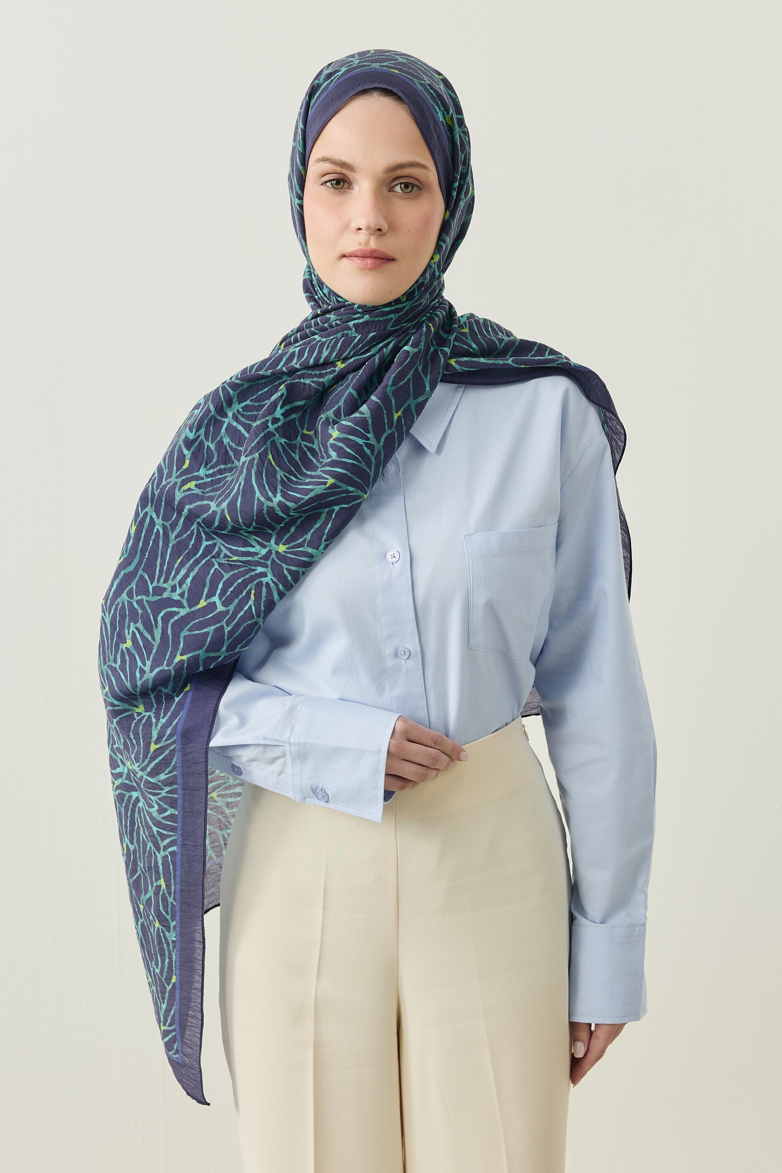 Tenline Alvor Desen Şal Koleksiyonu, modern çizgisel yaprak formları ve dinamik desen akışıyla öne çıkan özgün tasarımlardan oluşur. İnce ve keskin hatlarla oluşturulan desen yapısı, şallara hareketli ve enerjik bir görünüm kazandırırken sade kombinlere güçlü bir stil dokunuşu sunar.