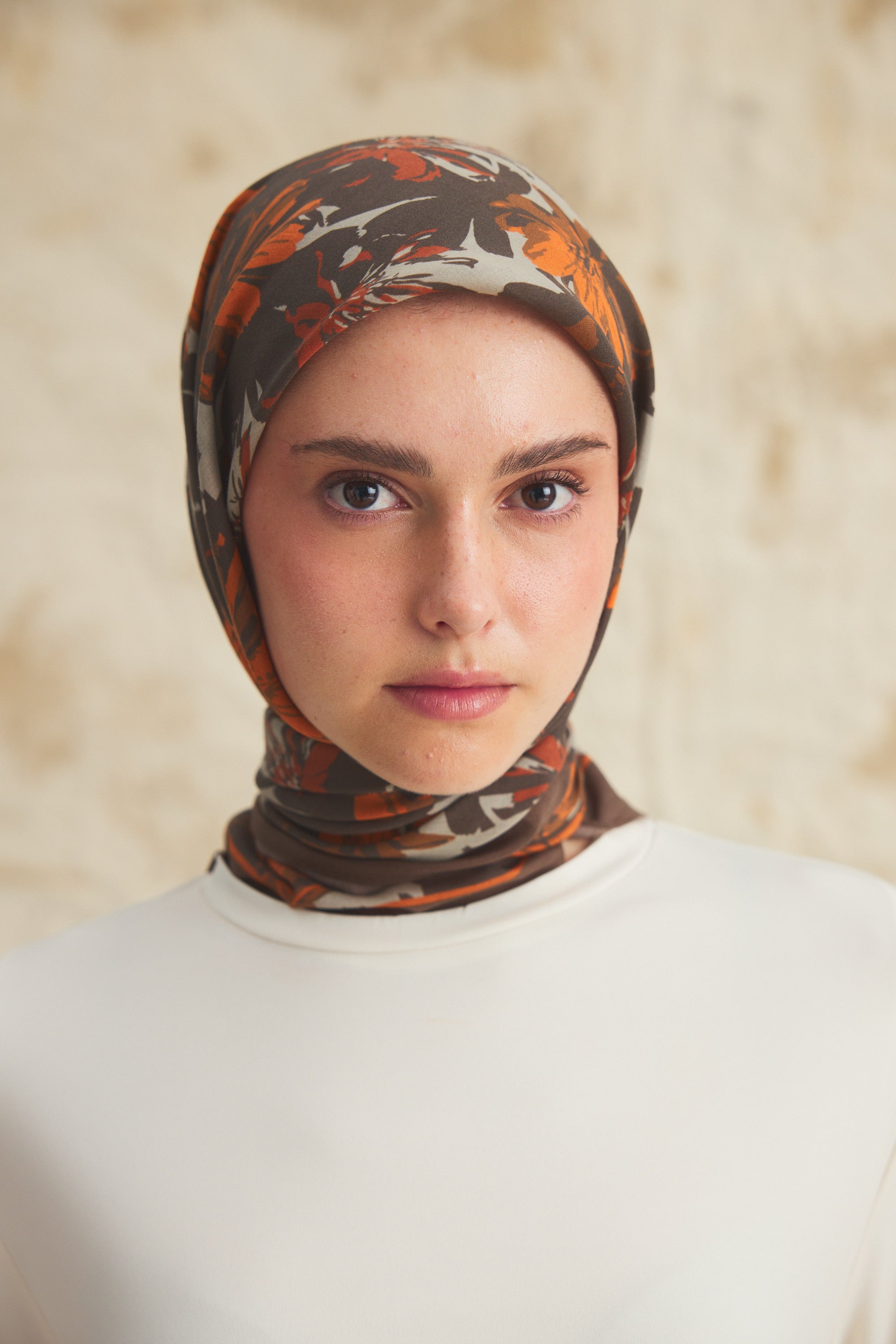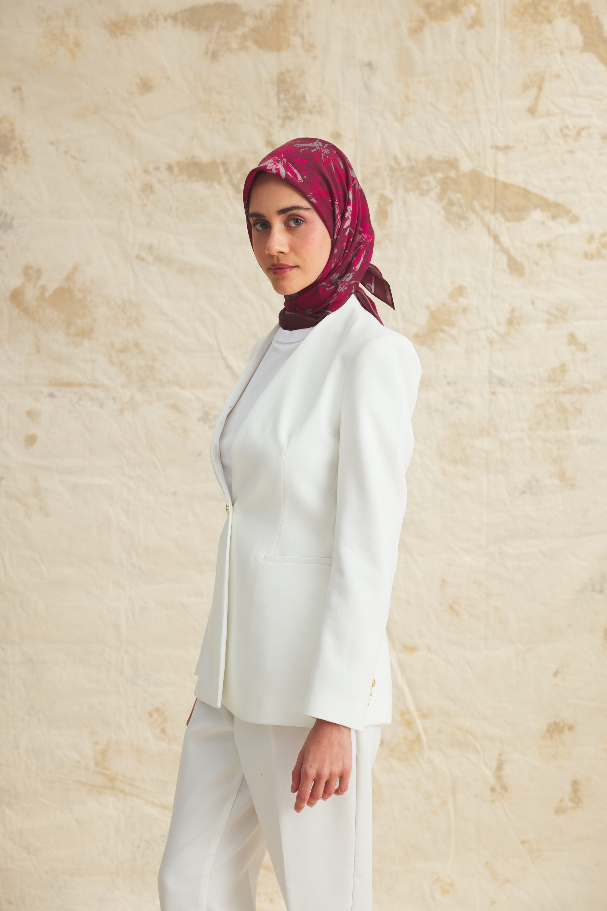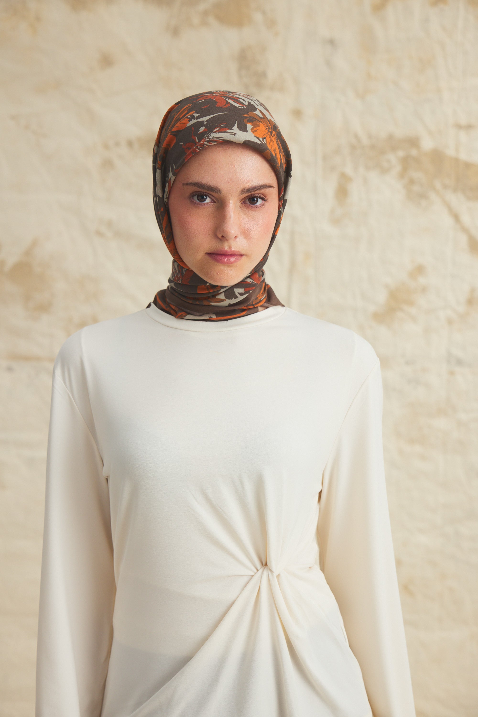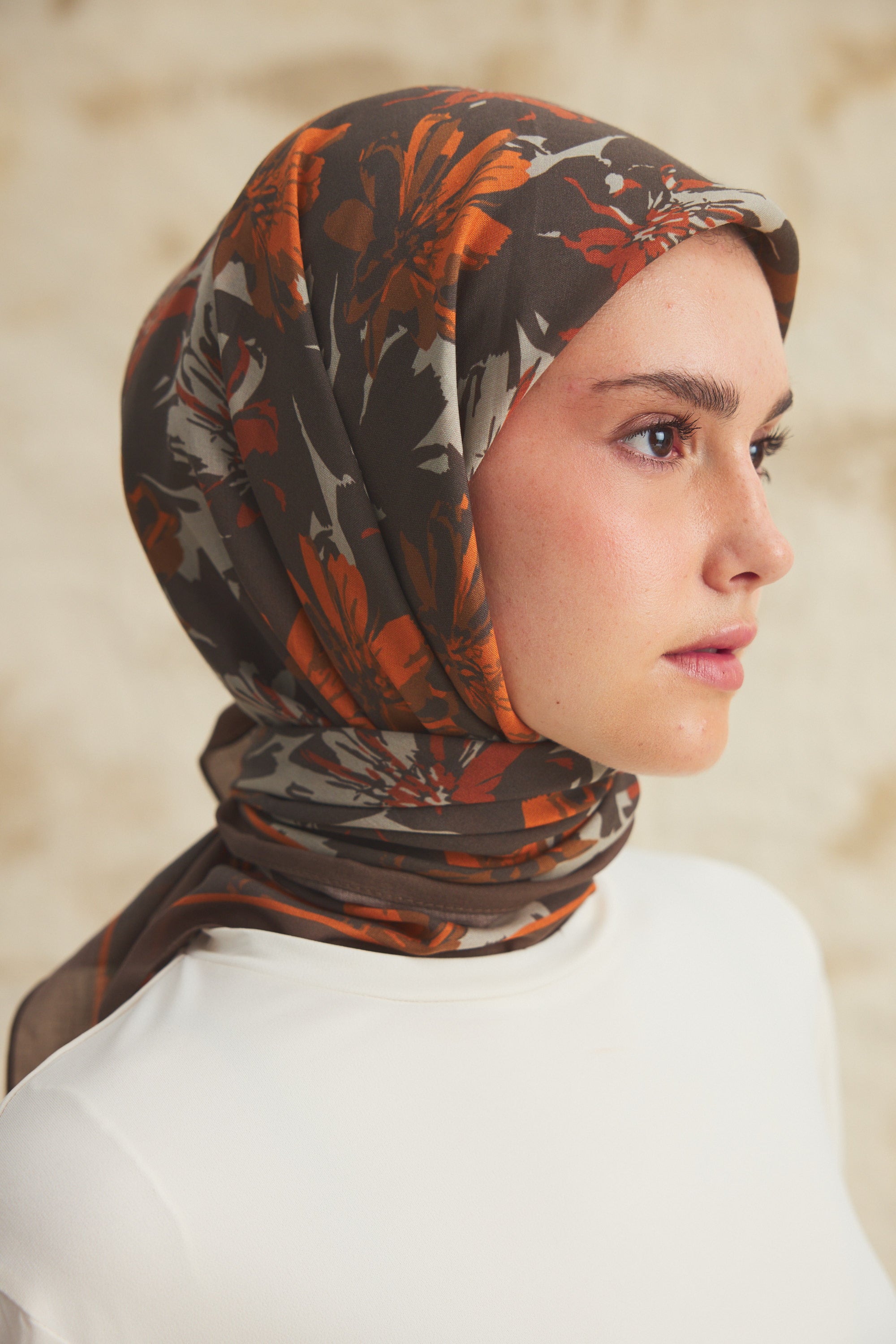 %55 Lyocell ve %45 Floş içeriğe sahip Velune eşarplar, dokusal konfor ile estetik zarafeti dengeli bir yapıda bir araya getirir. Lyocell’in hafif ve nefes alabilen formu eşarba doğal bir akış kazandırırken, Floş ipliğin ipeksi parlaklığı desenin detaylarını zarif bir şekilde ön plana çıkarır. Bu özel kumaş karışımı, formunu koruyan ve kolay şekil alan bir kullanım sunar.