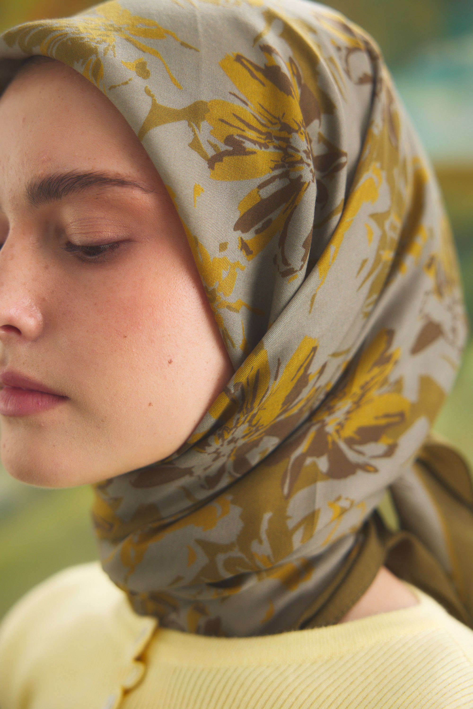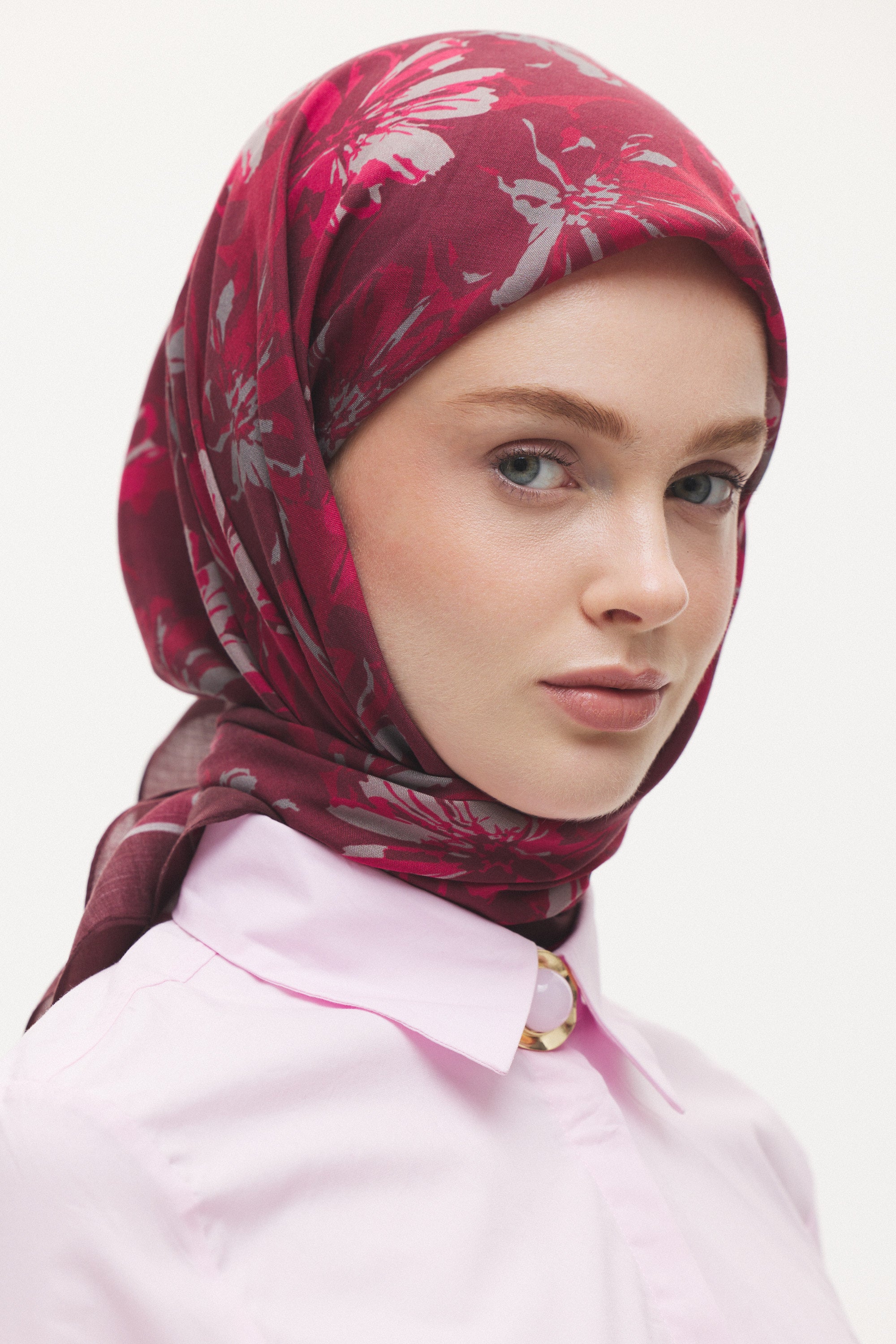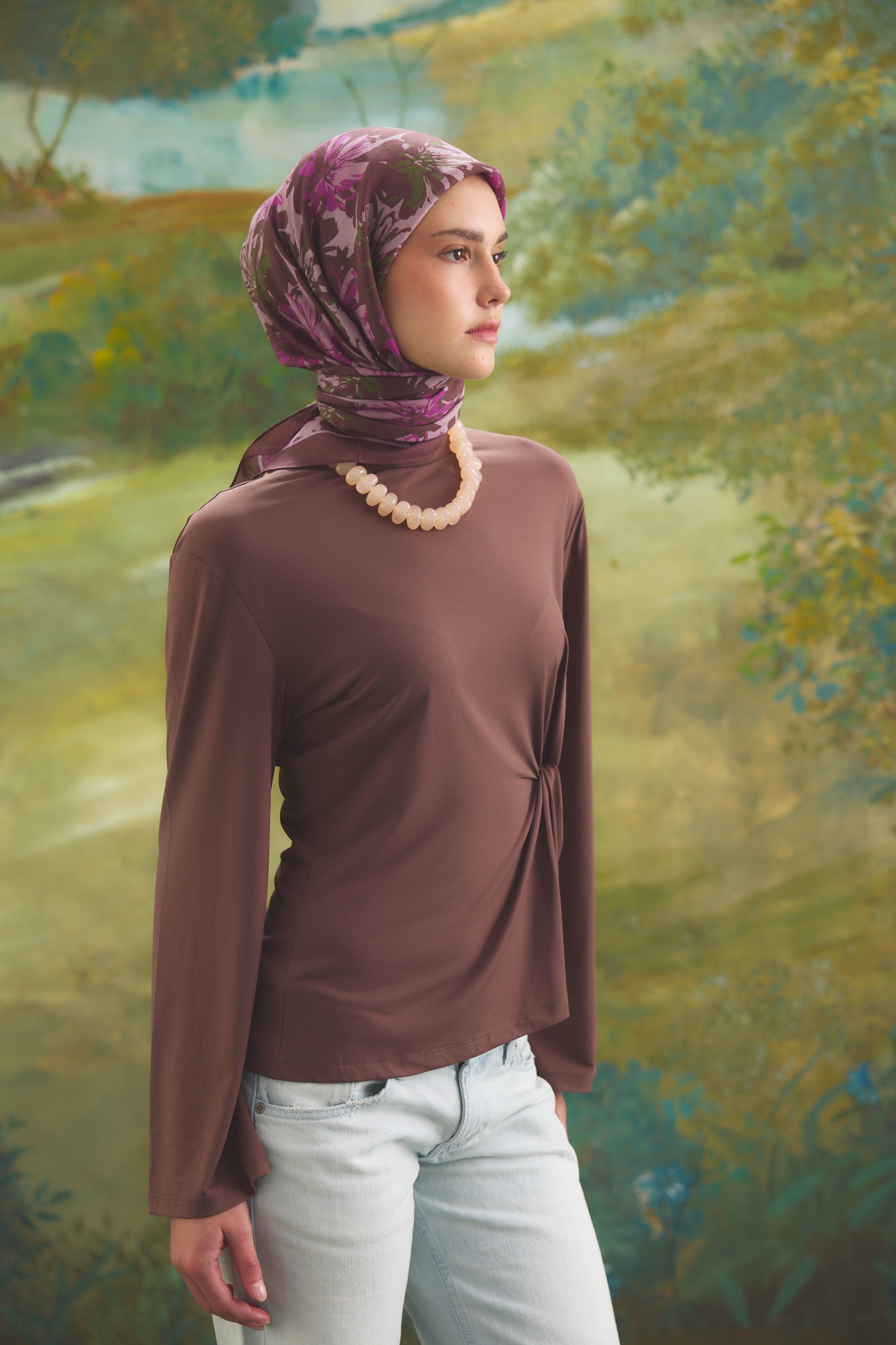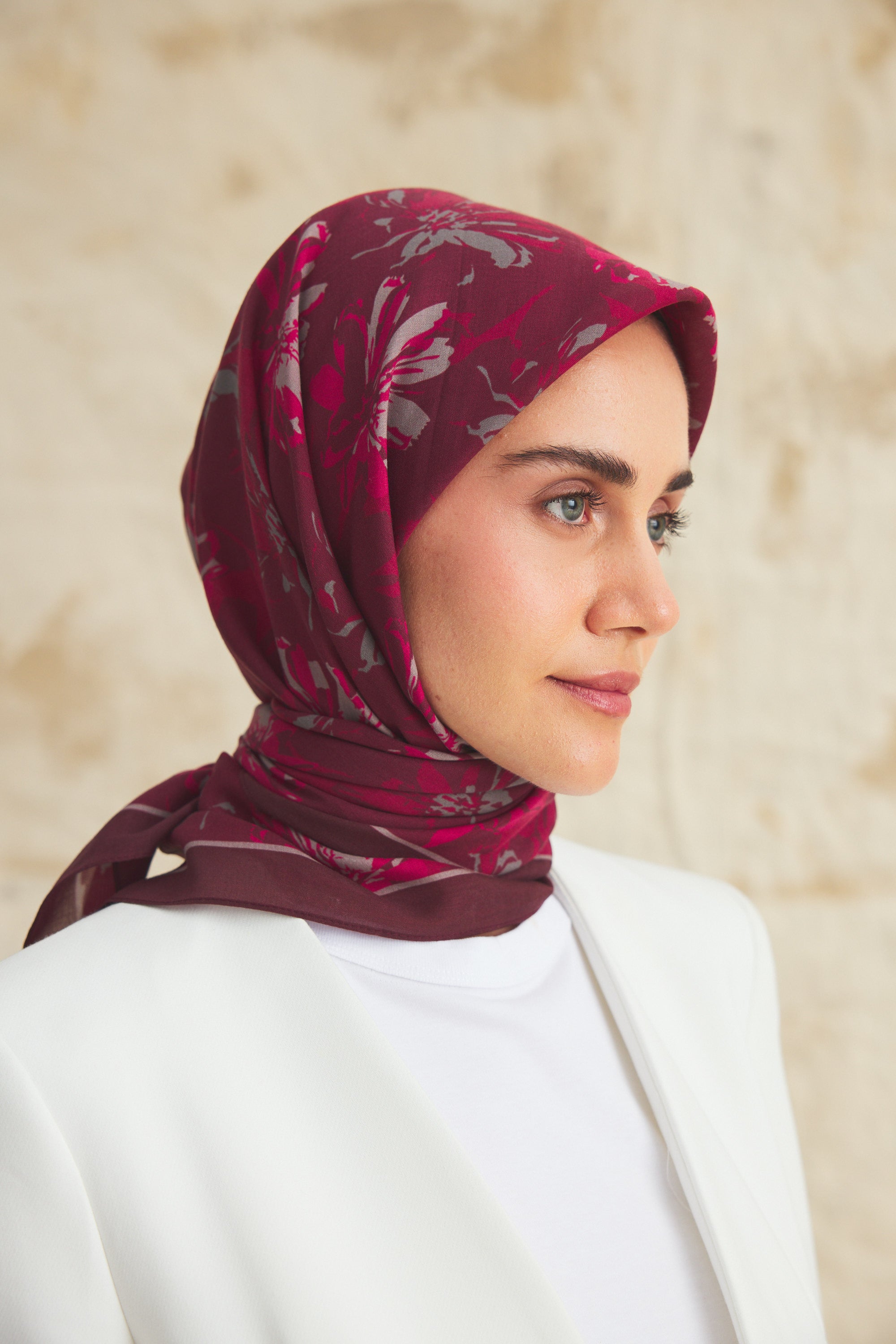 %55 Lyocell ve %45 Floş içeriğe sahip Velune eşarplar, dokusal konfor ile estetik zarafeti dengeli bir yapıda bir araya getirir. Lyocell’in hafif ve nefes alabilen formu eşarba doğal bir akış kazandırırken, Floş ipliğin ipeksi parlaklığı desenin detaylarını zarif bir şekilde ön plana çıkarır. Bu özel kumaş karışımı, formunu koruyan ve kolay şekil alan bir kullanım sunar.