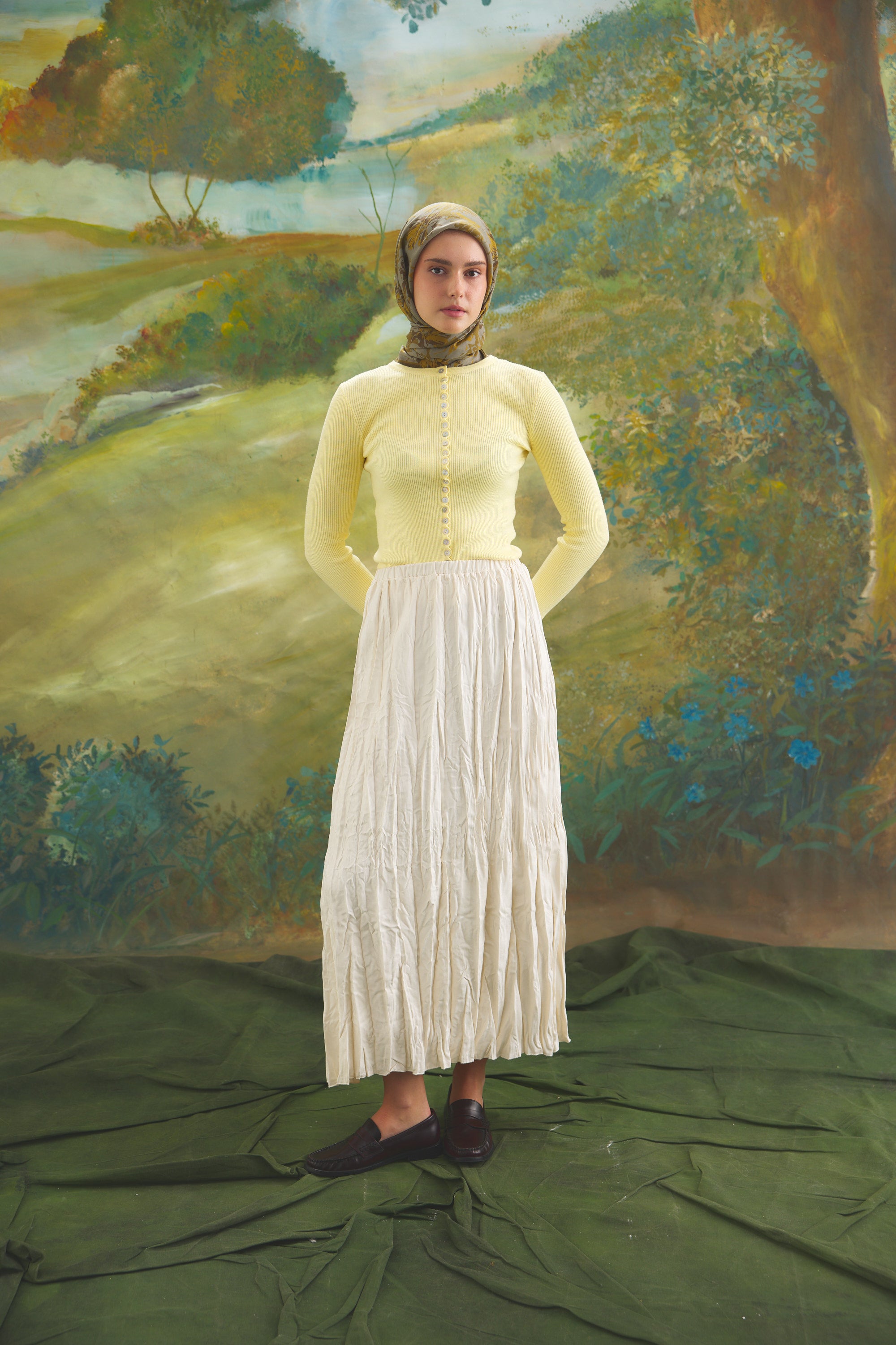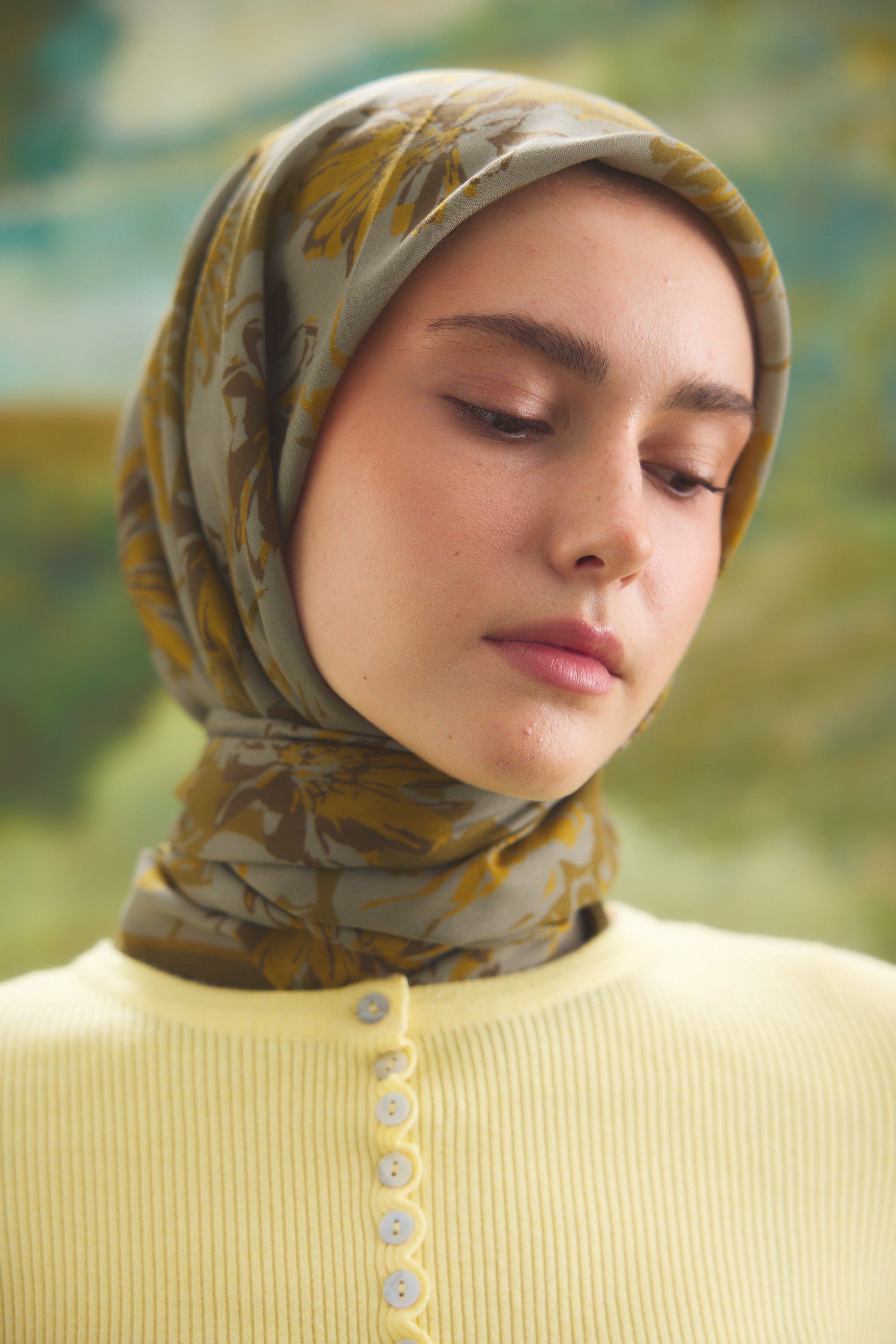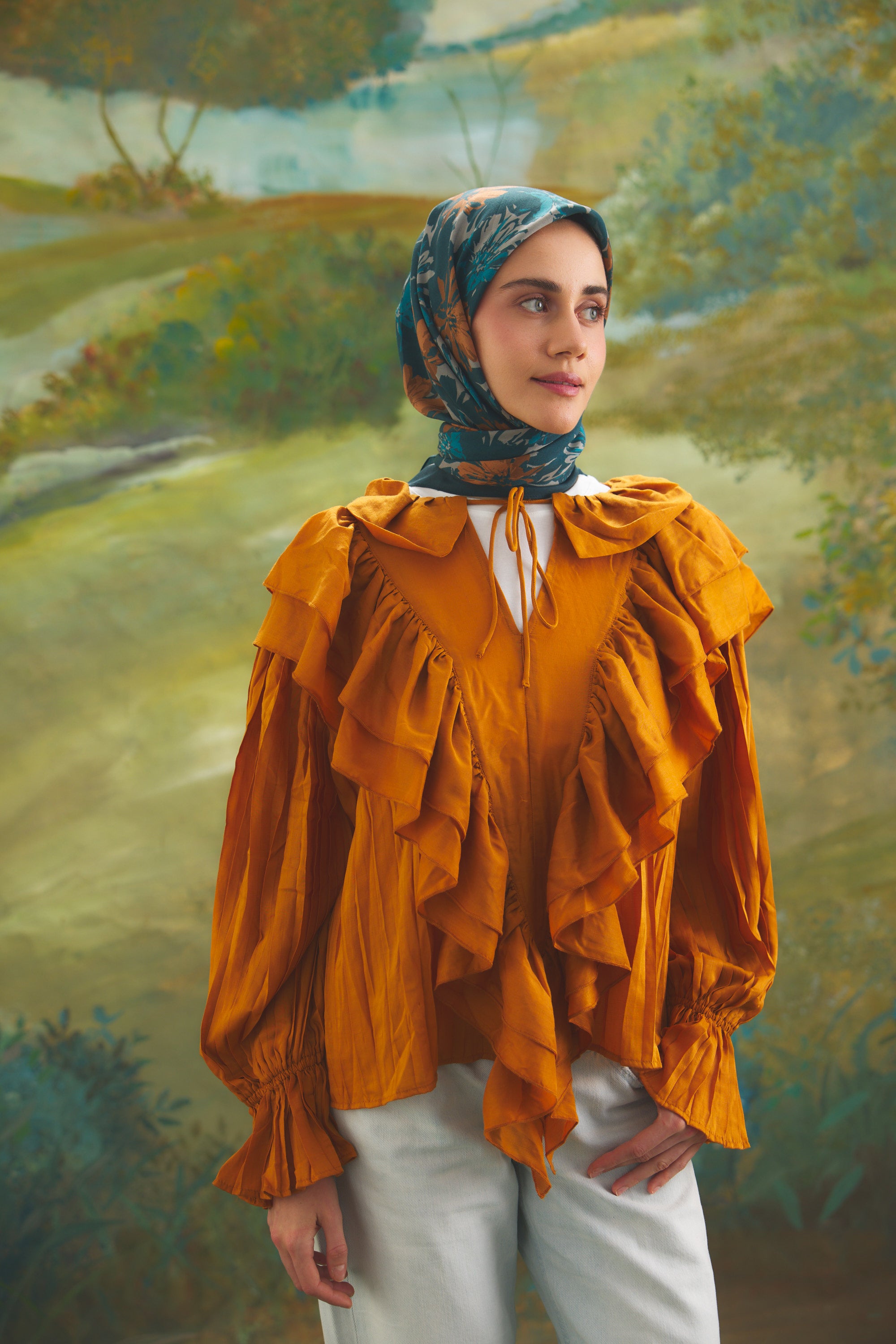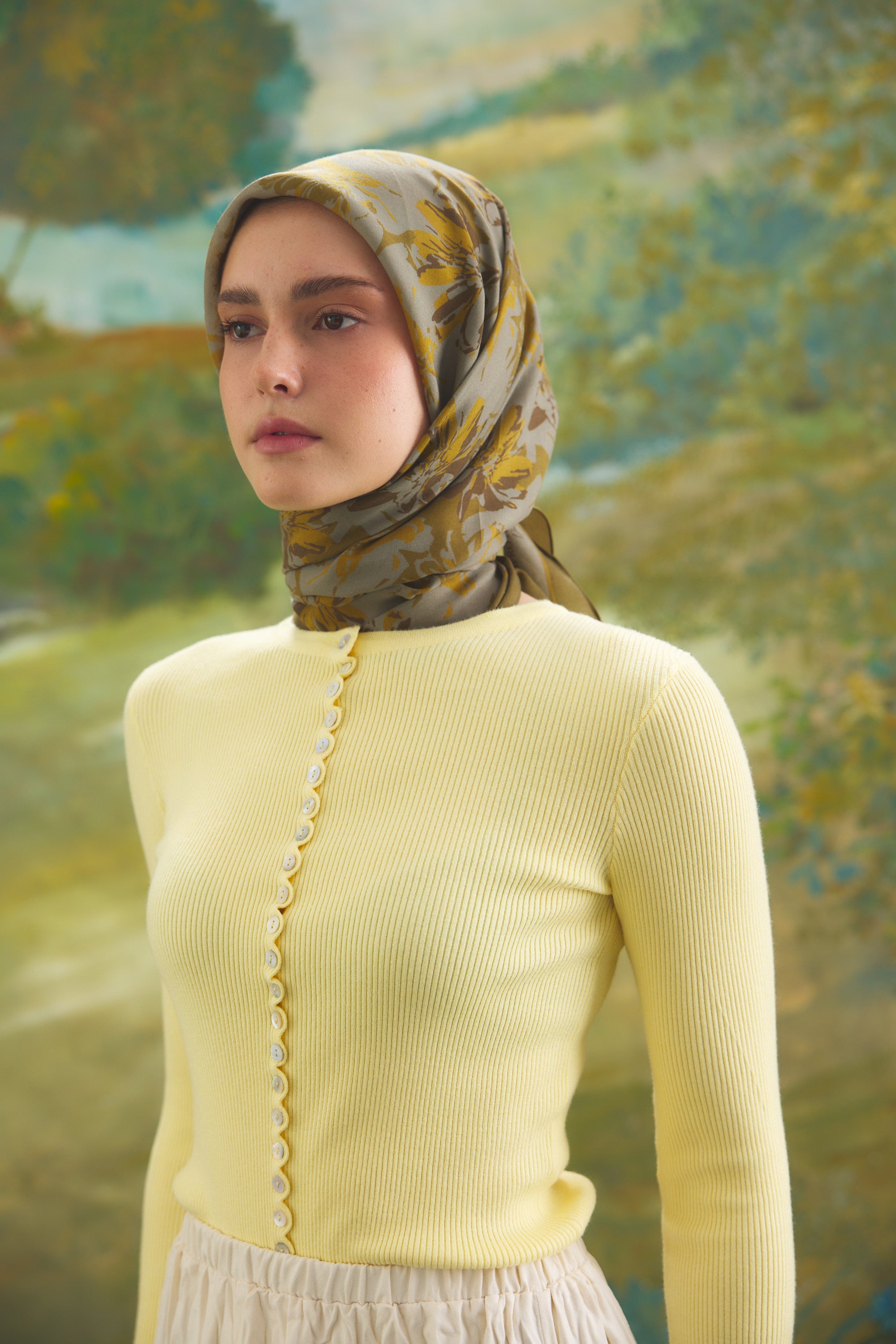 %55 Lyocell ve %45 Floş içeriğe sahip Velune eşarplar, dokusal konfor ile estetik zarafeti dengeli bir yapıda bir araya getirir. Lyocell’in hafif ve nefes alabilen formu eşarba doğal bir akış kazandırırken, Floş ipliğin ipeksi parlaklığı desenin detaylarını zarif bir şekilde ön plana çıkarır. Bu özel kumaş karışımı, formunu koruyan ve kolay şekil alan bir kullanım sunar.