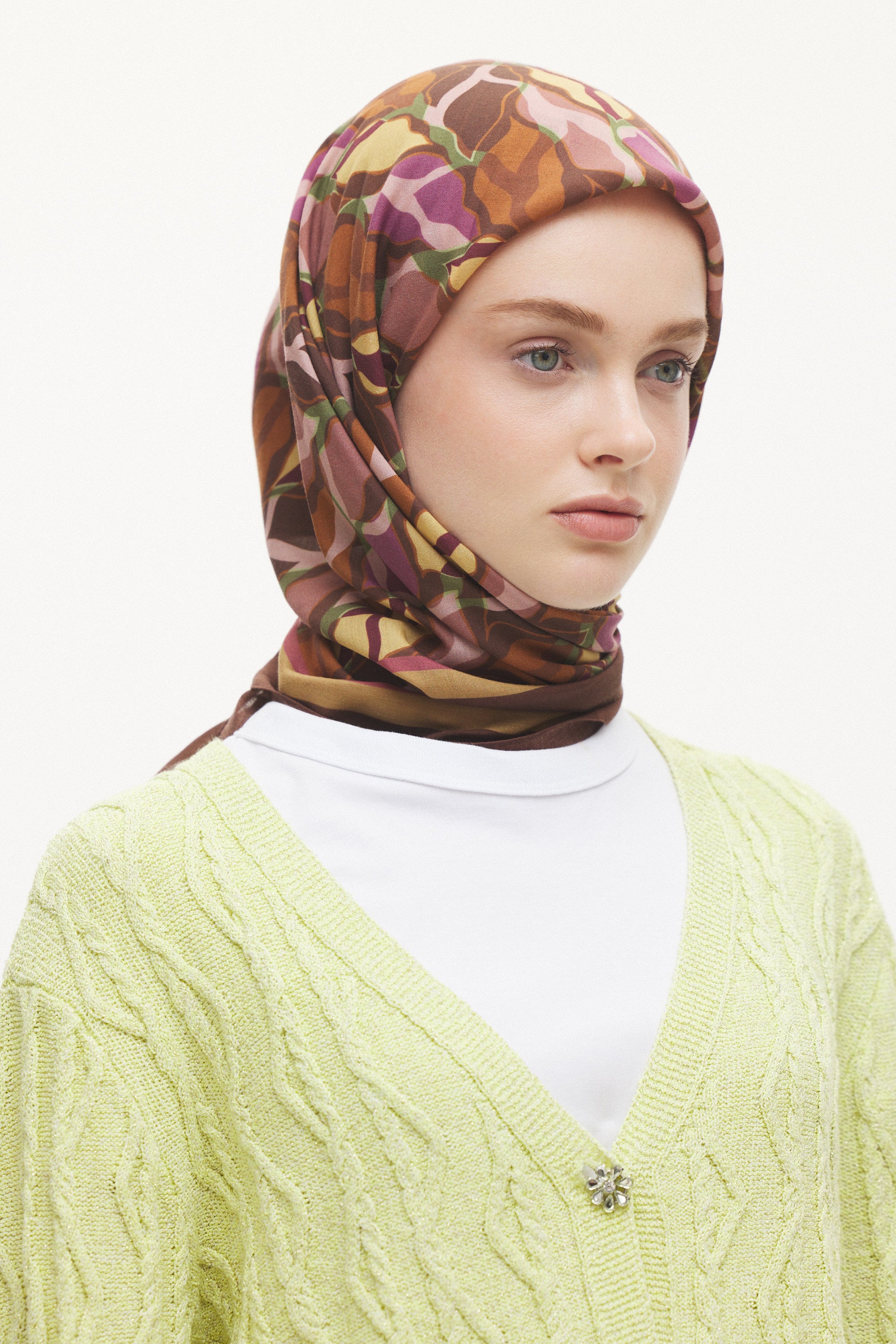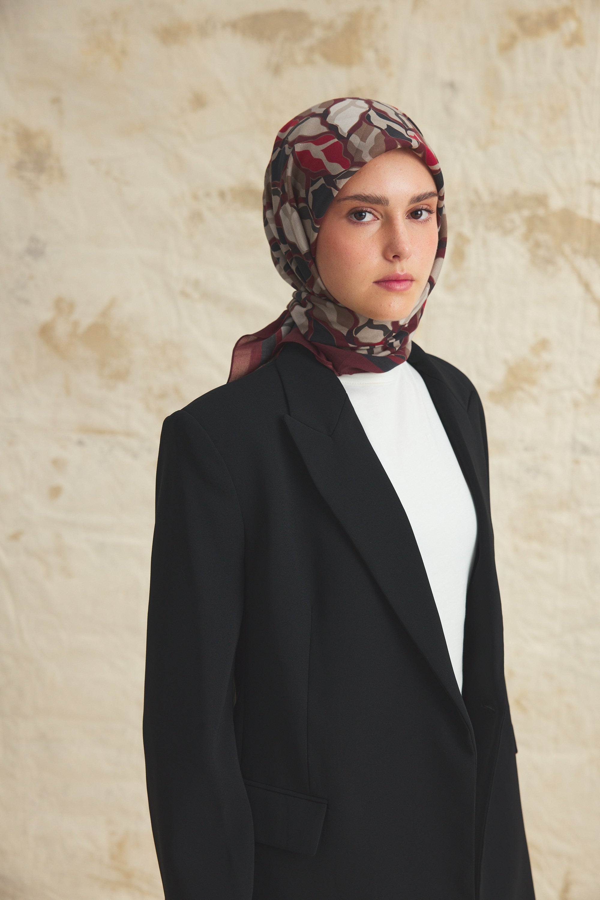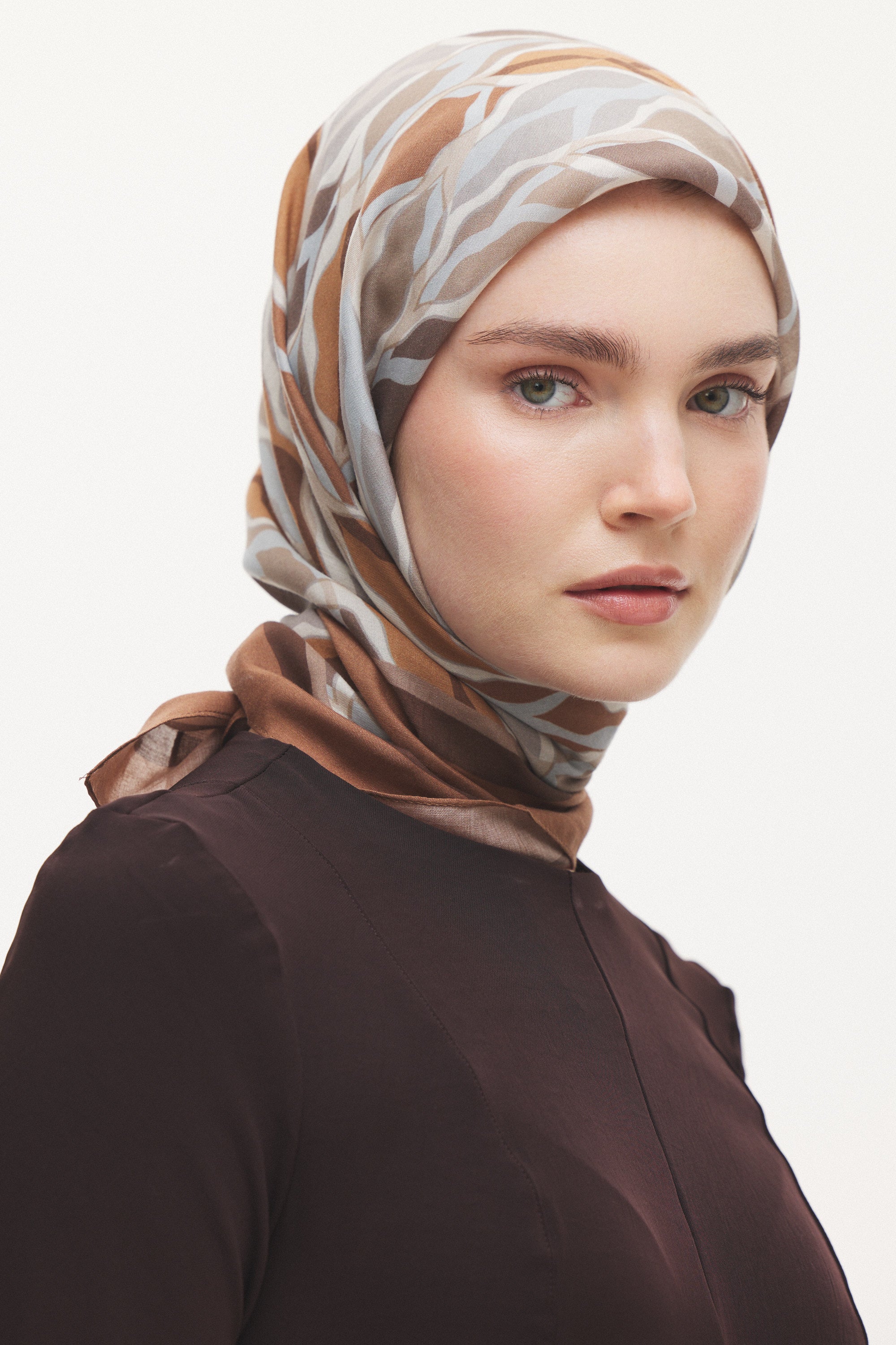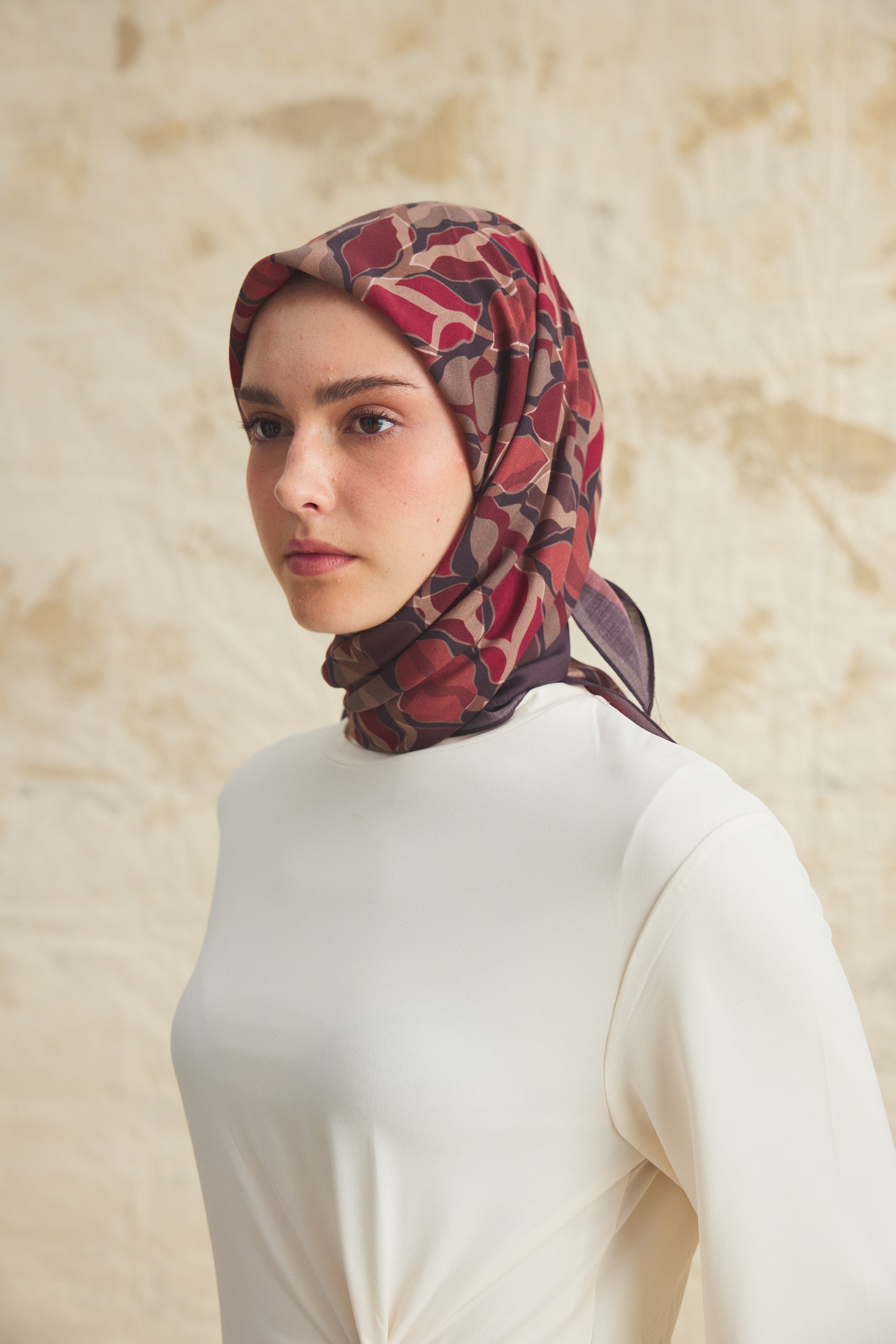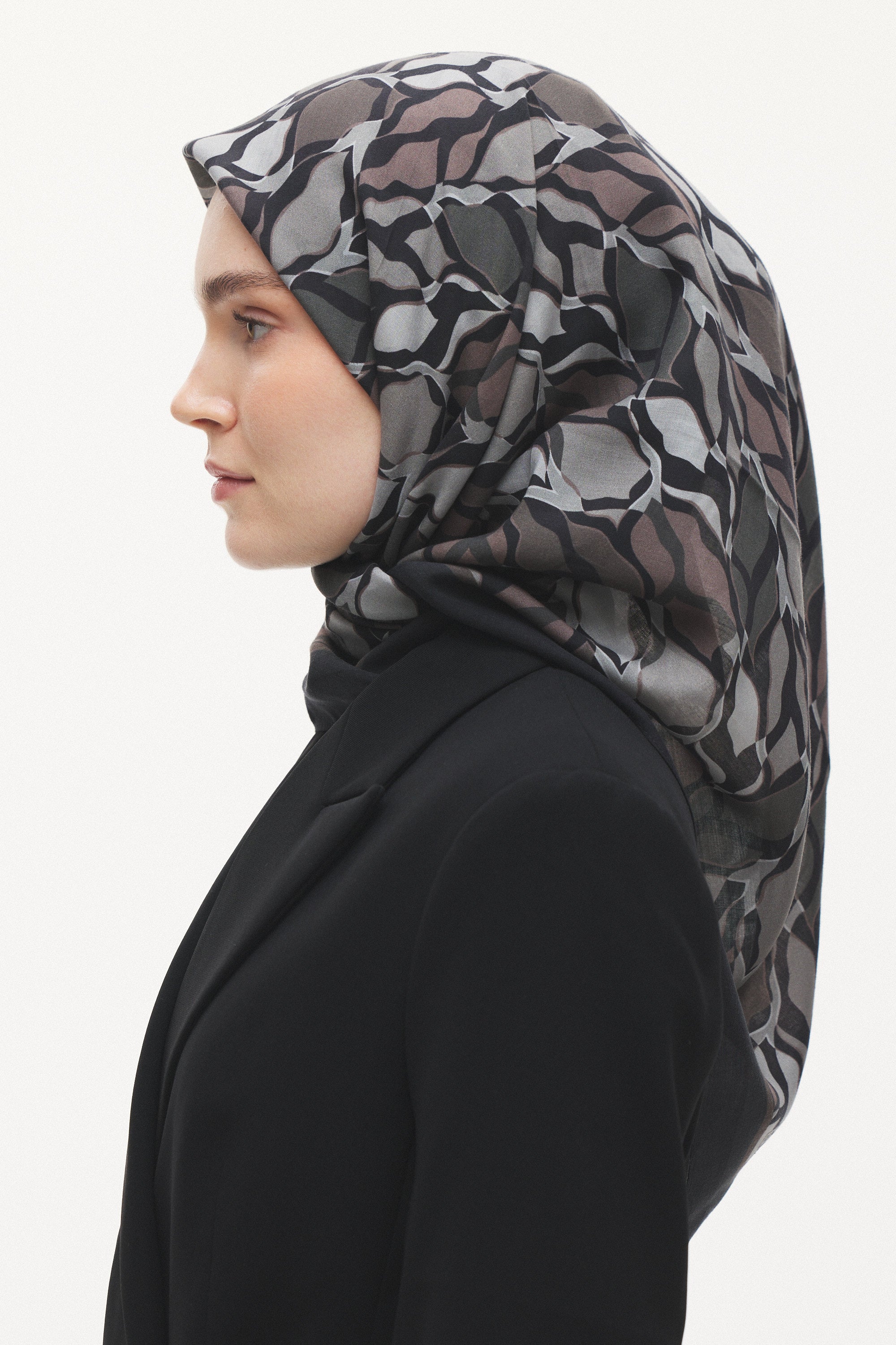 %55 Lyocell ve %45 Floş içeriğe sahip Velune eşarplar, hafiflik ve sofistike duruşu bir araya getirir. Lyocell’in nefes alabilen ve doğal akış sağlayan yapısı eşarba yumuşak bir form kazandırırken, Floş ipliğin ipeksi parlaklığı desenin hareketini zarif biçimde vurgular. Bu özel kumaş karışımı, formunu koruyan ve gün boyu konfor sunan bir kullanım deneyimi sağlar.