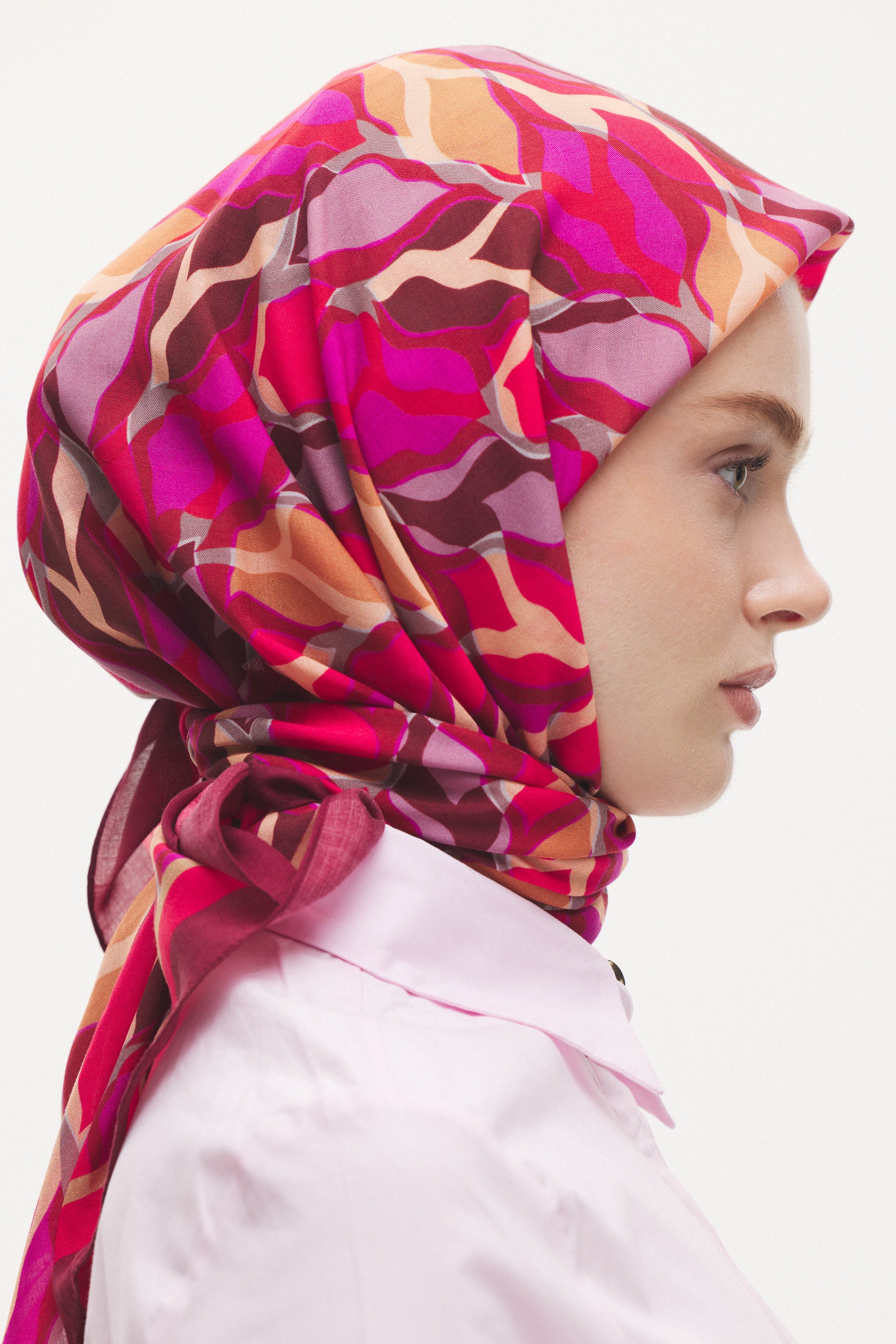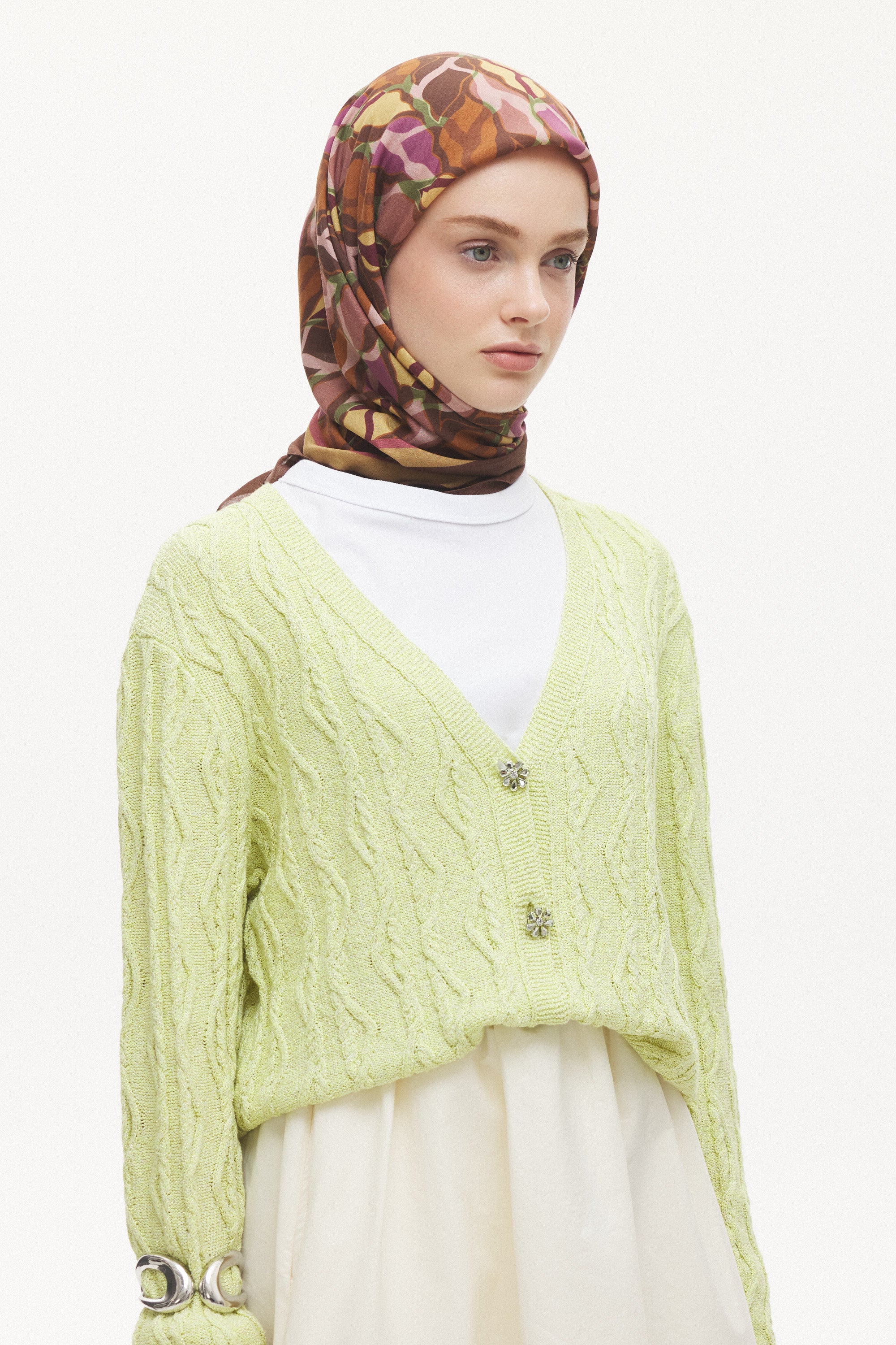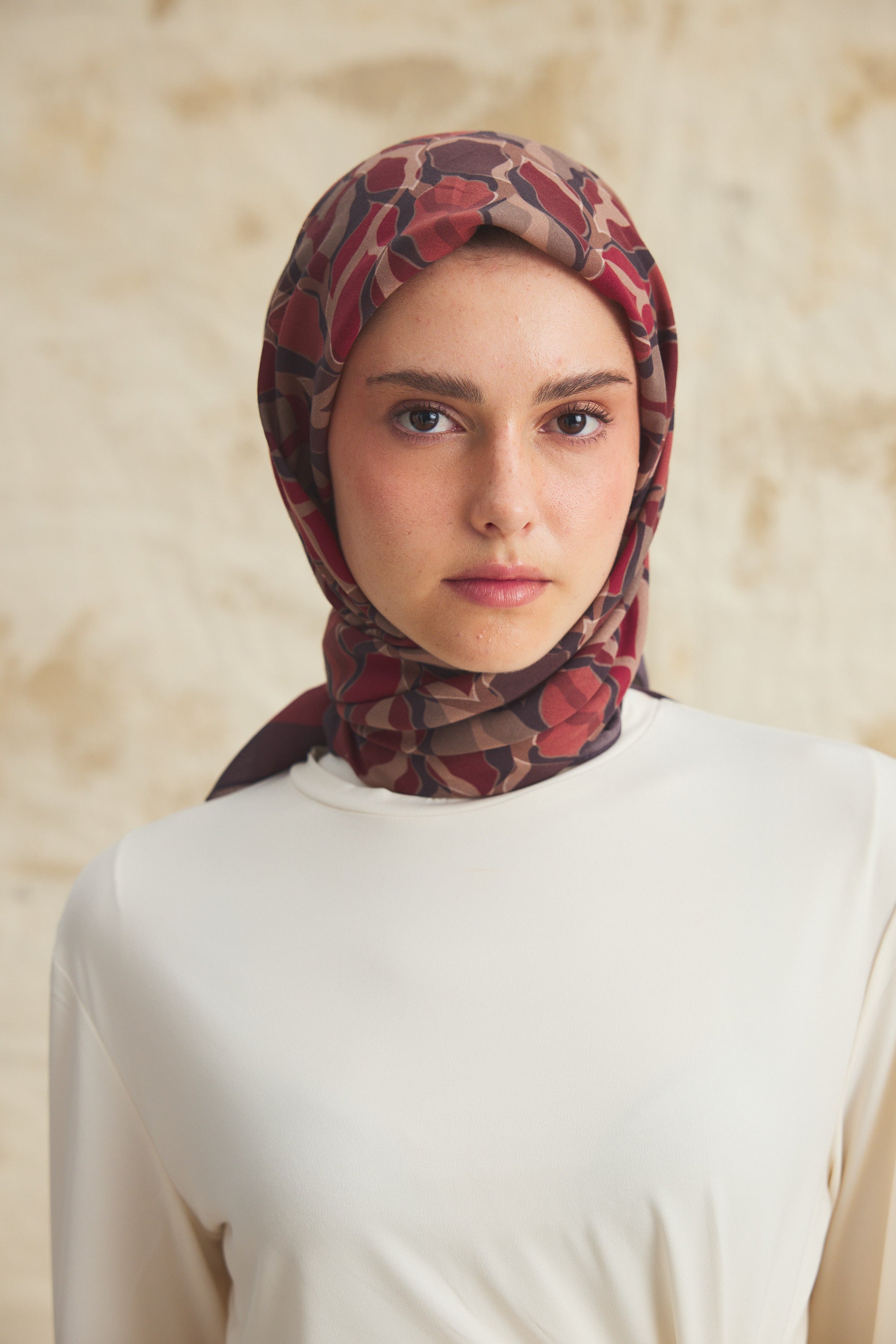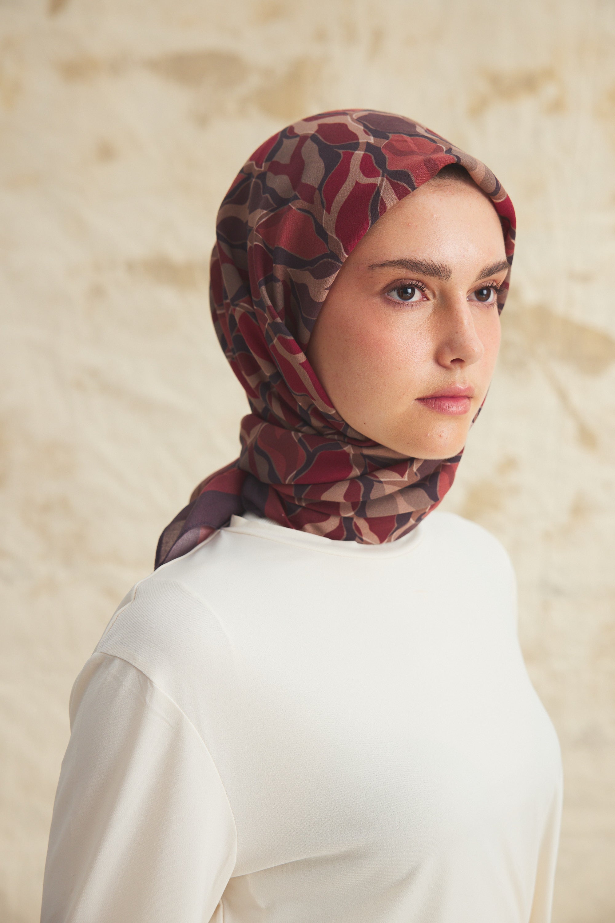 %55 Lyocell ve %45 Floş içeriğe sahip Velune eşarplar, hafiflik ve sofistike duruşu bir araya getirir. Lyocell’in nefes alabilen ve doğal akış sağlayan yapısı eşarba yumuşak bir form kazandırırken, Floş ipliğin ipeksi parlaklığı desenin hareketini zarif biçimde vurgular. Bu özel kumaş karışımı, formunu koruyan ve gün boyu konfor sunan bir kullanım deneyimi sağlar.