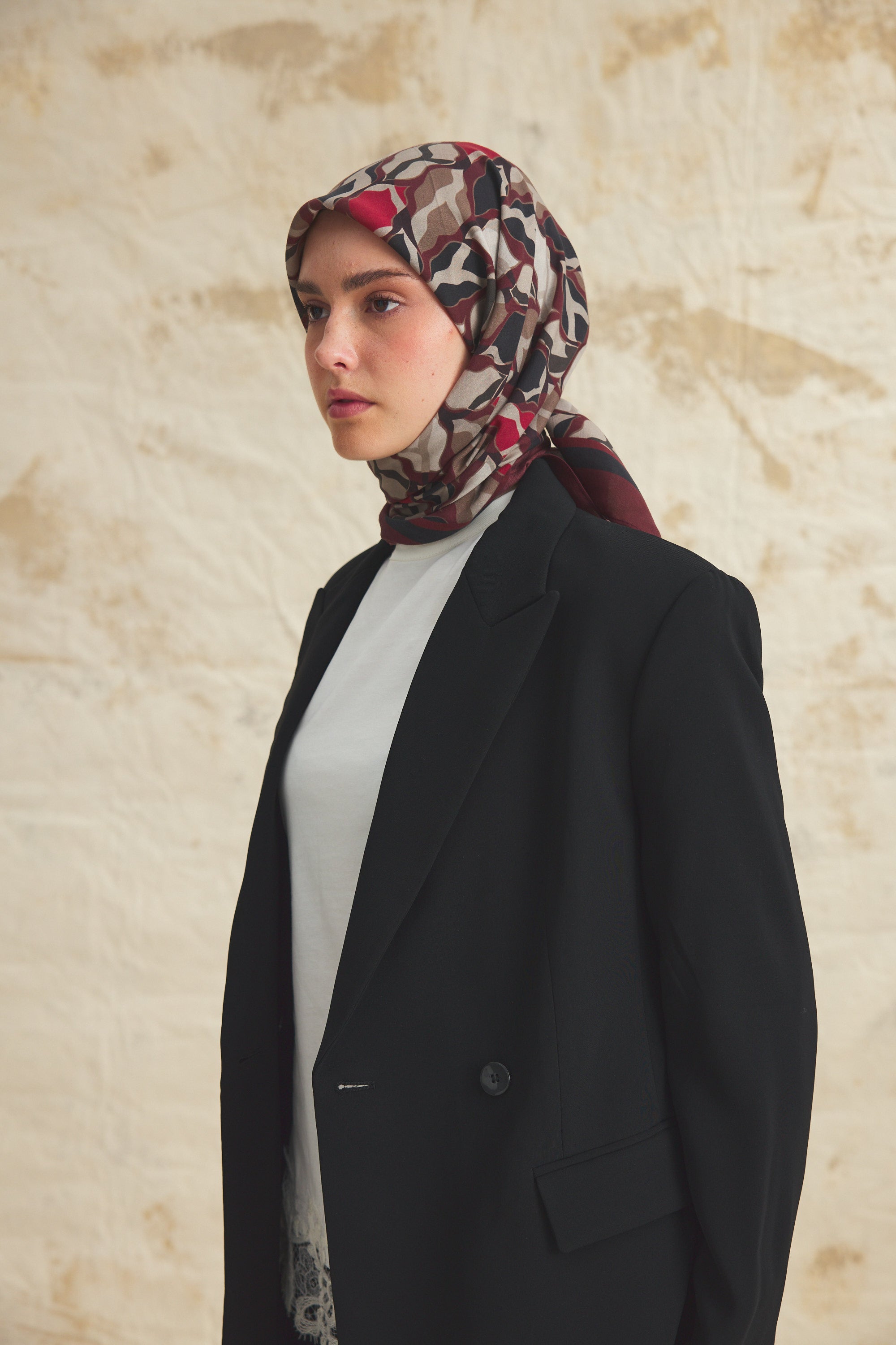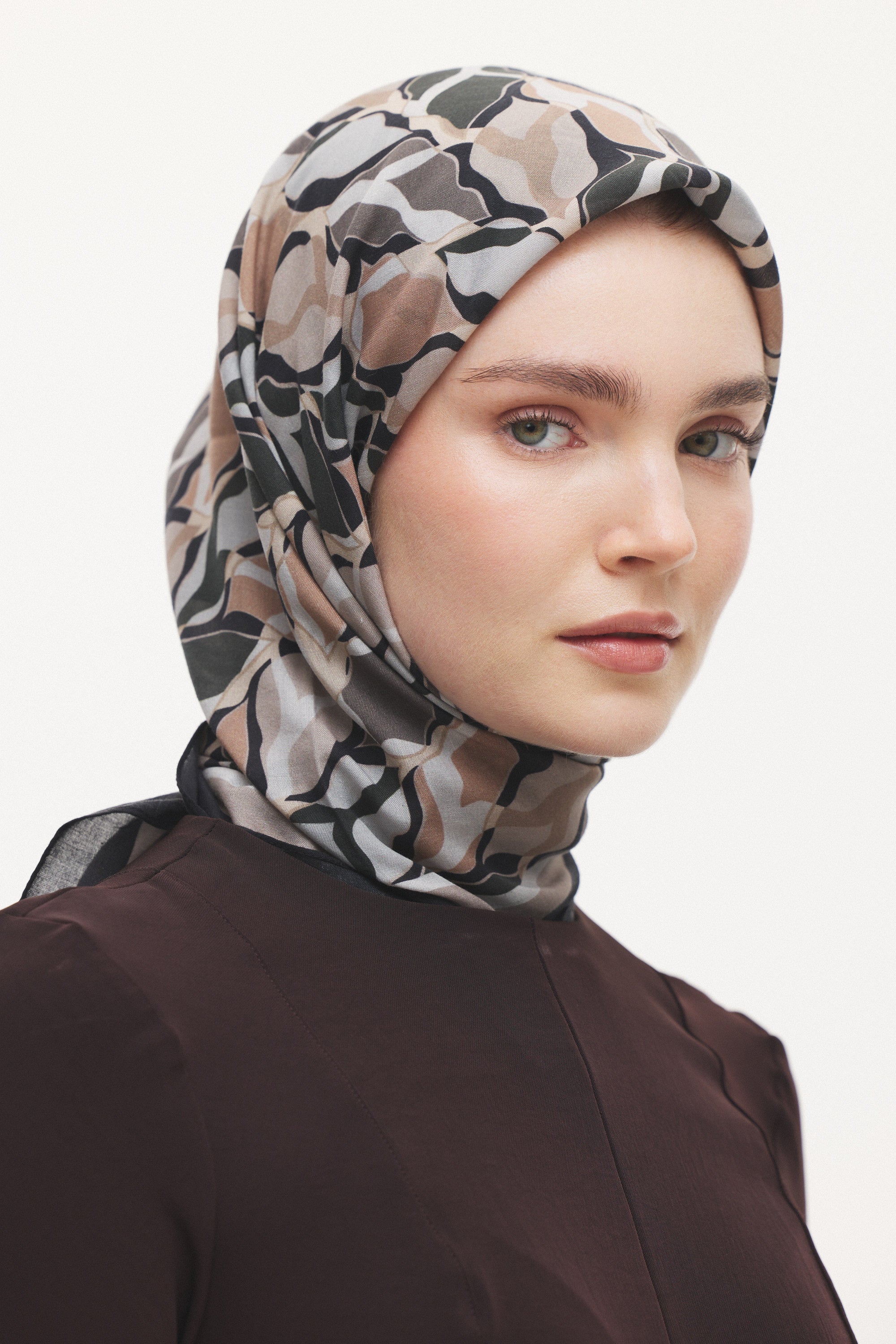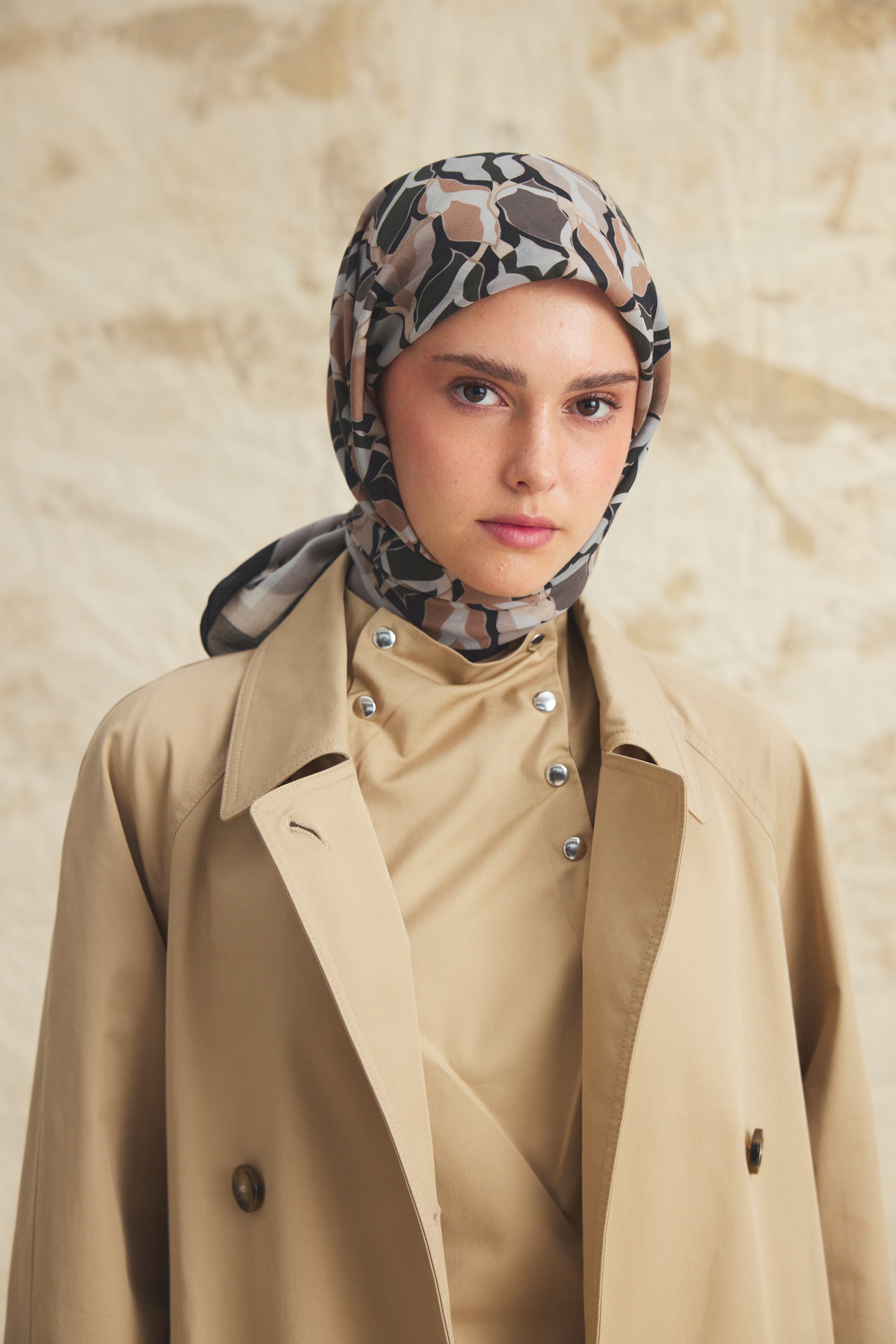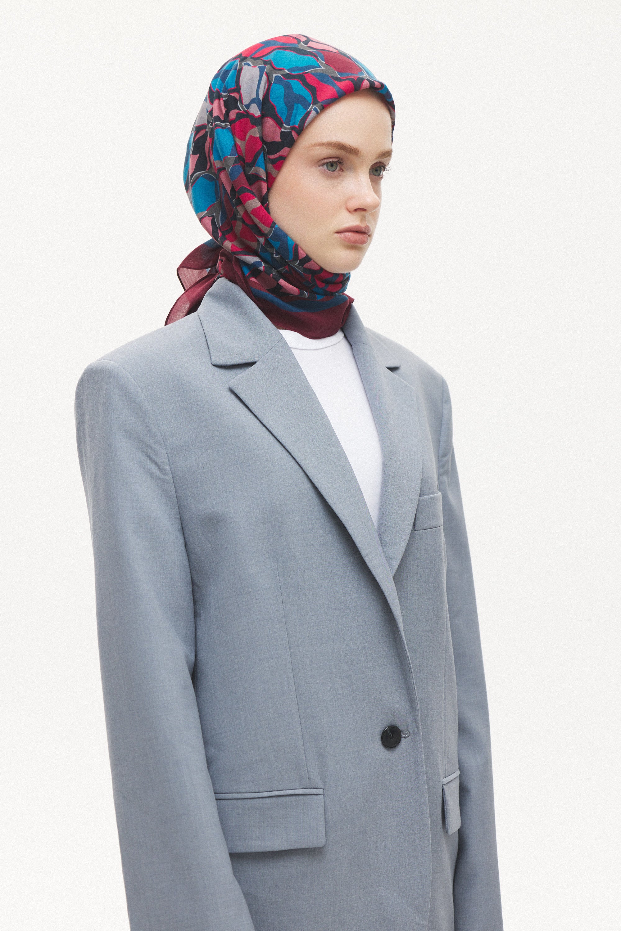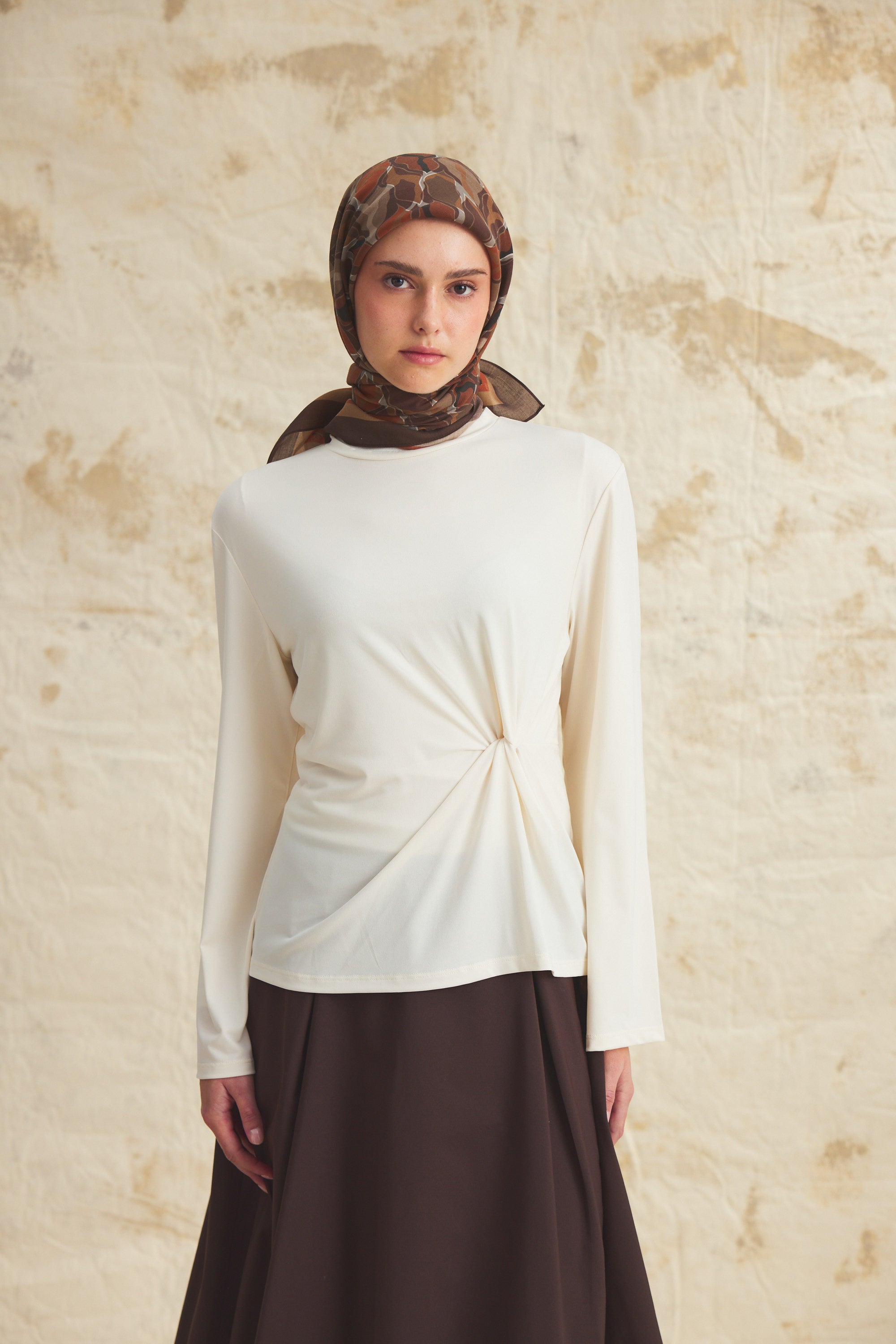 %55 Lyocell ve %45 Floş içeriğe sahip Velune eşarplar, hafiflik ve sofistike duruşu bir araya getirir. Lyocell’in nefes alabilen ve doğal akış sağlayan yapısı eşarba yumuşak bir form kazandırırken, Floş ipliğin ipeksi parlaklığı desenin hareketini zarif biçimde vurgular. Bu özel kumaş karışımı, formunu koruyan ve gün boyu konfor sunan bir kullanım deneyimi sağlar.