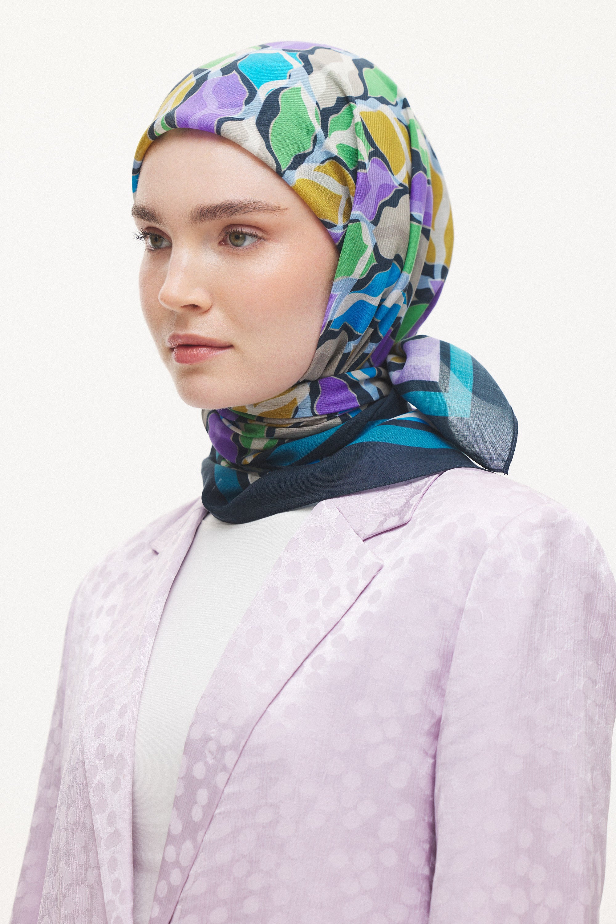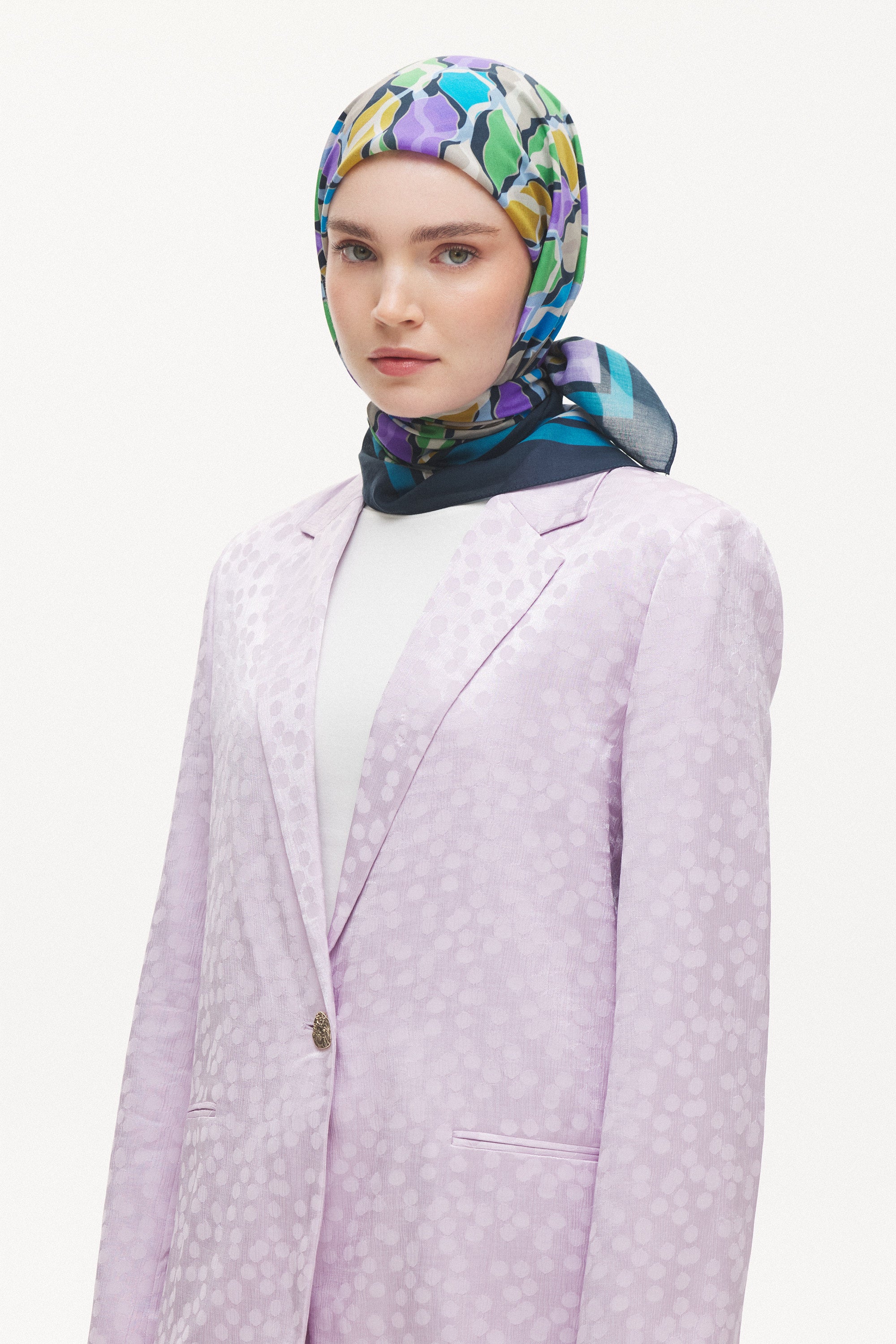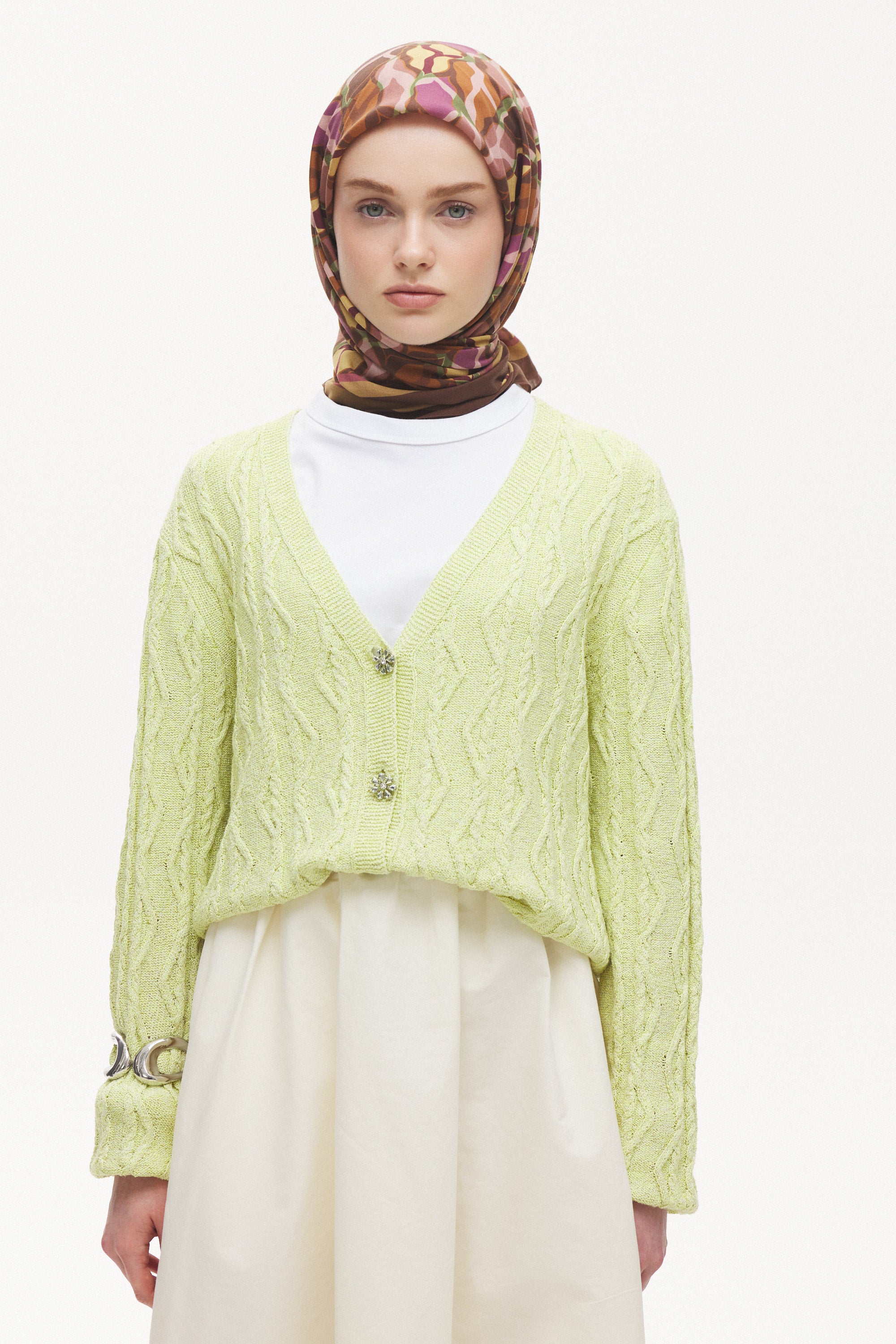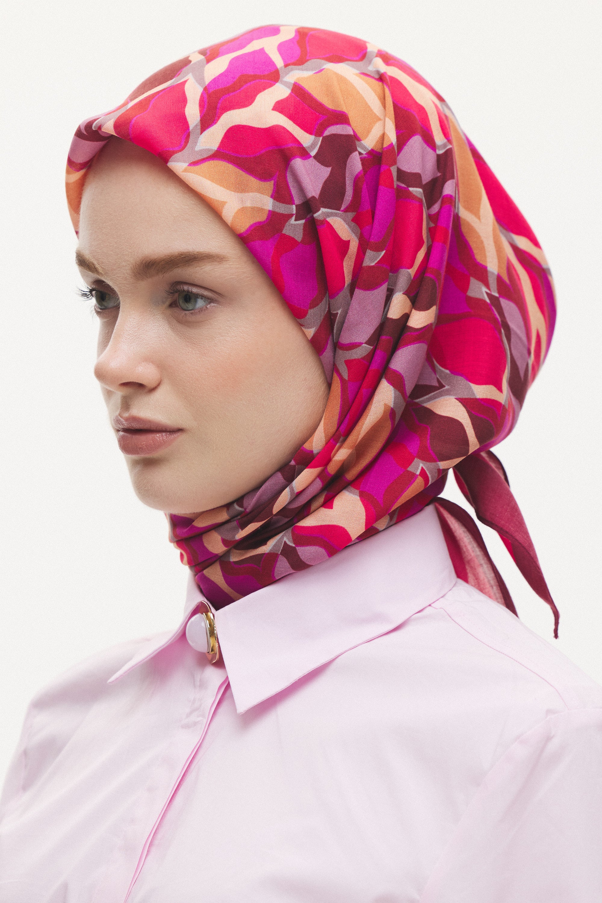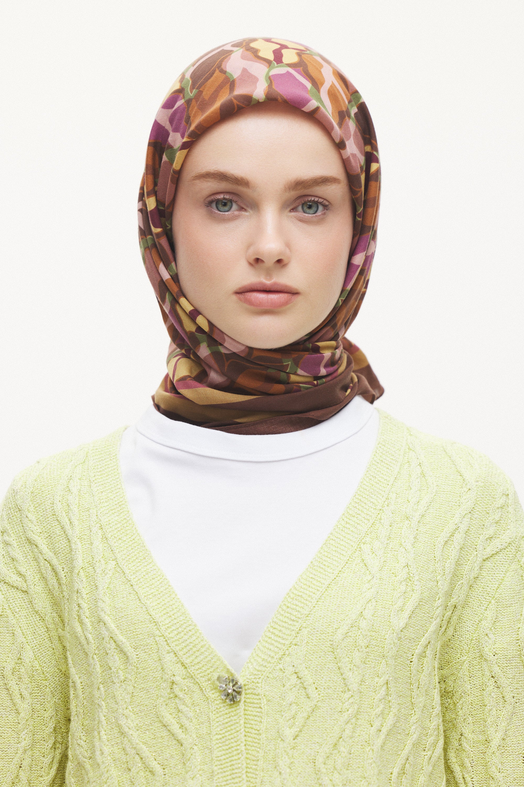 %55 Lyocell ve %45 Floş içeriğe sahip Velune eşarplar, hafiflik ve sofistike duruşu bir araya getirir. Lyocell’in nefes alabilen ve doğal akış sağlayan yapısı eşarba yumuşak bir form kazandırırken, Floş ipliğin ipeksi parlaklığı desenin hareketini zarif biçimde vurgular. Bu özel kumaş karışımı, formunu koruyan ve gün boyu konfor sunan bir kullanım deneyimi sağlar.