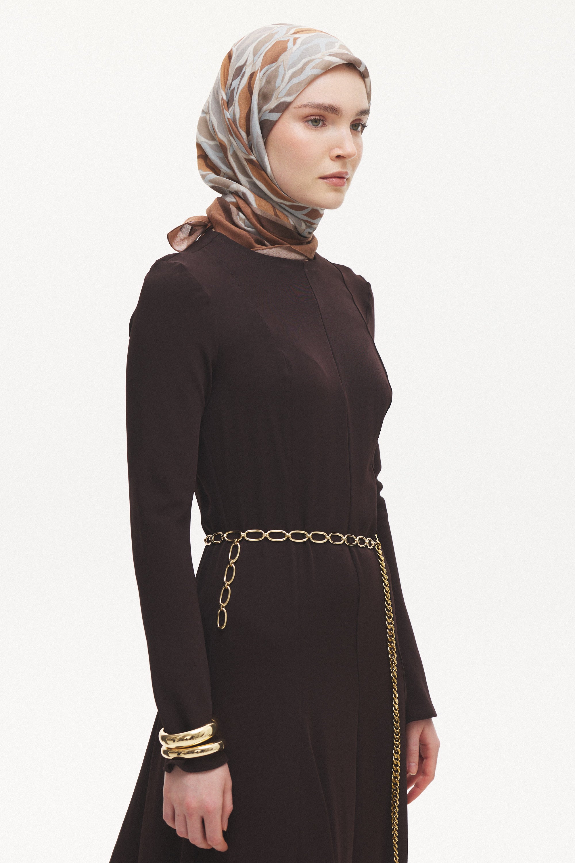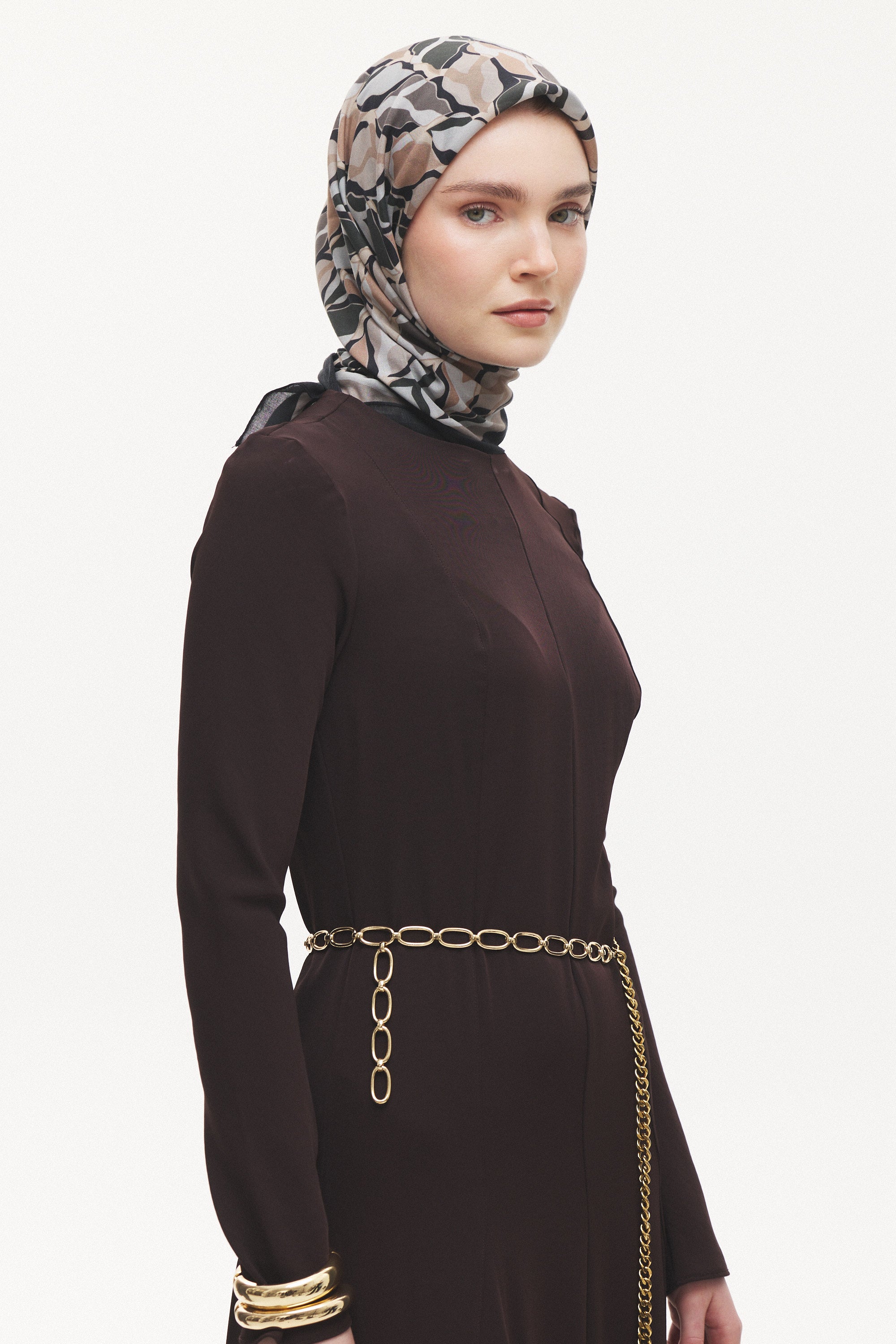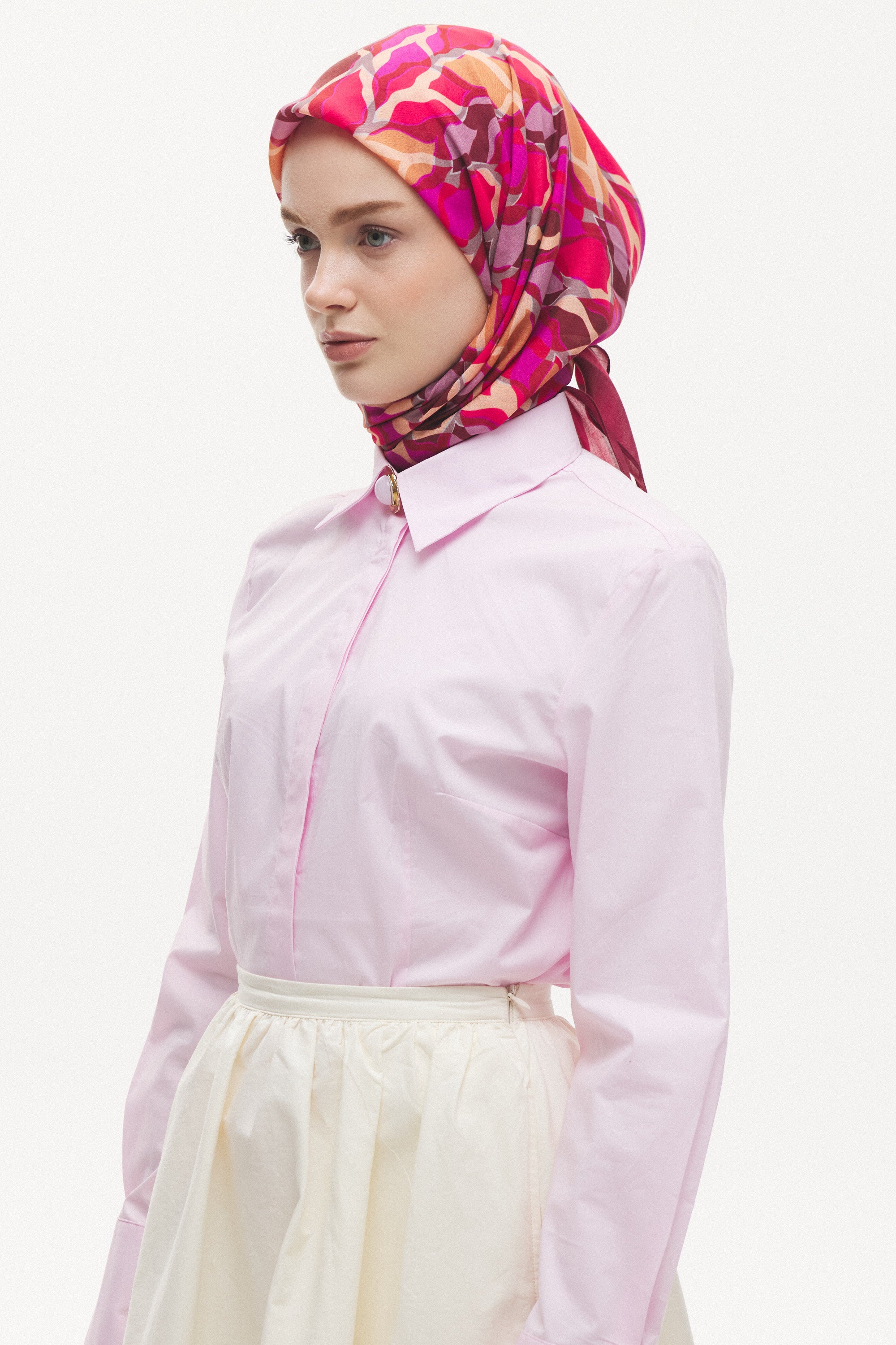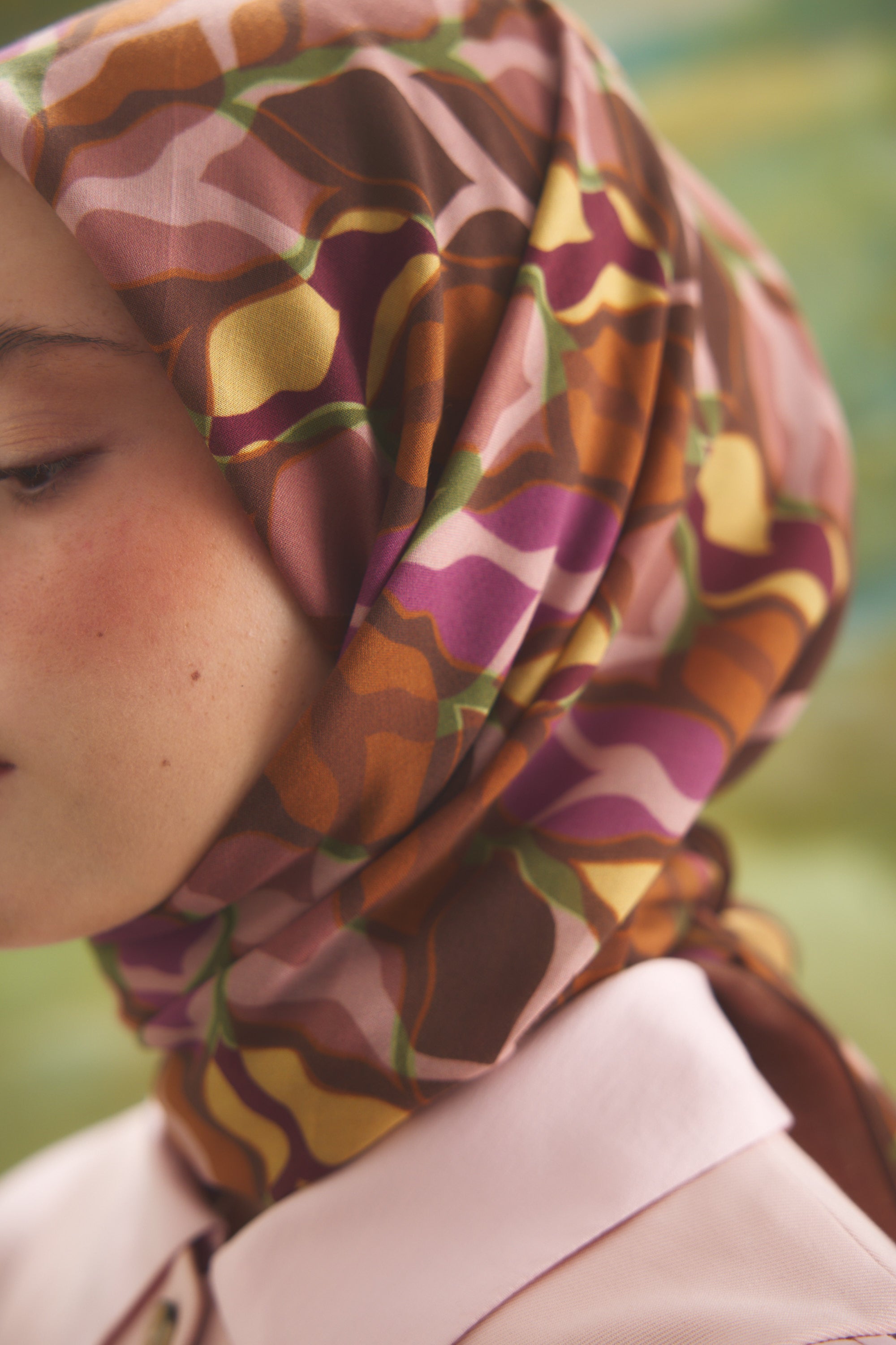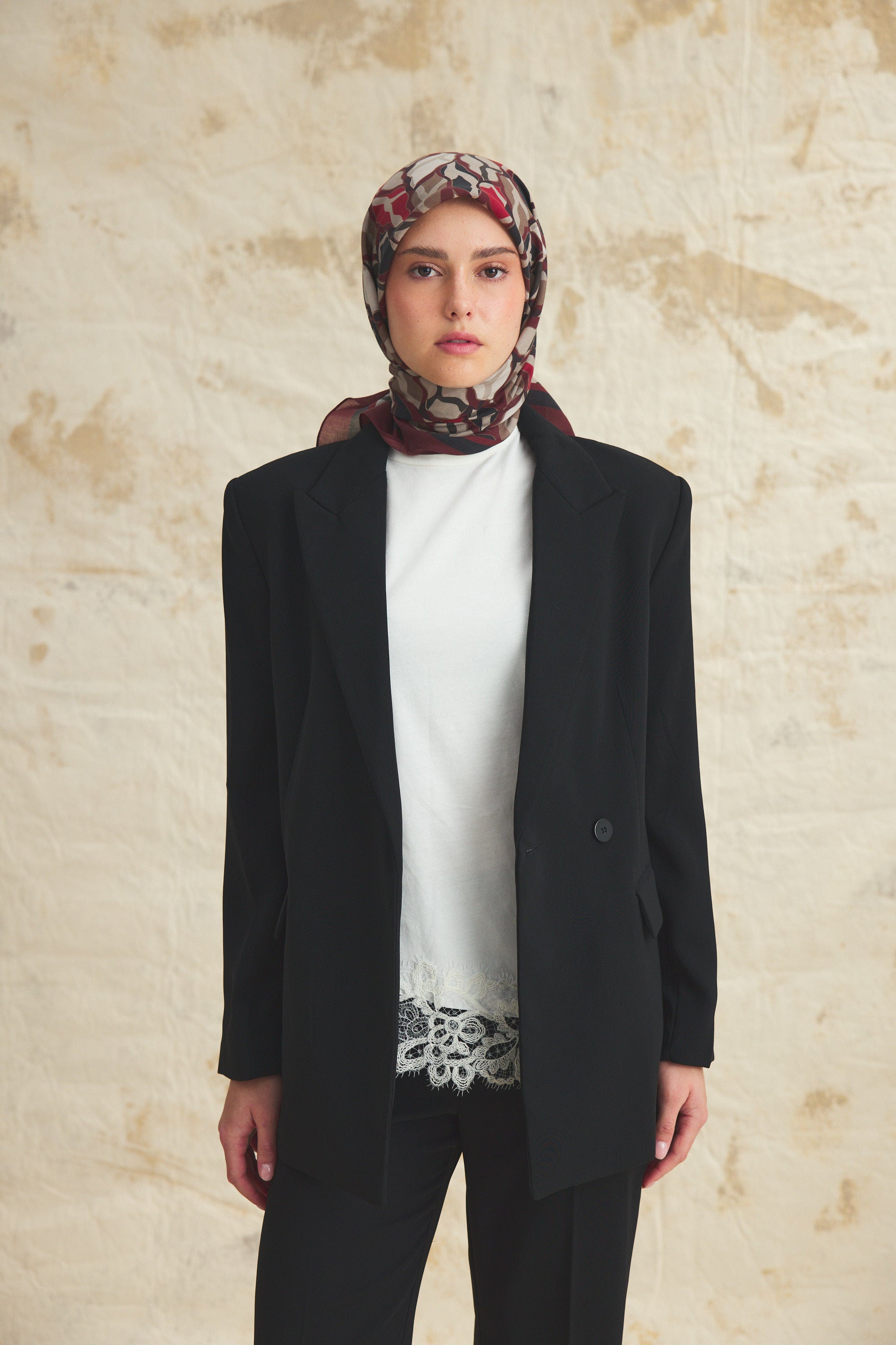 %55 Lyocell ve %45 Floş içeriğe sahip Velune eşarplar, hafiflik ve sofistike duruşu bir araya getirir. Lyocell’in nefes alabilen ve doğal akış sağlayan yapısı eşarba yumuşak bir form kazandırırken, Floş ipliğin ipeksi parlaklığı desenin hareketini zarif biçimde vurgular. Bu özel kumaş karışımı, formunu koruyan ve gün boyu konfor sunan bir kullanım deneyimi sağlar.