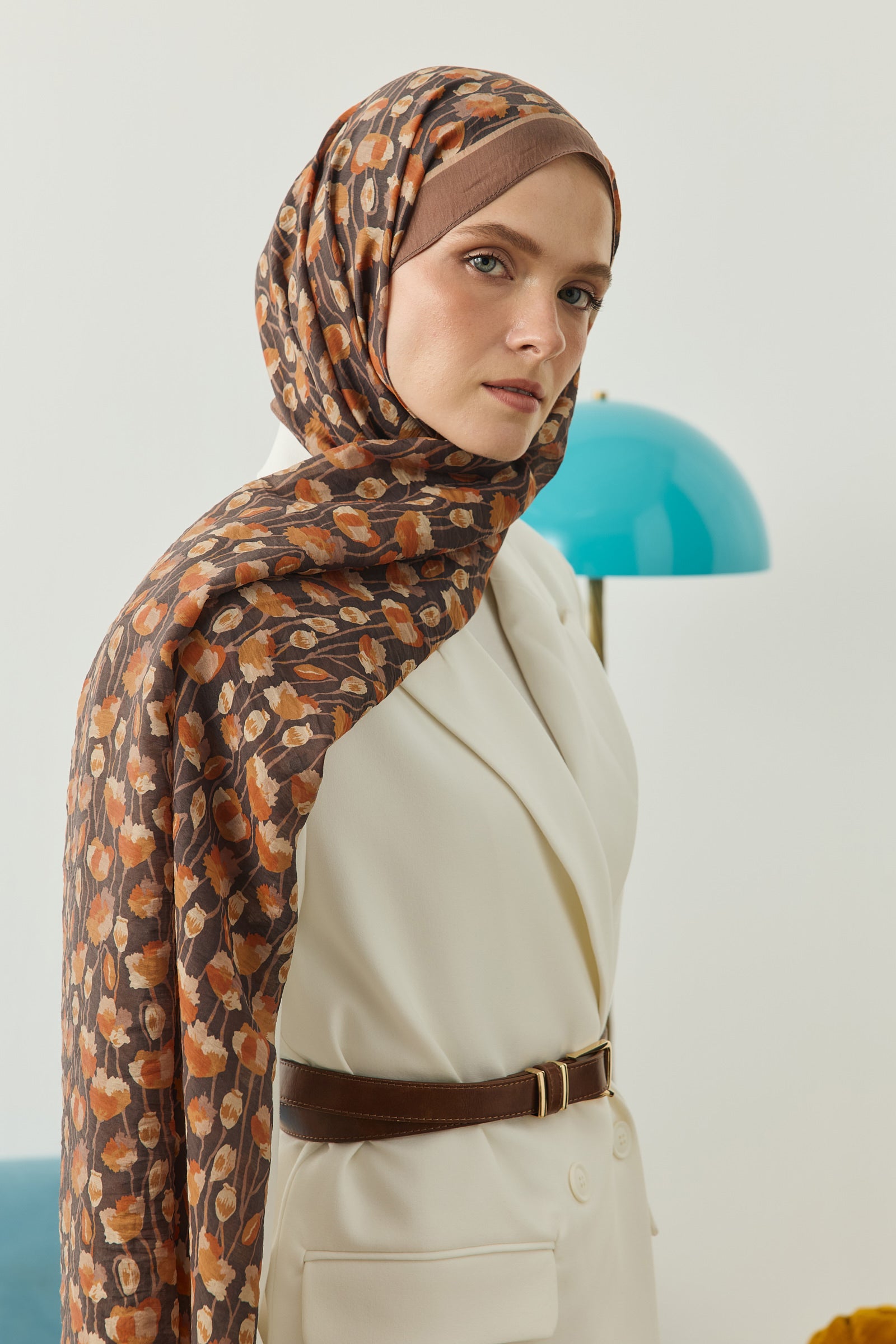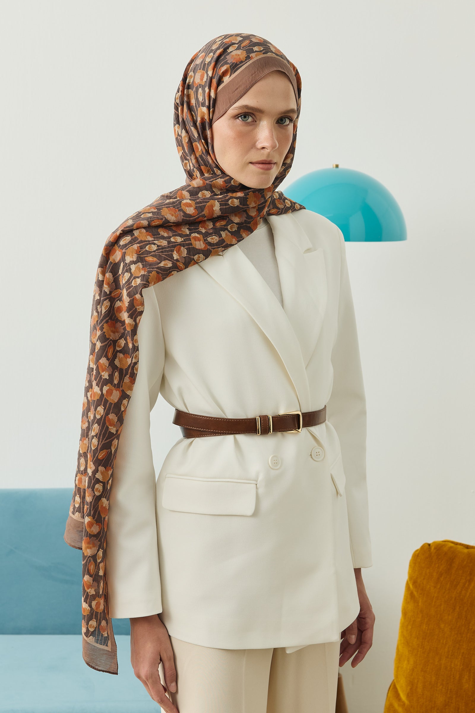 İnce ve tekrar eden floral detayları sayesinde şala hareketli ama dengeli bir görünüm kazandırırken, sade kombinleri güçlü bir şekilde tamamlar.