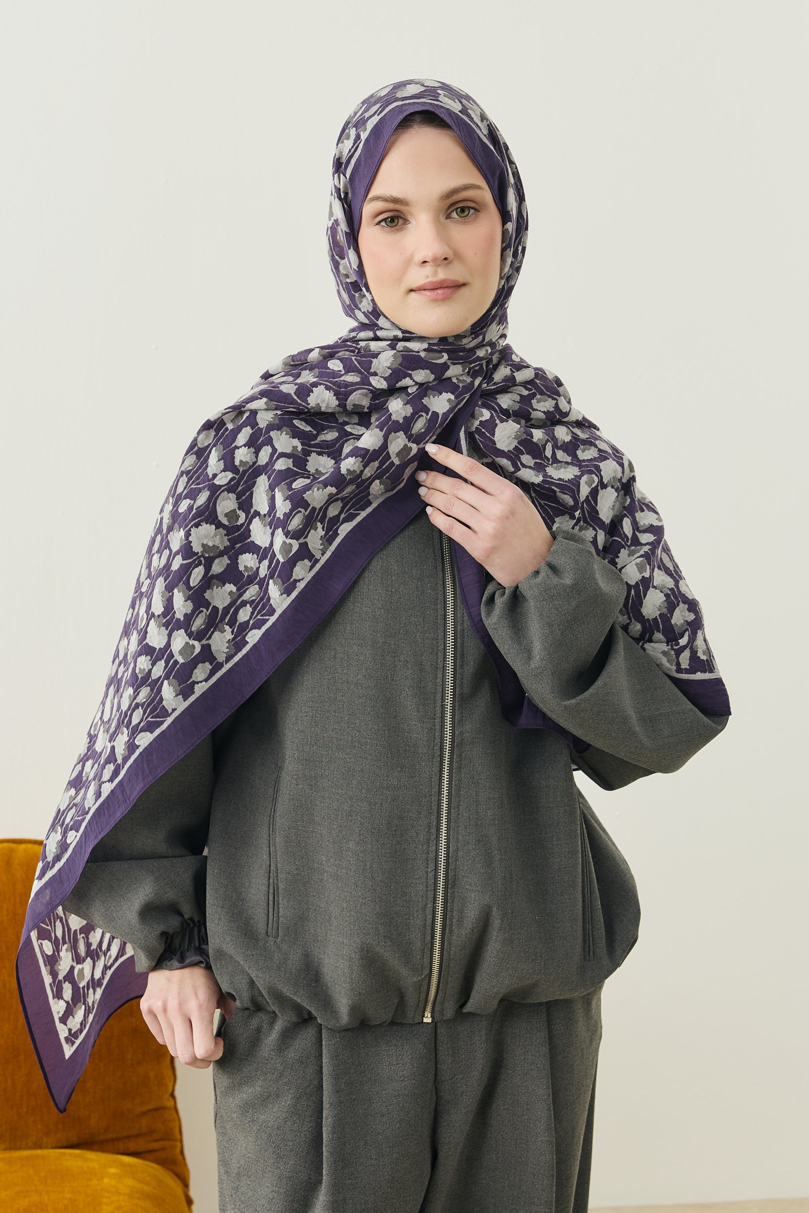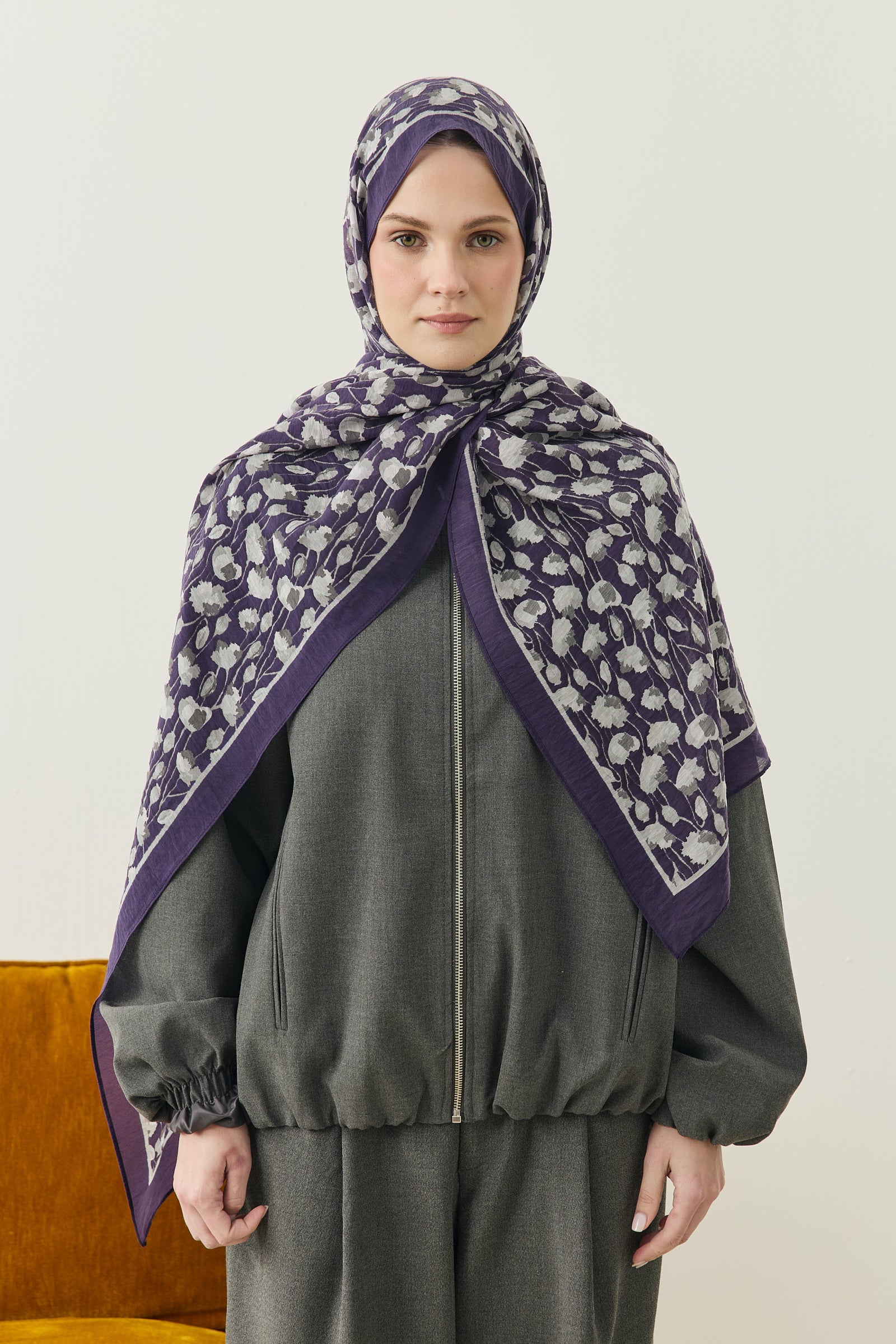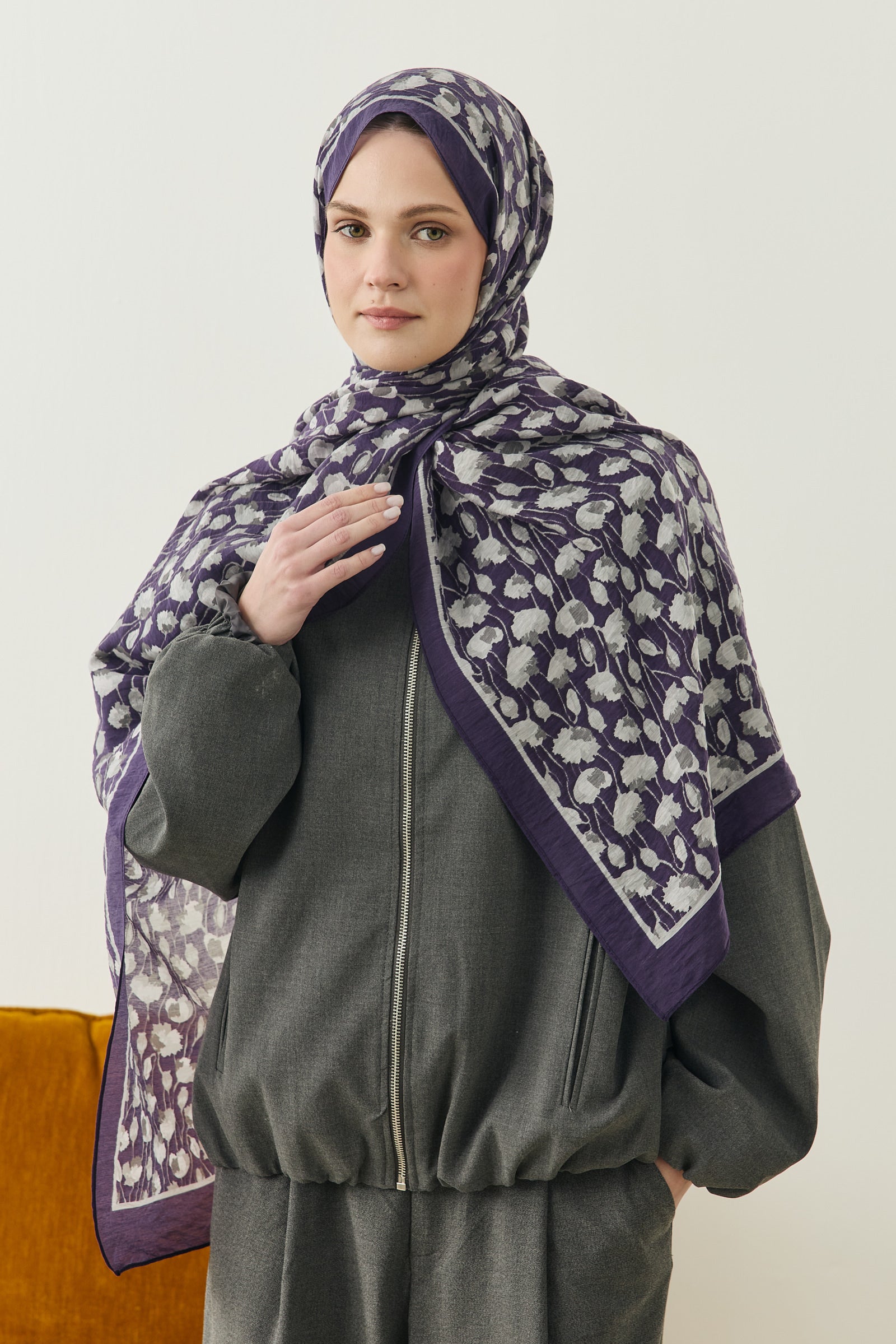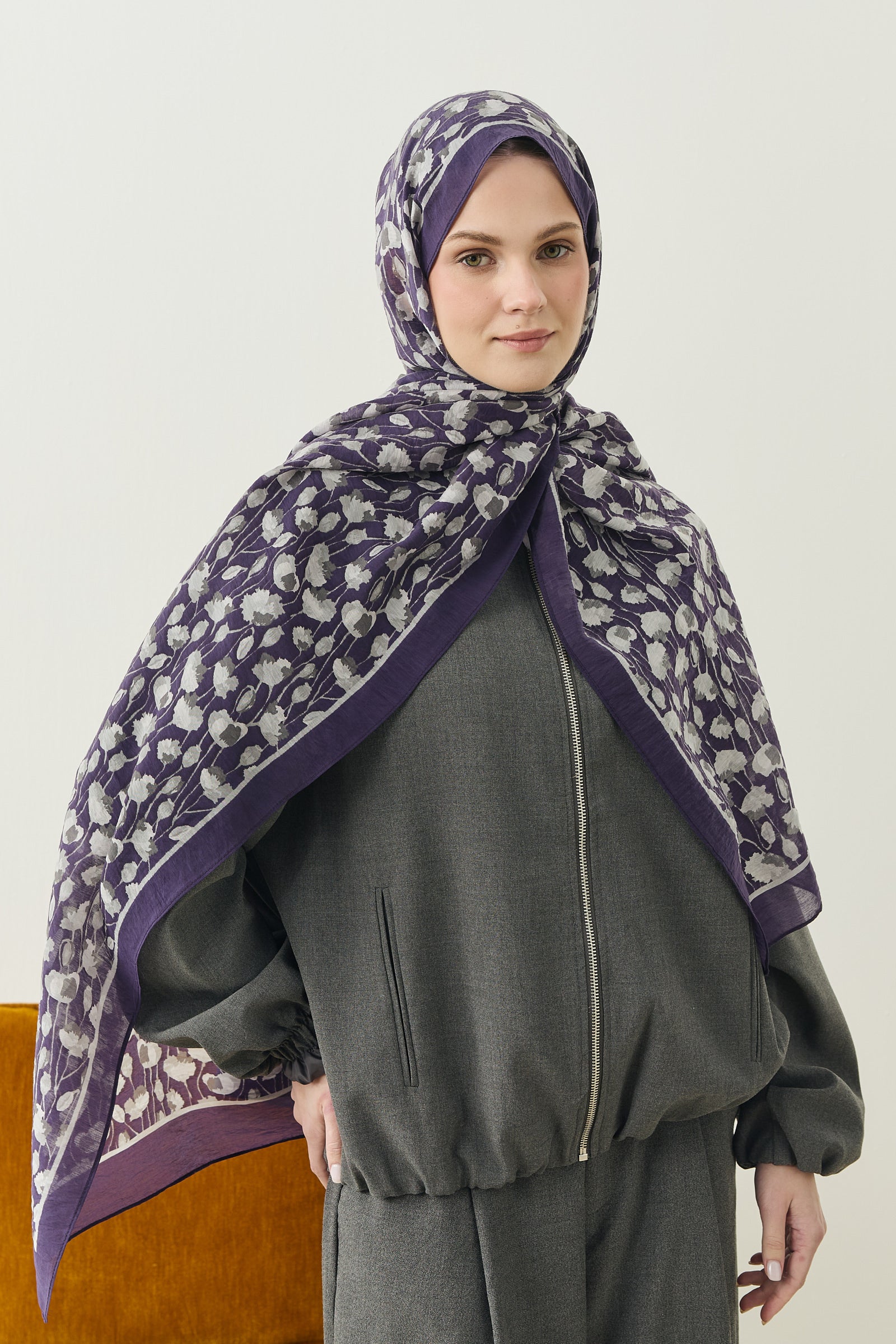 İnce ve tekrar eden floral detayları sayesinde şala hareketli ama dengeli bir görünüm kazandırırken, sade kombinleri güçlü bir şekilde tamamlar.