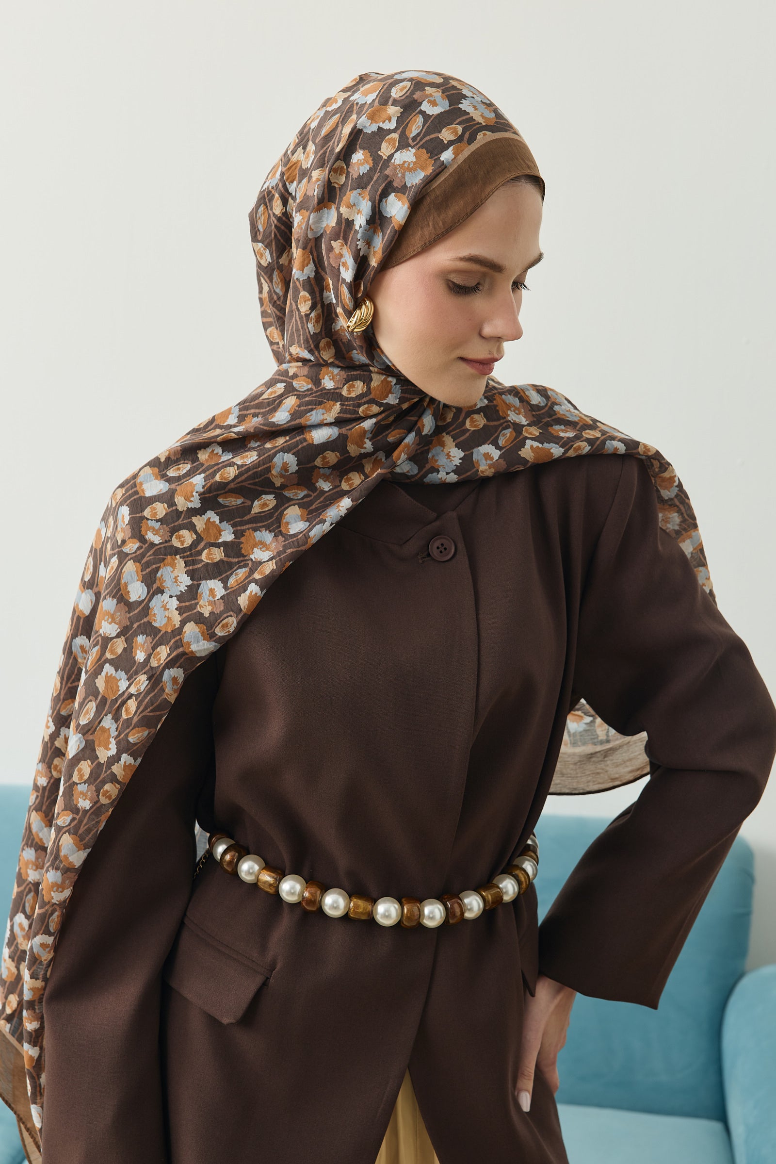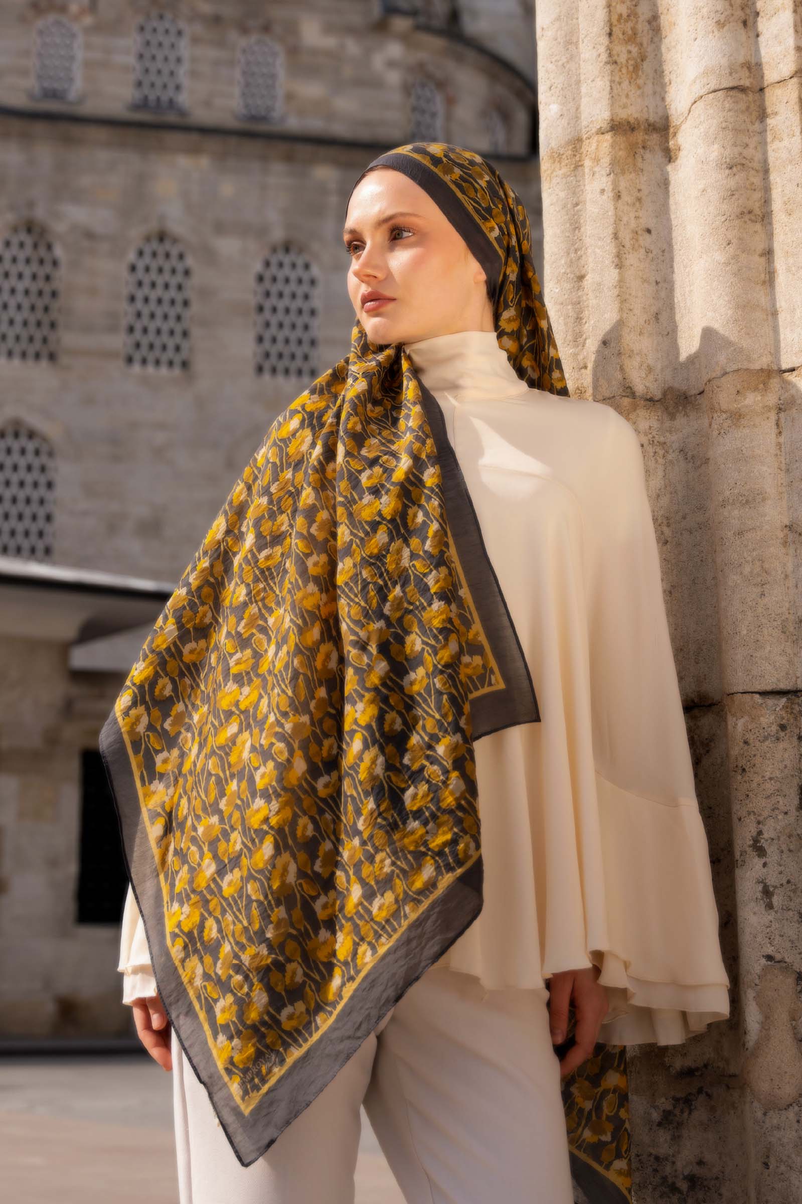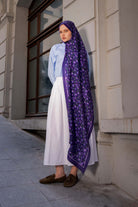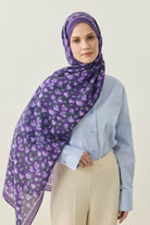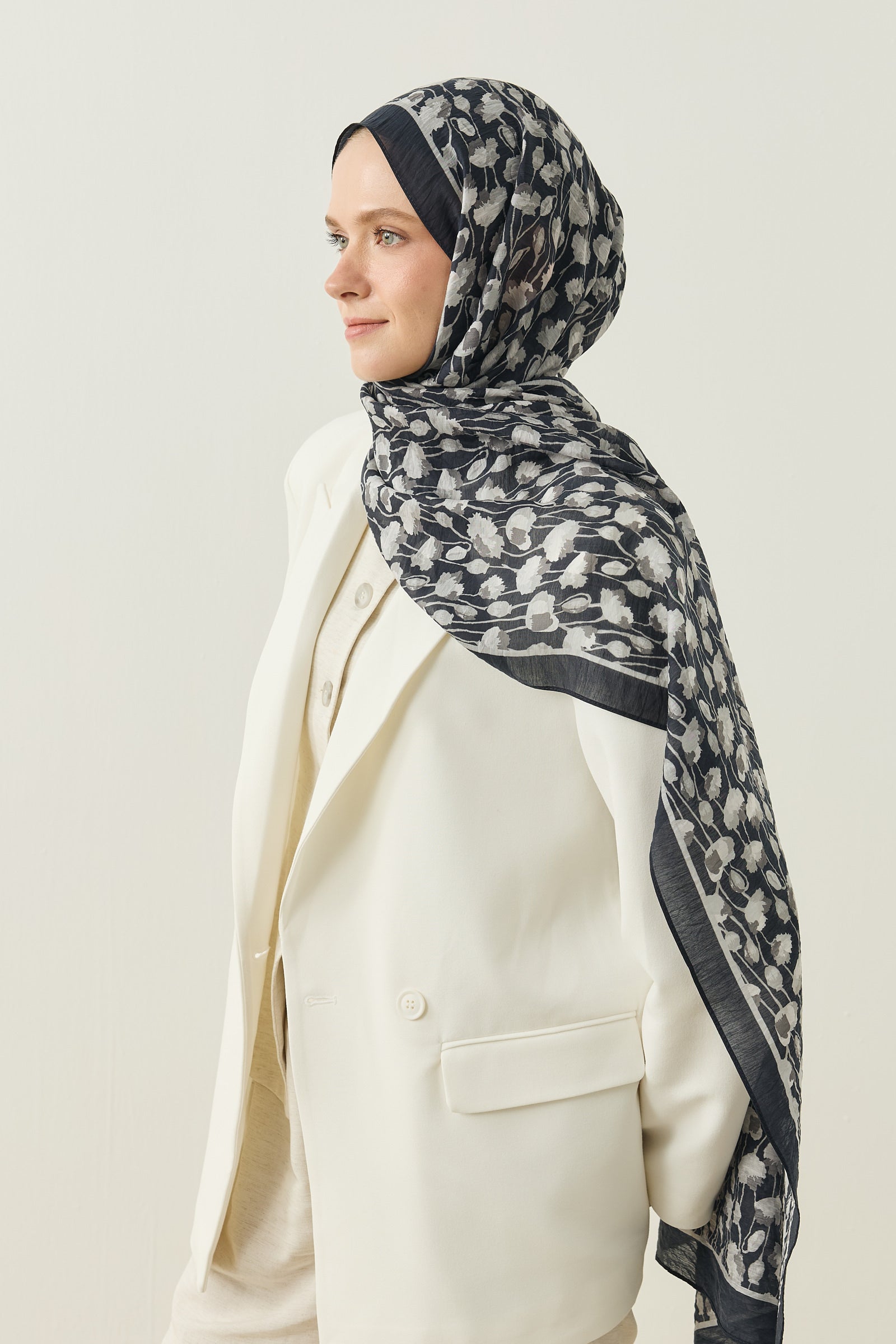 İnce ve tekrar eden floral detayları sayesinde şala hareketli ama dengeli bir görünüm kazandırırken, sade kombinleri güçlü bir şekilde tamamlar.