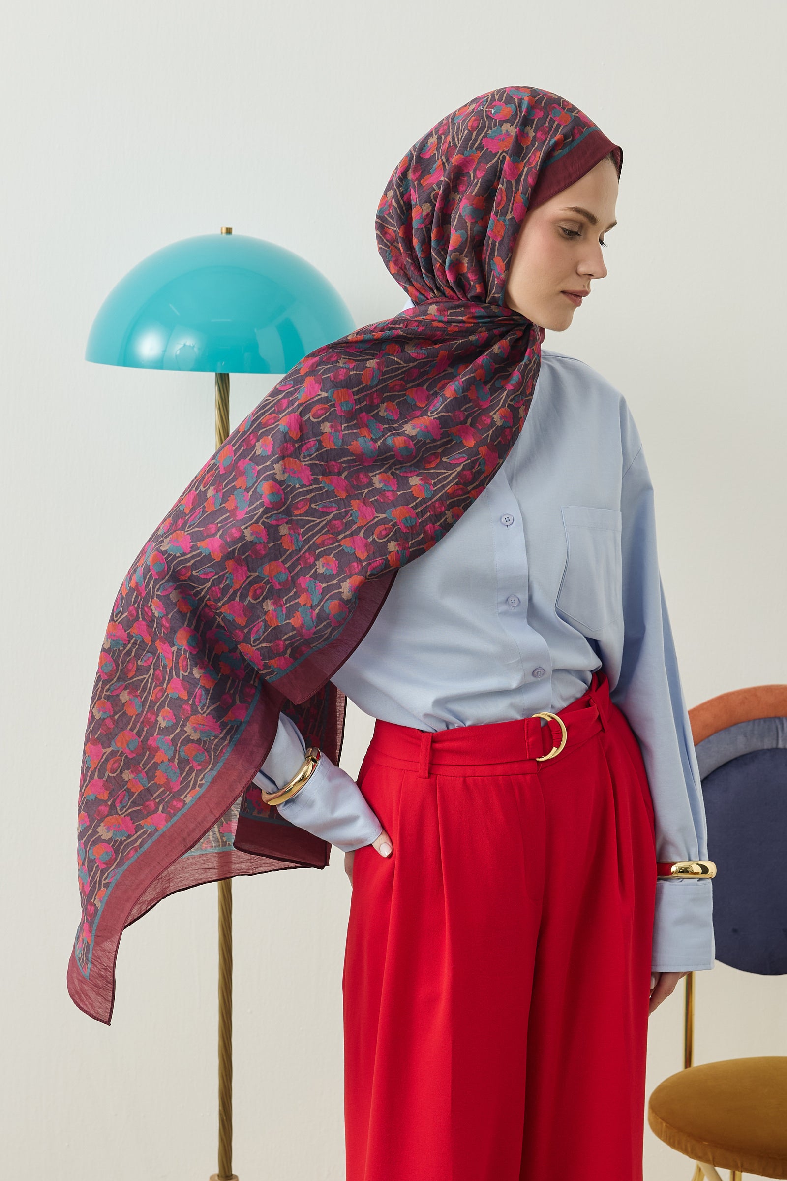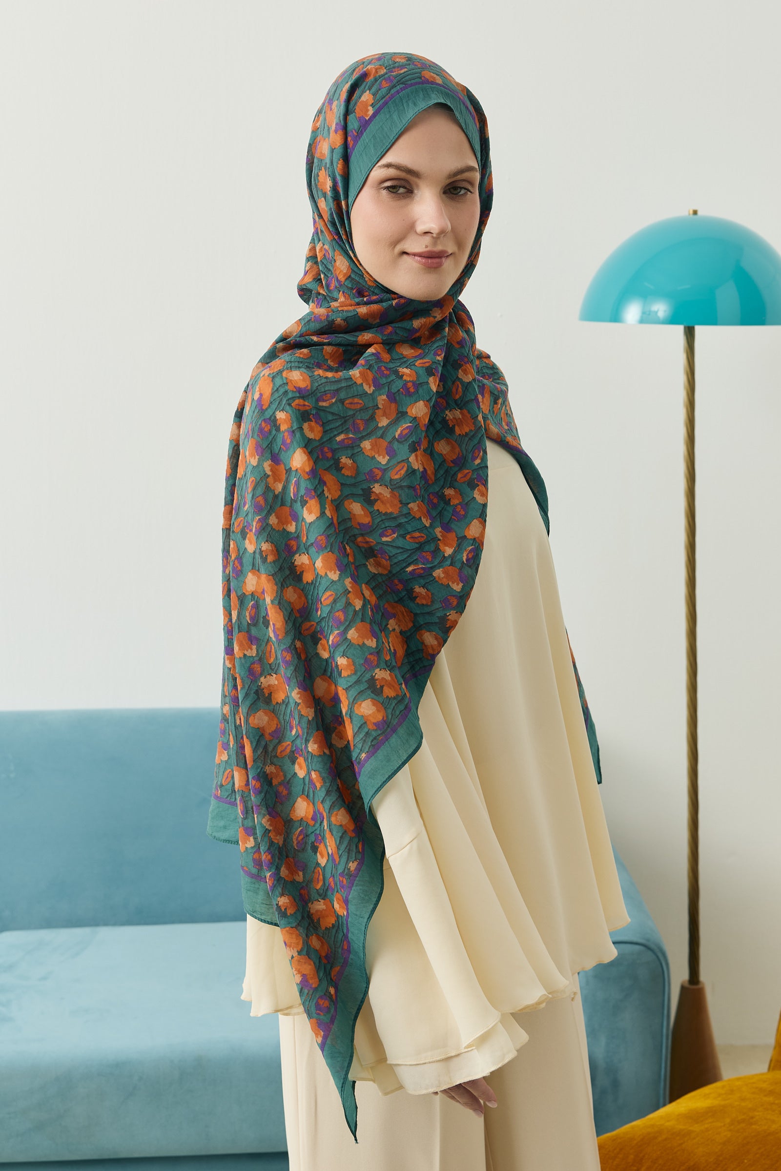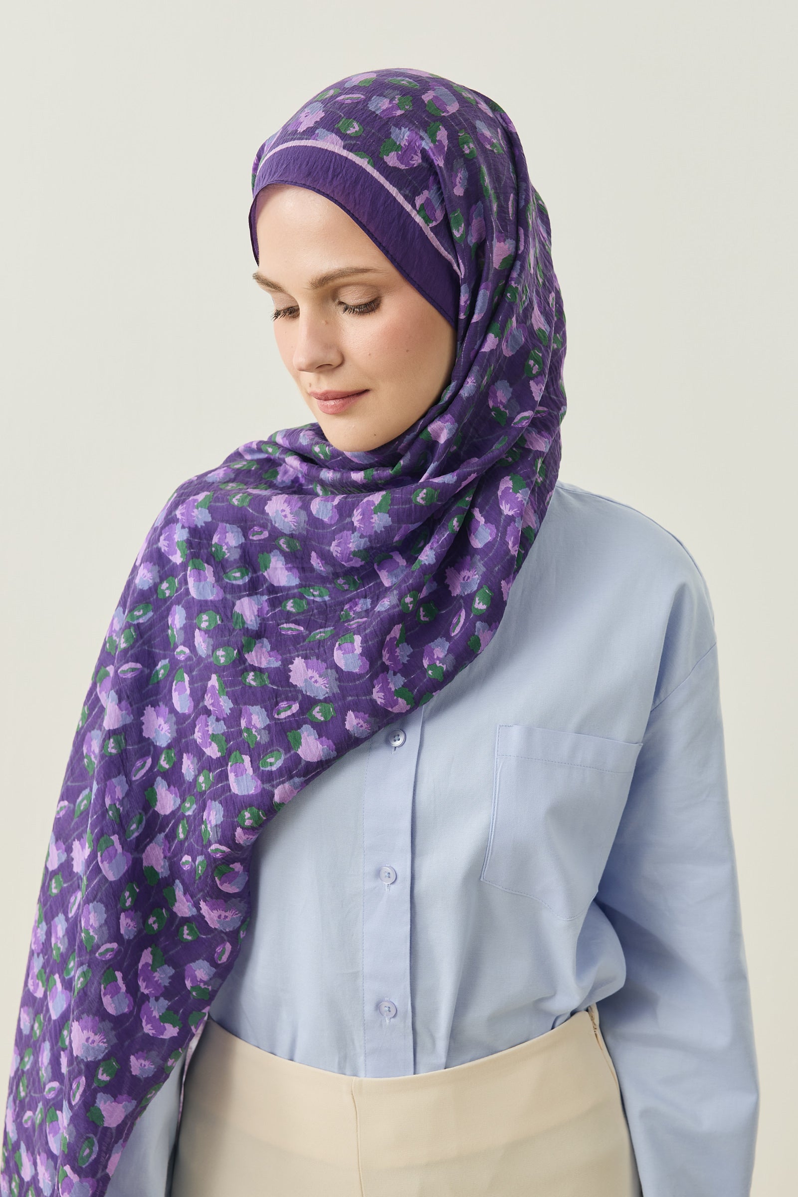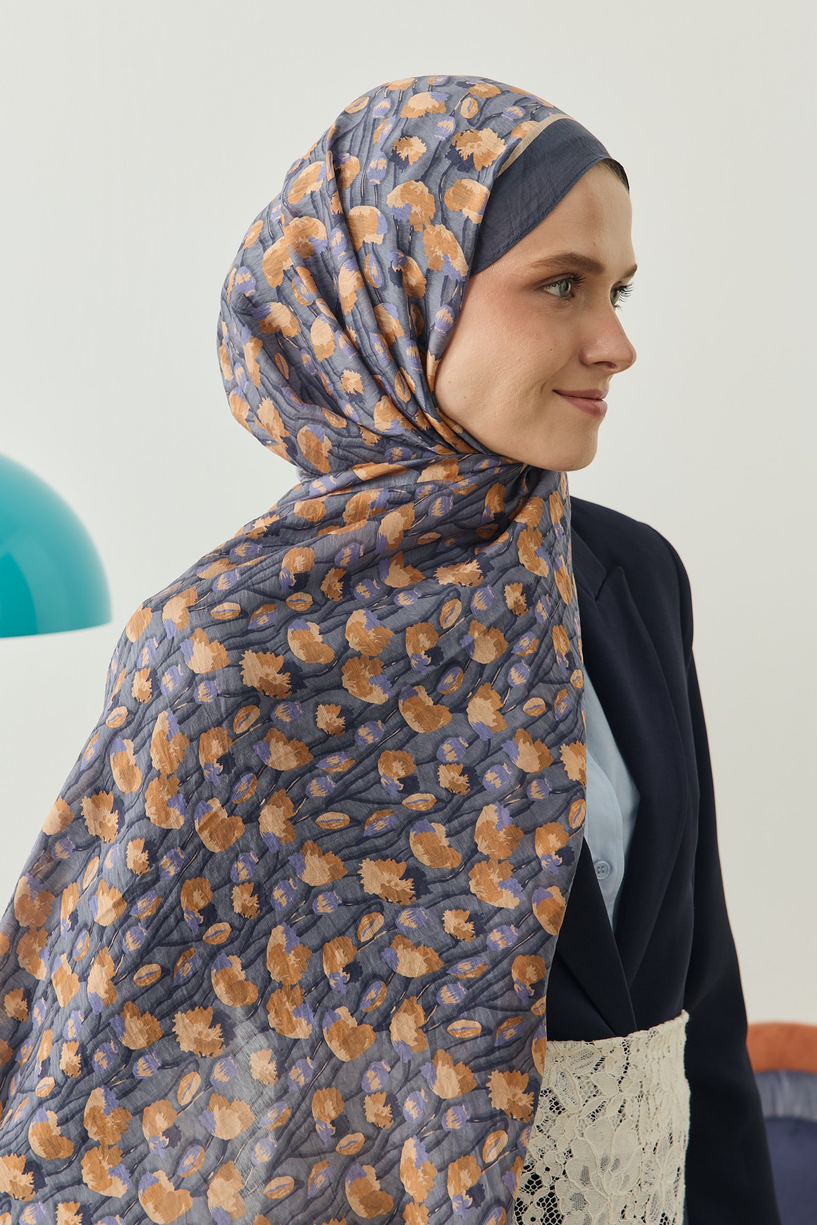 İnce ve tekrar eden floral detayları sayesinde şala hareketli ama dengeli bir görünüm kazandırırken, sade kombinleri güçlü bir şekilde tamamlar.