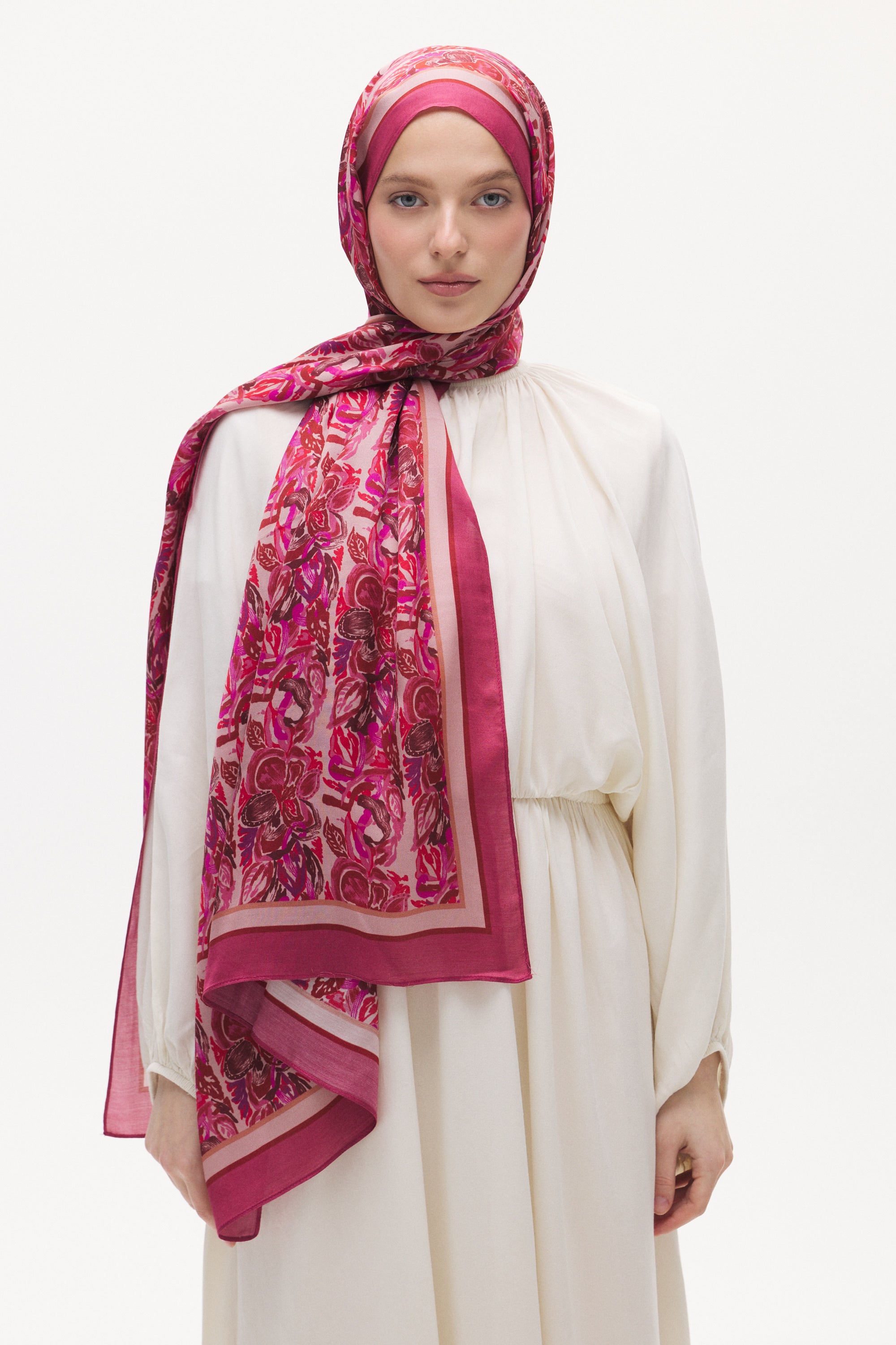 Armony desenin akışkan çiçek ve yaprak formu şala hareketli ve dengeli bir görünüm kazandırır. Doğal ve sanatsal çizgileri sayesinde sade kombinleri tamamlayan zarif bir dokunuş sağlar.