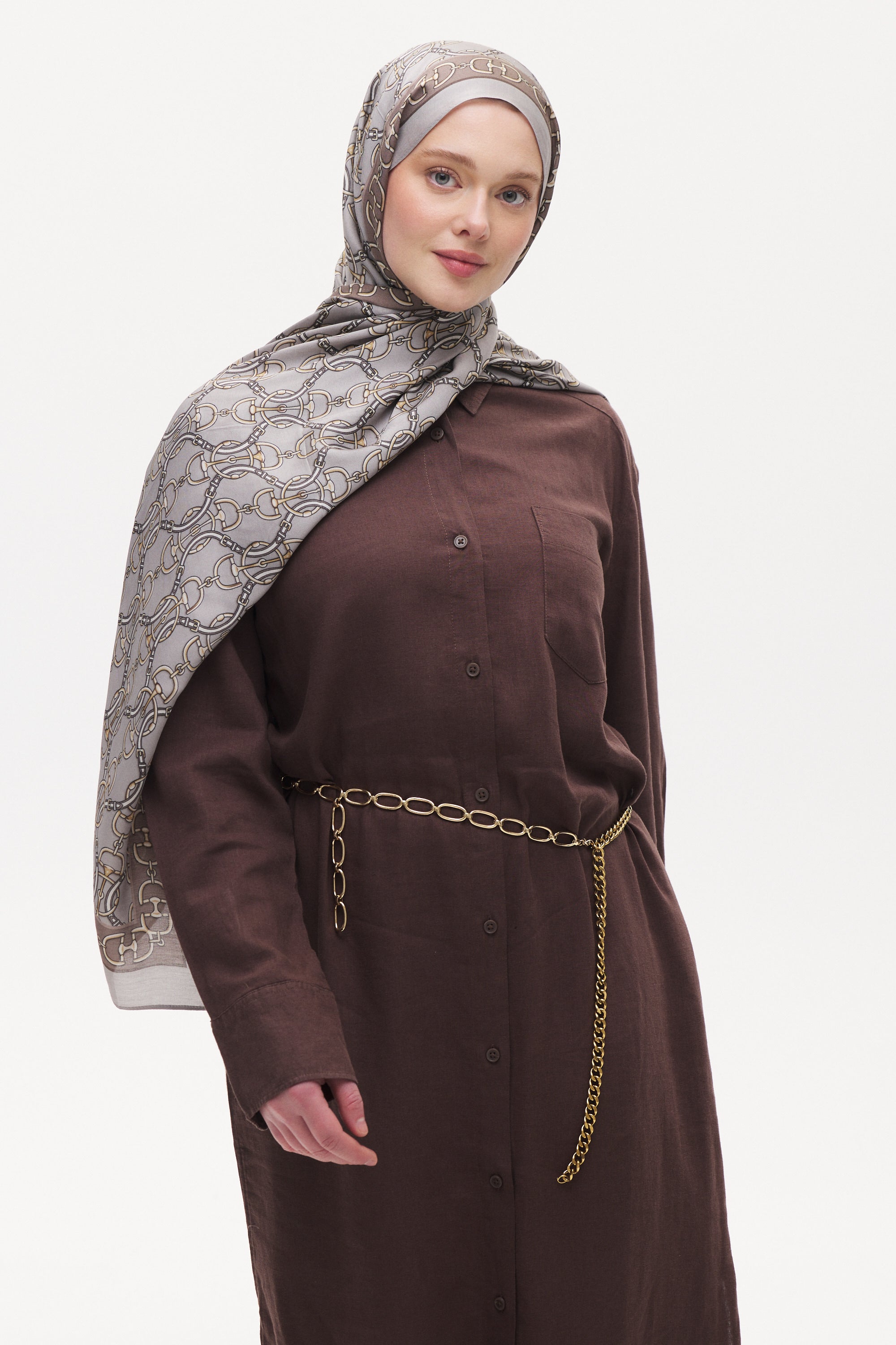 Cavallo desenin zarif zincir ve aksesuar formu şala güçlü ve klasik bir görünüm kazandırır. Dengeli desen yapısı sayesinde sade kombinleri tamamlayan şık ve zamansız bir stil sunar.