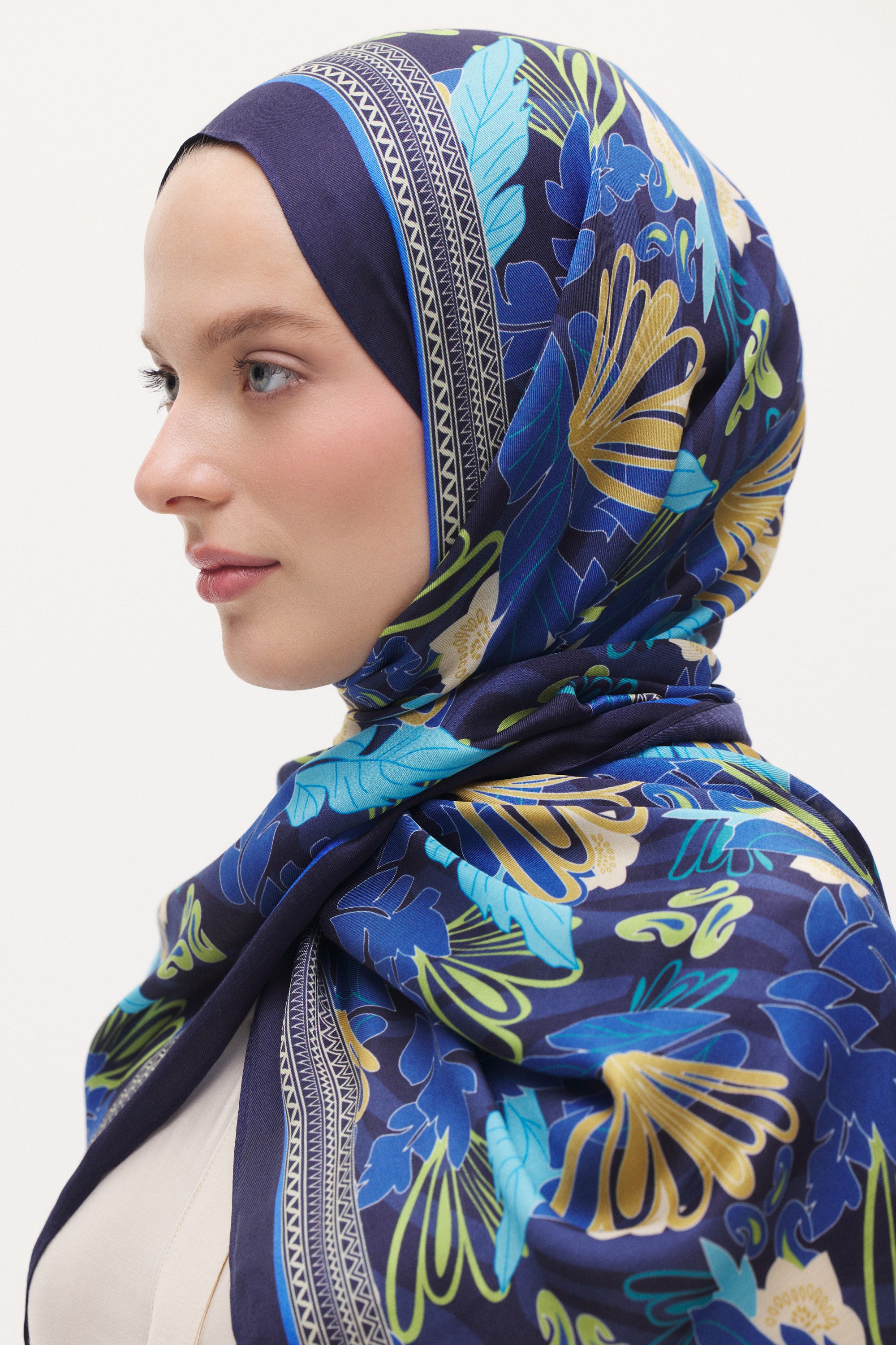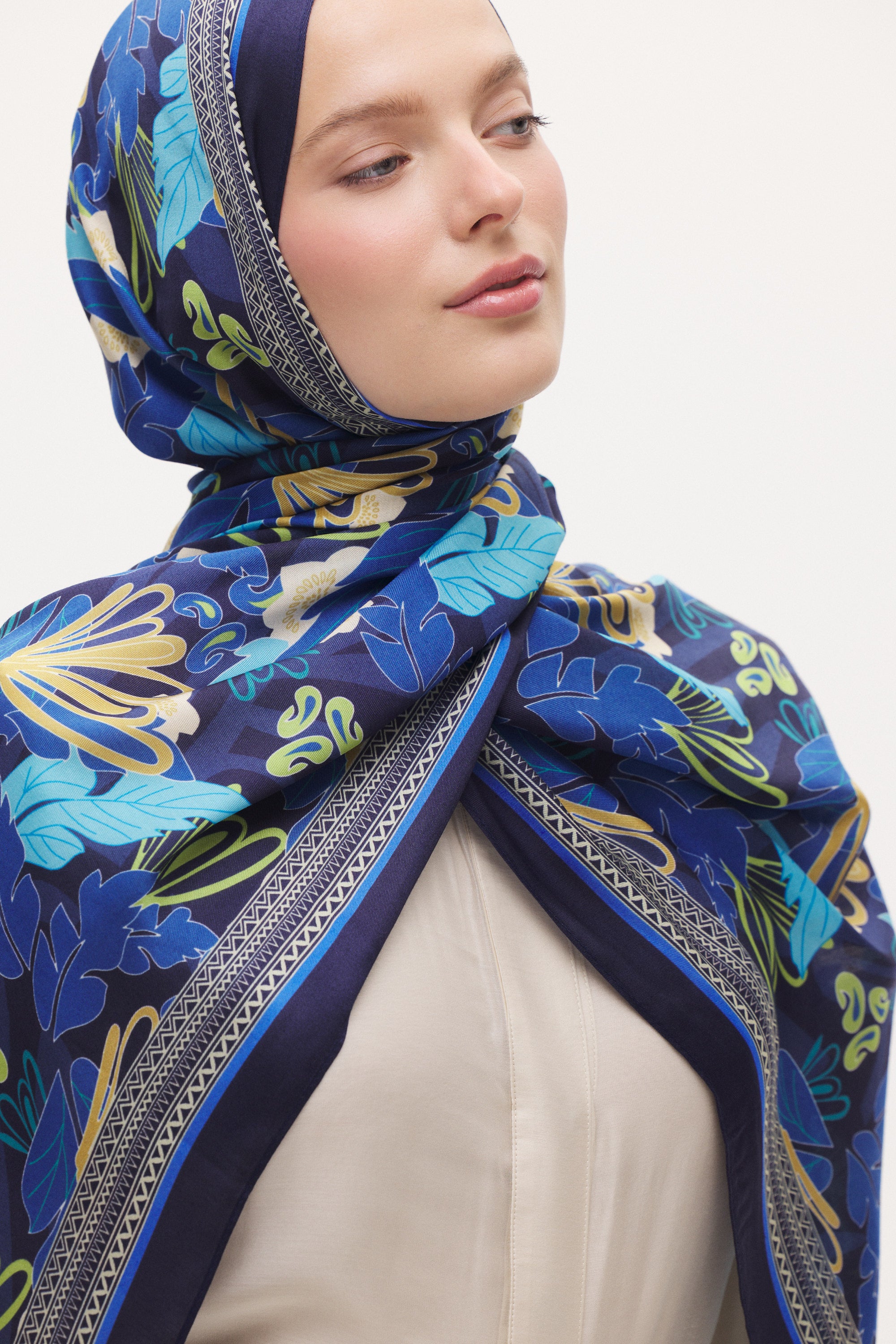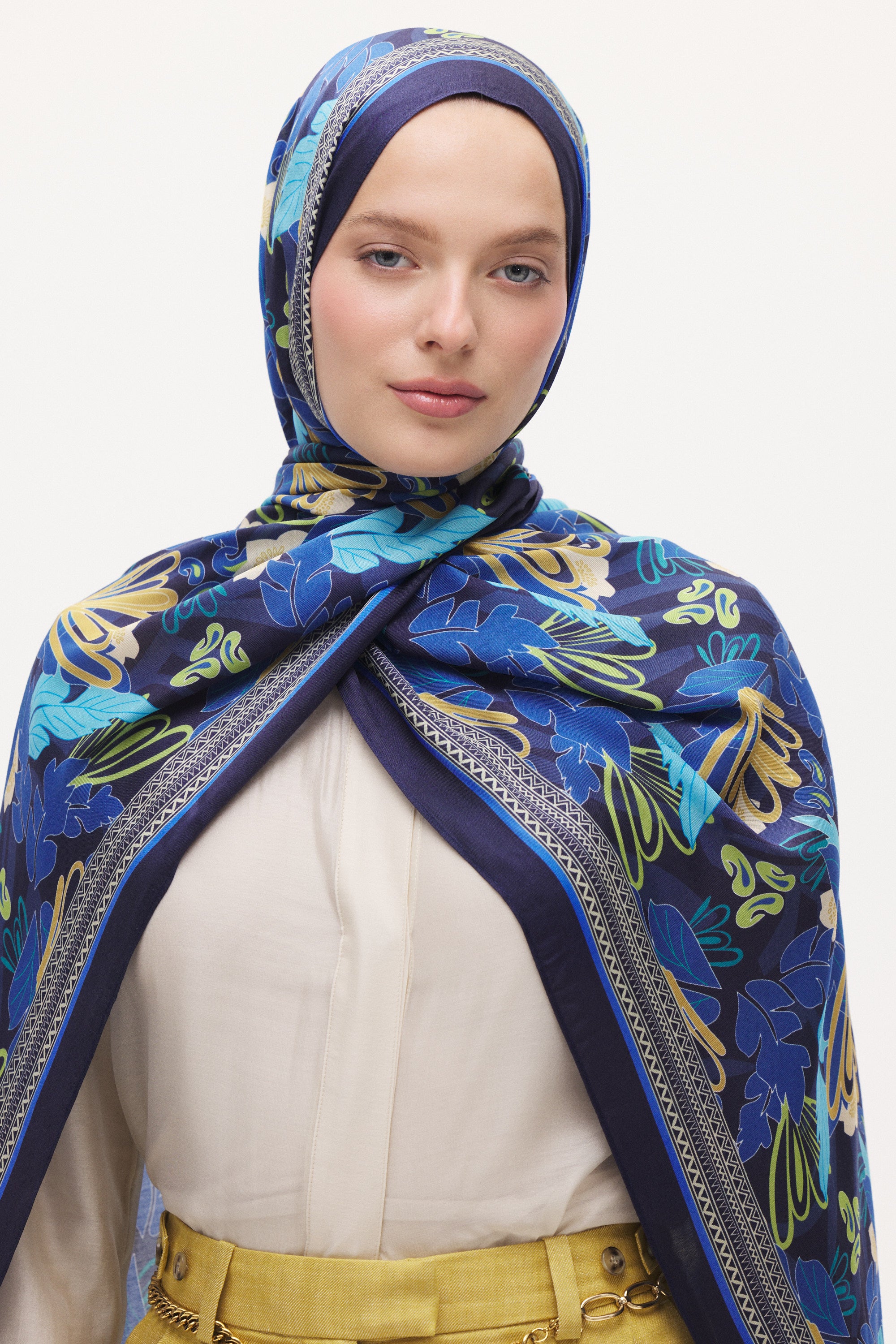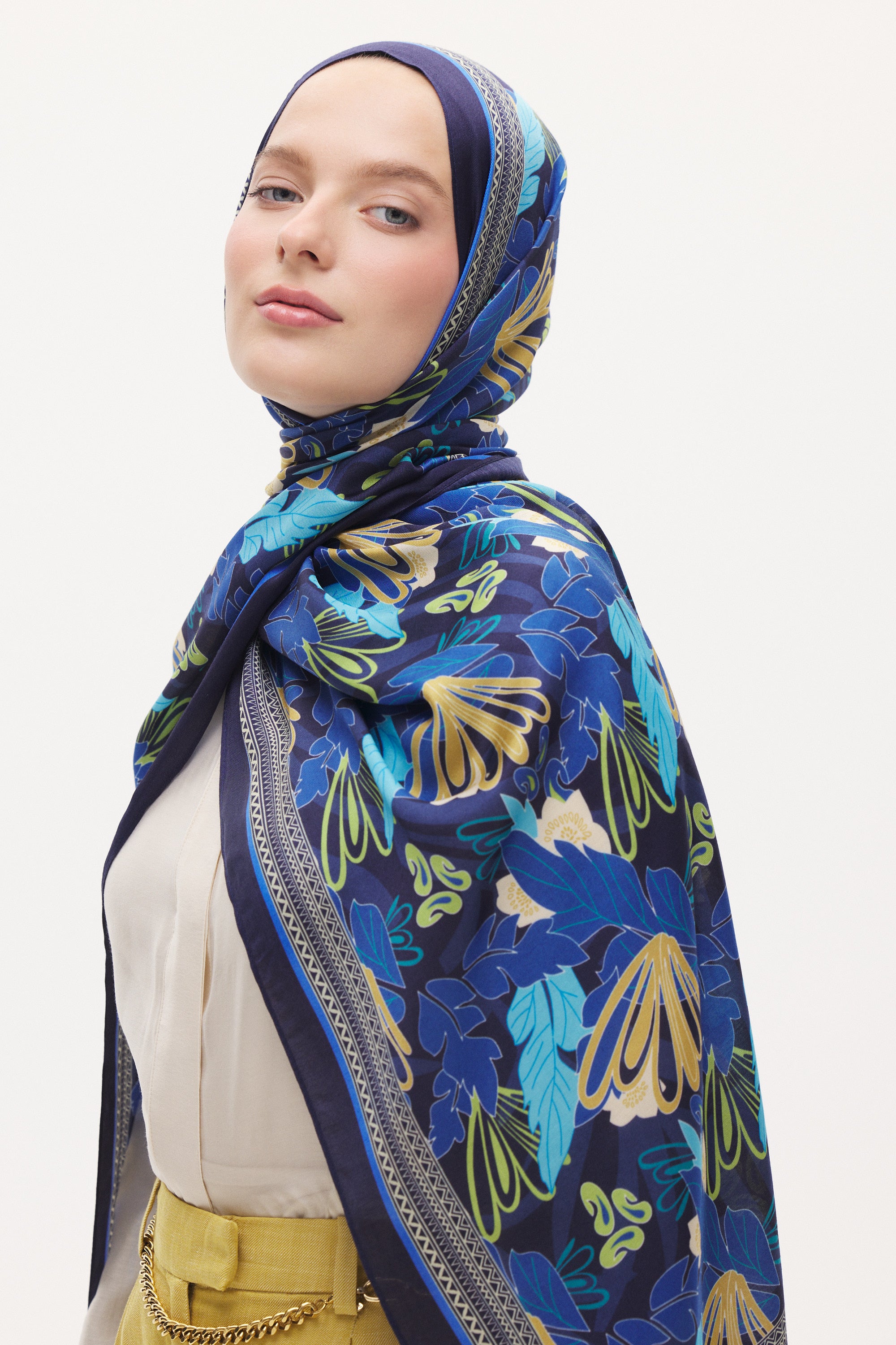 Floren desenin zarif çiçek ve yaprak formu şala hareketli ve dengeli bir görünüm kazandırır. Akıcı çizgileri sayesinde sert bir görünüm oluşturmaz; sade kombinleri tamamlayan şık ve doğal bir dokunuş sağlar.
