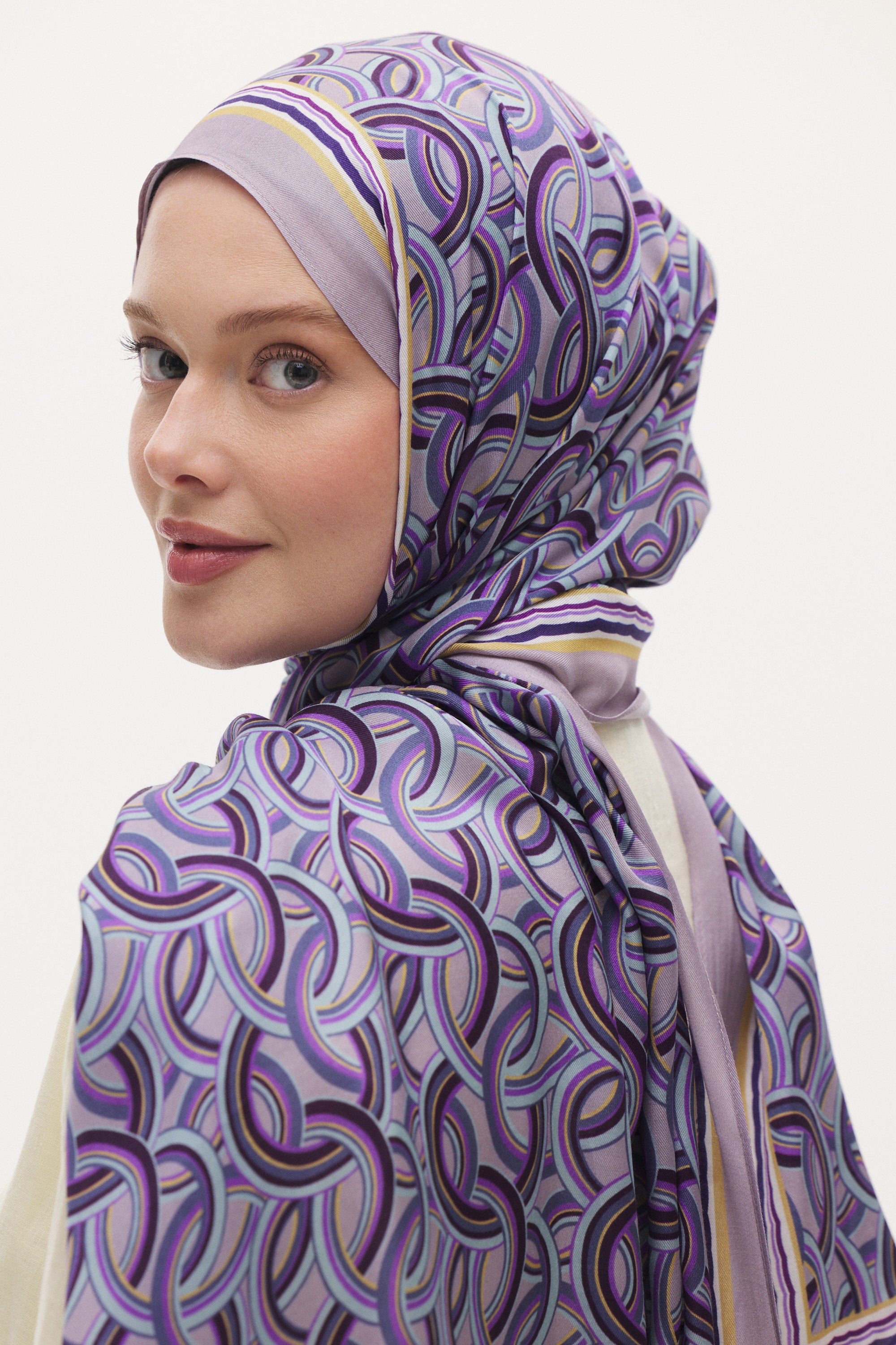 İç içe geçen halka formundan oluşan desen yapısı, şala dengeli ve modern bir görünüm kazandırır. Akıcı çizgiler sayesinde sert bir görünüm oluşturmaz; sade kombinleri tamamlayan zarif bir dokunuş sağlar.